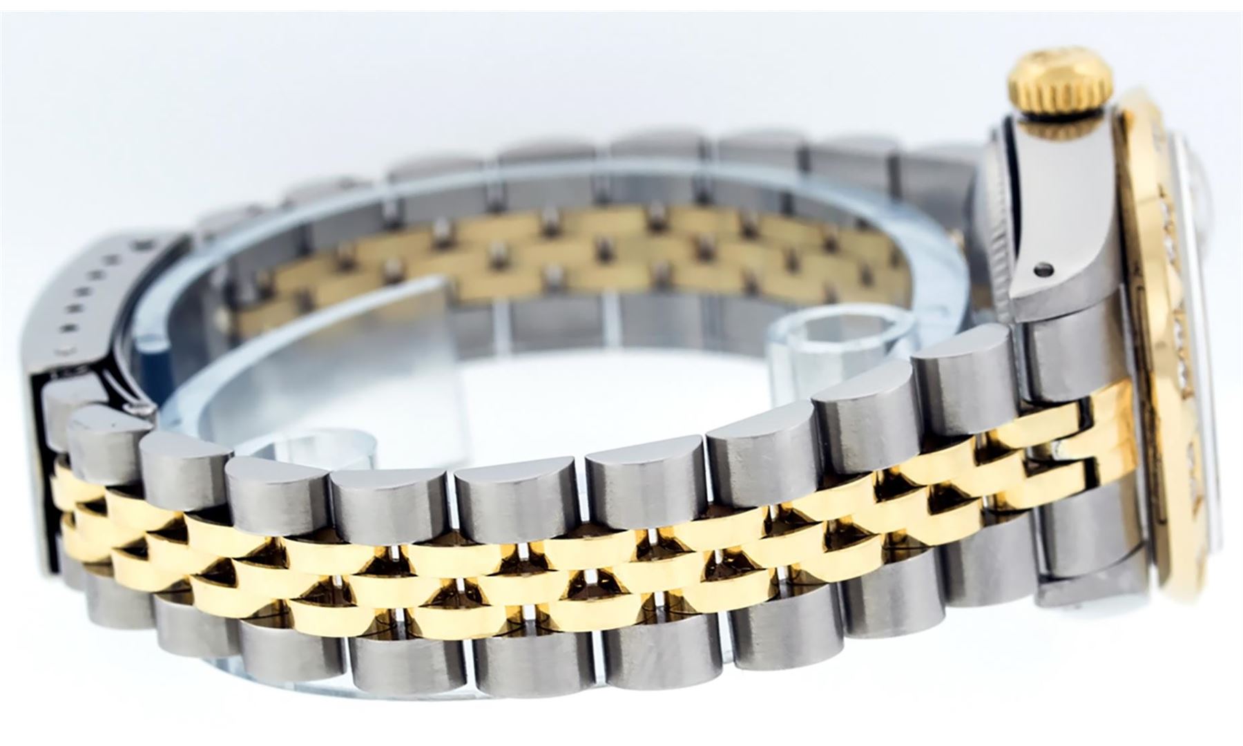 One Ladies Two Tone Rolex Datejust Polished, Serviced & Electronically Tested, Yellow Gold & Stainless Steel Case: 26mm, Yellow Gold Crown, Custom Bezel: New 18K Yellow Gold Pyramid Diamond Bezel, Diamond Count: 24 Diamonds In Bezel. Total Weight .50 Carat, Clarity: SI-VS, Color: G to H. Custom Crystal: New Scratch Resistant Synthetic Sapphire Cyclops Lens. Custom Hands: New Luminescent Hands. Movement: Automatic Winding Movement. Custom Dial: Slate Grey With Roman Hour Markers. Date Window: 3 O'Clock Position Date Display, Model: Datejust. Condition: G-6 Extra Fine The Watch Is In Very Good Condition Free Of All Scratches And Dents. Bracelet: Two Tone Yellow Gold & Stainless Steel Jubilee. Bright Polish. 6.0 Inch Length, Adjustable. Standard Clasp, With Rolex Logo. This Watch Has Been Serviced Time Tested And Is In Excellent Condition It Is Free Of All Scratches And Dents.