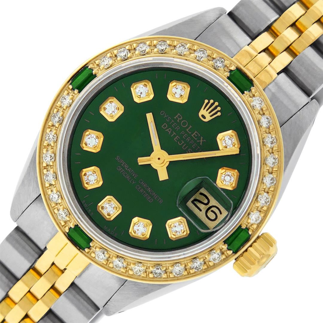 One Ladies Two Tone Rolex Datejust Polished, Serviced & Electronically Tested, Yellow Gold & Stainless Steel Case: 26mm, Yellow Gold Crown, Custom Bezel: New 18K Yellow Gold Emerald Beadset Diamond Bezel, Diamond + Gem Count: 28 Diamonds + 4 Emeralds Total Weight .70 Carat, Clarity: SI-VS, Color: G to H. Custom Crystal: New Scratch Resistant Synthetic Sapphire Cyclops Lens. Custom Hands: New Luminescent Hands. Movement: Automatic Winding Movement. Custom Dial: Green Dial Set With Diamond Hour Markers & Dash Track, Diamond Count: 10 Diamonds in Dial, G To H In Color, SI-VS Clarity. Date Window: 3 O'Clock Position Date Display, Model: Datejust, Condition: G-6 Extra Fine. Bracelet: Two Tone Yellow Gold & Stainless Steel Jubilee. Bright Polish. 6.0 Inch Length, Adjustable. Standard Clasp, With Rolex Logo. This Watch Has Been Serviced Time Tested And Is In Excellent Condition It Is Free Of All Scratches And Dents.