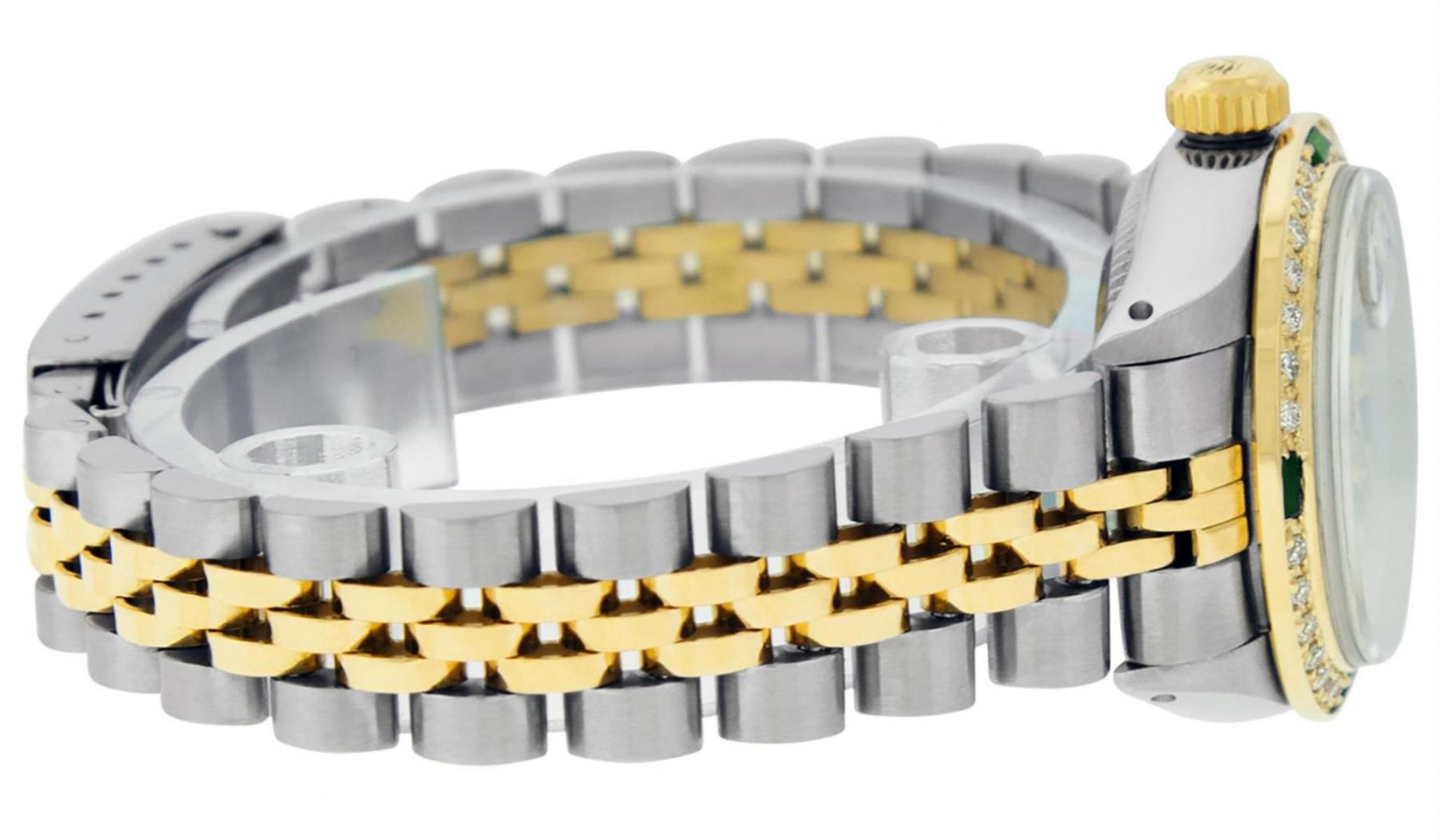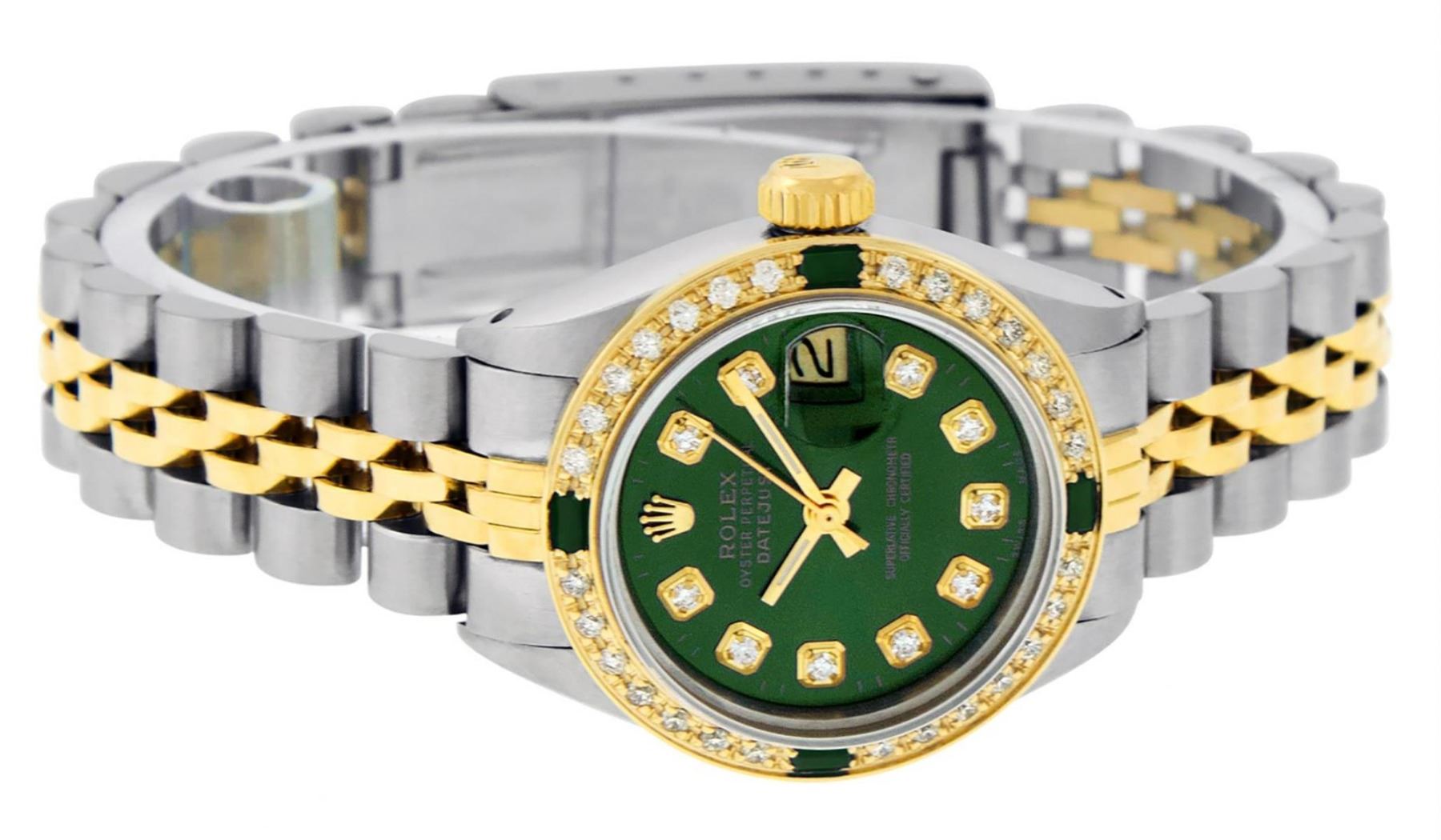 One Ladies Two Tone Rolex Datejust Polished, Serviced & Electronically Tested, Yellow Gold & Stainless Steel Case: 26mm, Yellow Gold Crown, Custom Bezel: New 18K Yellow Gold Emerald Beadset Diamond Bezel, Diamond + Gem Count: 28 Diamonds + 4 Emeralds Total Weight .70 Carat, Clarity: SI-VS, Color: G to H. Custom Crystal: New Scratch Resistant Synthetic Sapphire Cyclops Lens. Custom Hands: New Luminescent Hands. Movement: Automatic Winding Movement. Custom Dial: Green Dial Set With Diamond Hour Markers & Dash Track, Diamond Count: 10 Diamonds in Dial, G To H In Color, SI-VS Clarity. Date Window: 3 O'Clock Position Date Display, Model: Datejust, Condition: G-6 Extra Fine. Bracelet: Two Tone Yellow Gold & Stainless Steel Jubilee. Bright Polish. 6.0 Inch Length, Adjustable. Standard Clasp, With Rolex Logo. This Watch Has Been Serviced Time Tested And Is In Excellent Condition It Is Free Of All Scratches And Dents.