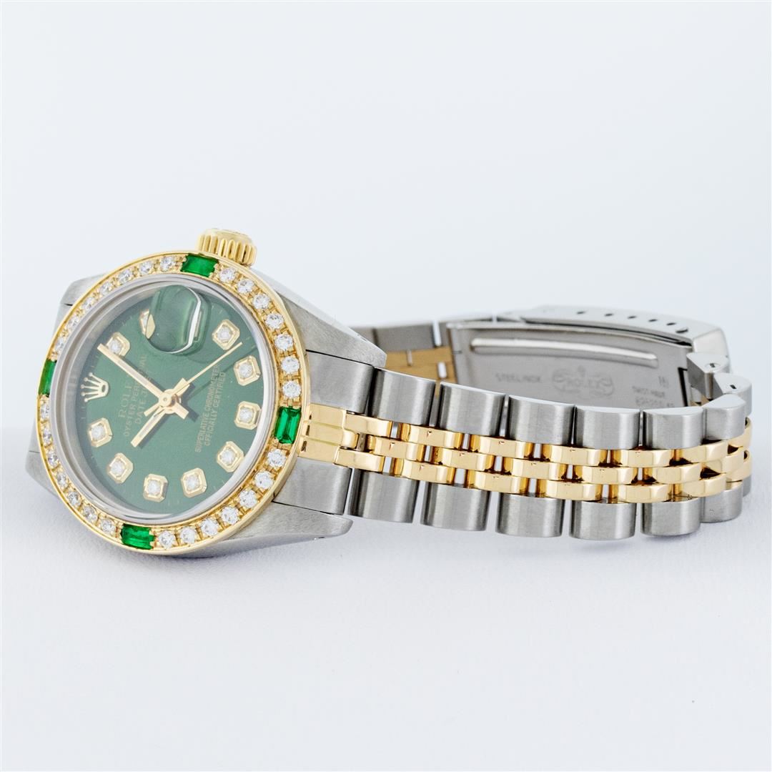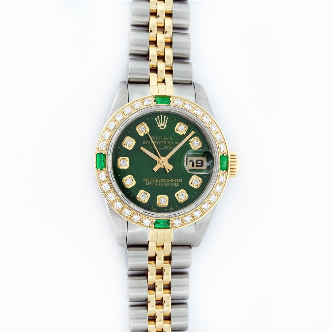 One Ladies Pre Owned Two Tone Rolex Datejust Polished, Serviced & Electronically Tested, Yellow Gold & Stainless Steel Case: 26mm, Yellow Gold Crown, Custom Bezel: New 18K Yellow Gold Emerald Beadset Diamond Bezel, Diamond + Gem Count: 28 Diamonds + 4 Eme