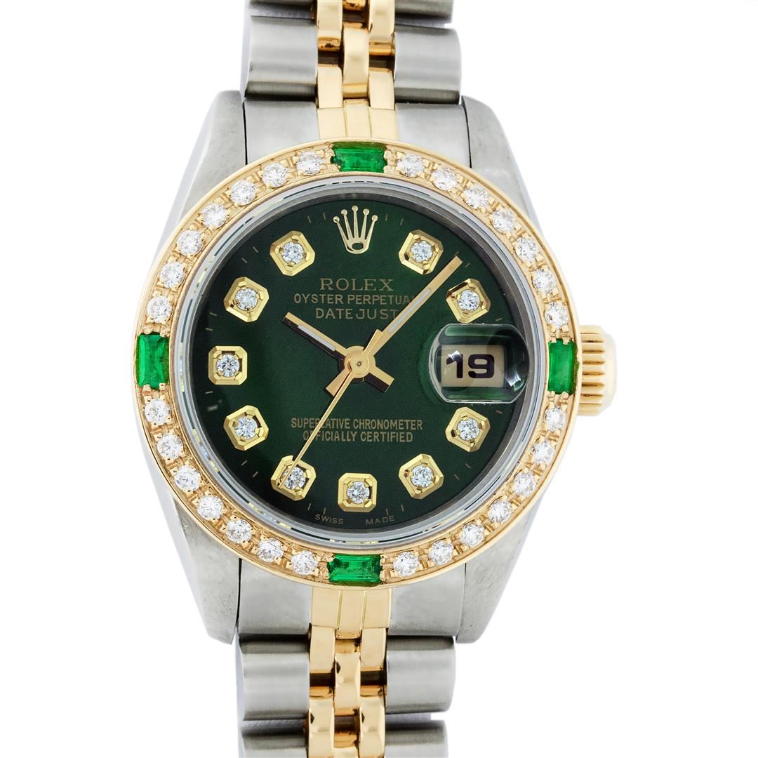 One Ladies Pre Owned Two Tone Rolex Datejust Polished, Serviced & Electronically Tested, Yellow Gold & Stainless Steel Case: 26mm, Yellow Gold Crown, Custom Bezel: New 18K Yellow Gold Emerald Beadset Diamond Bezel, Diamond + Gem Count: 28 Diamonds + 4 Emeralds, Clarity: SI-VS, Color: G to H. Custom Crystal: New Sapphire With Date Window. Custom Hands: New Luminescent Hands. Rolex Movement: Automatic Winding Movement. Custom Dial: Refinished To Green With Custom Added Diamonds, Diamond Count: 10 Diamonds in Dial, G To H In Color, SI-VS Clarity. Date Window: 3 Oclock Position Date Display, Model: Datejust, Condition: G-6 Extra Fine. Rolex Bracelet: Two Tone Yellow Gold & Stainless Steel Jubilee. Bright Polish. 6.0 Inch Length, Adjustable. Standard Clasp, With Rolex Logo. This Watch Has Been Serviced Time Tested And Is In Excellent Condition It Is Free Of All Scratches And Dents.