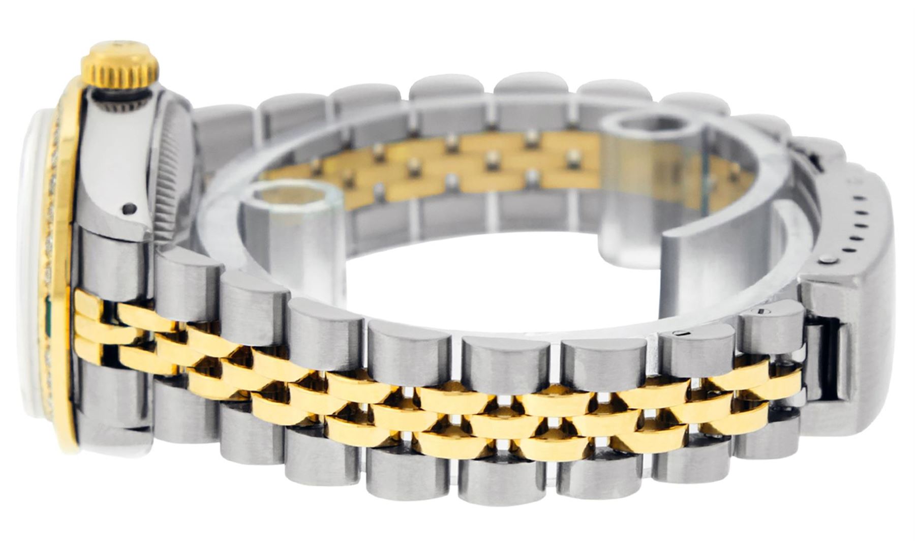 One Ladies Pre Owned Two Tone Rolex Datejust Polished, Serviced & Electronically Tested, Yellow Gold & Stainless Steel Case: 26mm, Yellow Gold Crown, Custom Bezel: New 18K Yellow Gold Emerald Beadset Diamond Bezel, Diamond + Gem Count: 28 Diamonds + 4 Eme