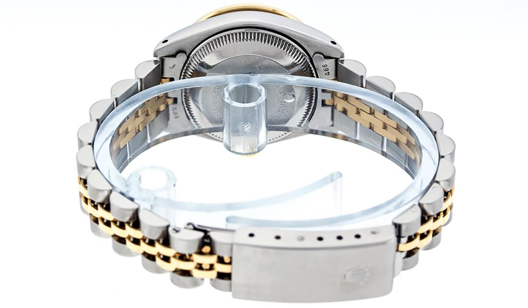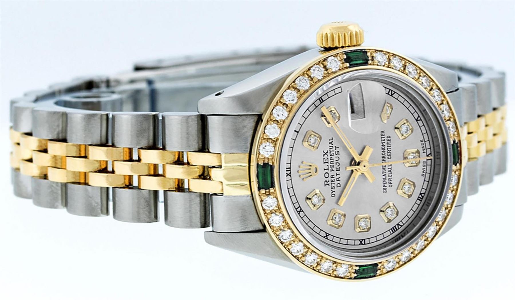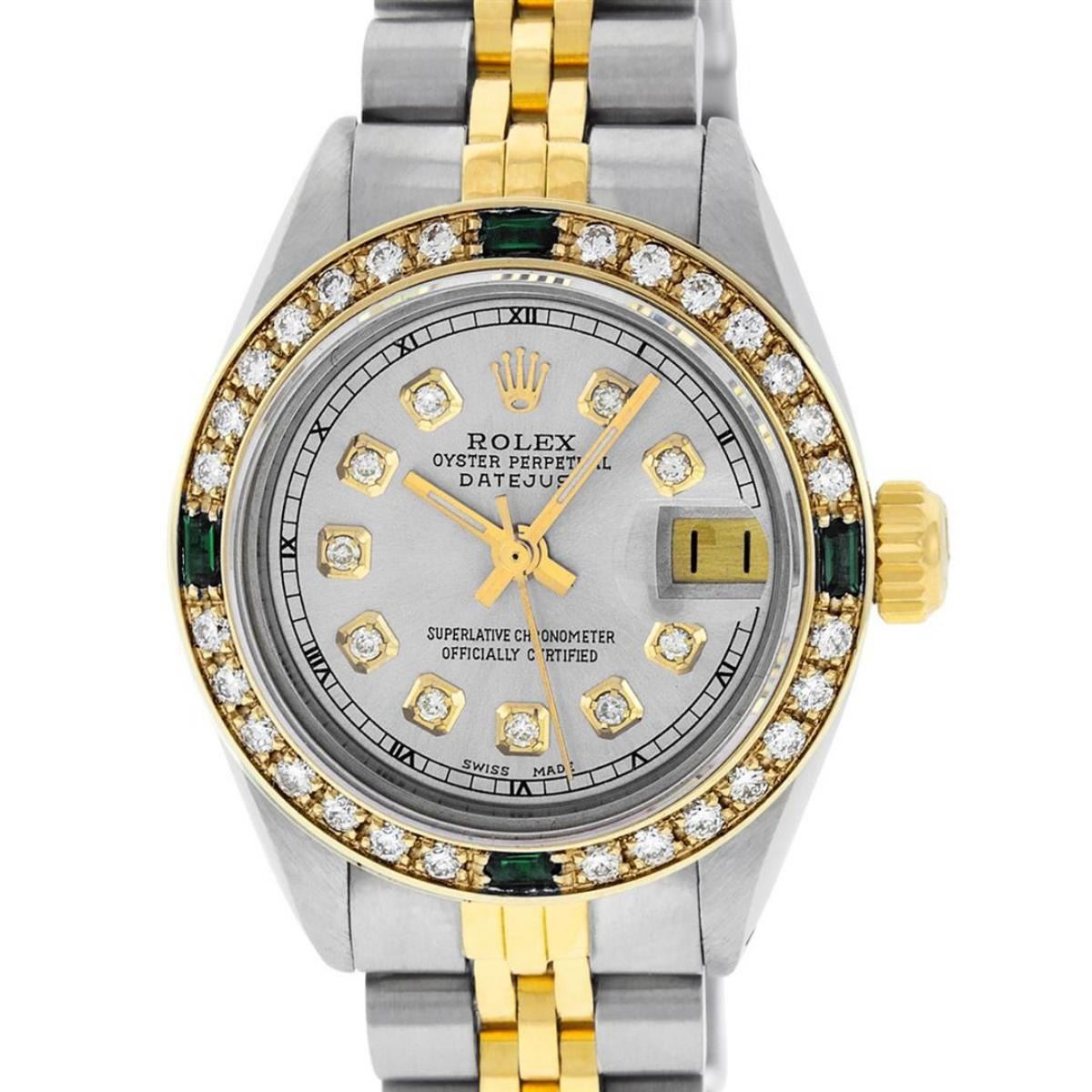 One Ladies Two Tone Rolex Datejust Polished, Serviced & Electronically Tested, Yellow Gold & Stainless Steel Case: 26mm, Yellow Gold Crown, Custom Bezel: New 18K Yellow Gold Emerald Beadset Diamond Bezel, Diamond + Gem Count: 28 Diamonds + 4 Emeralds Total Weight .70 Carat, Clarity: SI-VS, Color: G to H. Custom Crystal: New Scratch Resistant Synthetic Sapphire Cyclops Lens. Custom Hands: New Luminescent Hands. Movement: Automatic Winding Movement. Custom Dial: Grey With Diamond Hour Markers & Roman Track, Diamond Count: 10 Diamond On Dial, G To H In Color, SI-VS Clarity. Date Window: 3 O'Clock Position Date Display, Model: Datejust, Condition: G-6 Extra Fine. Bracelet: Two Tone Yellow Gold & Stainless Steel Jubilee Band. Bright Polish. 6.0 Inch Length, Adjustable. Standard Clasp, With Rolex Logo. This Watch Has Been Serviced Time Tested And Is In Excellent Condition It Is Free Of All Scratches And Dents.