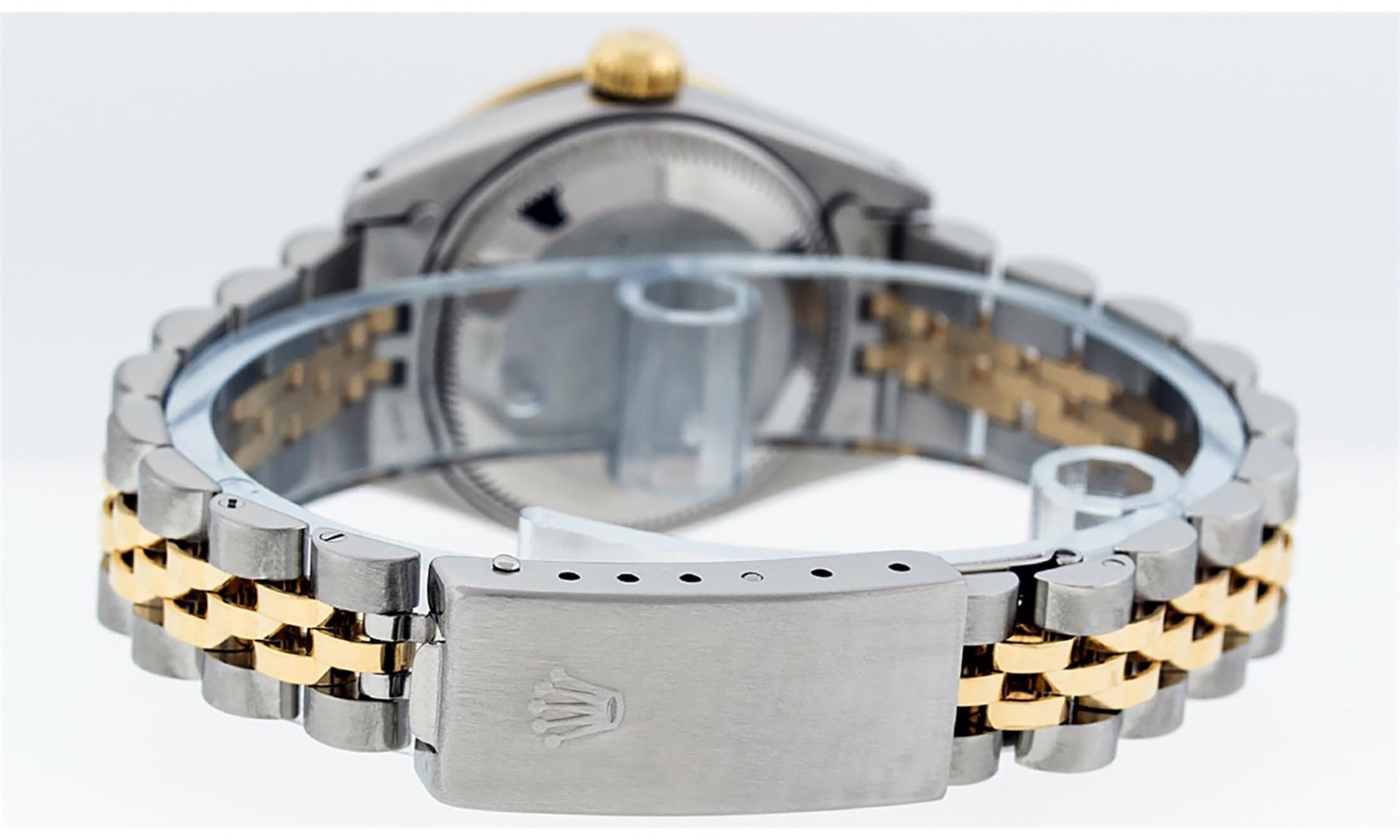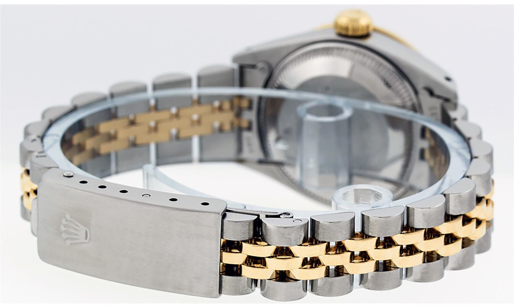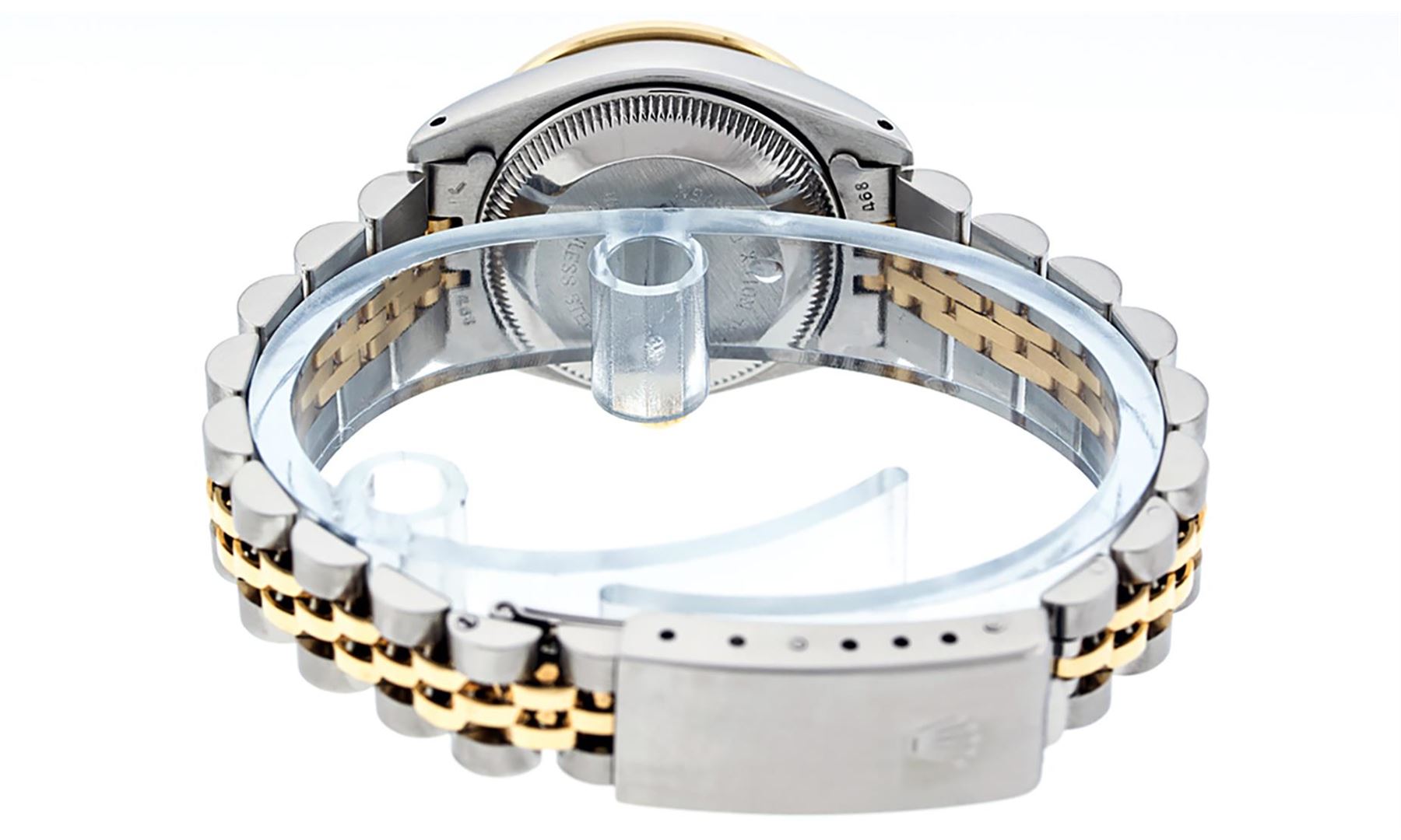One Ladies Two Tone Rolex Datejust Polished, Serviced & Electronically Tested, Yellow Gold & Stainless Steel Case: 26mm, Yellow Gold Crown, Custom Bezel: New 18K Yellow Gold Emerald Beadset Diamond Bezel, Diamond + Gem Count: 28 Diamonds + 4 Emeralds Total Weight .70 Carat, Clarity: SI-VS, Color: G to H. Custom Crystal: New Scratch Resistant Synthetic Sapphire Cyclops Lens. Custom Hands: New Luminescent Hands. Movement: Automatic Winding Movement. Custom Dial: Grey With Diamond Hour Markers & Roman Track, Diamond Count: 10 Diamond On Dial, G To H In Color, SI-VS Clarity. Date Window: 3 O'Clock Position Date Display, Model: Datejust, Condition: G-6 Extra Fine. Bracelet: Two Tone Yellow Gold & Stainless Steel Jubilee Band. Bright Polish. 6.0 Inch Length, Adjustable. Standard Clasp, With Rolex Logo. This Watch Has Been Serviced Time Tested And Is In Excellent Condition It Is Free Of All Scratches And Dents.