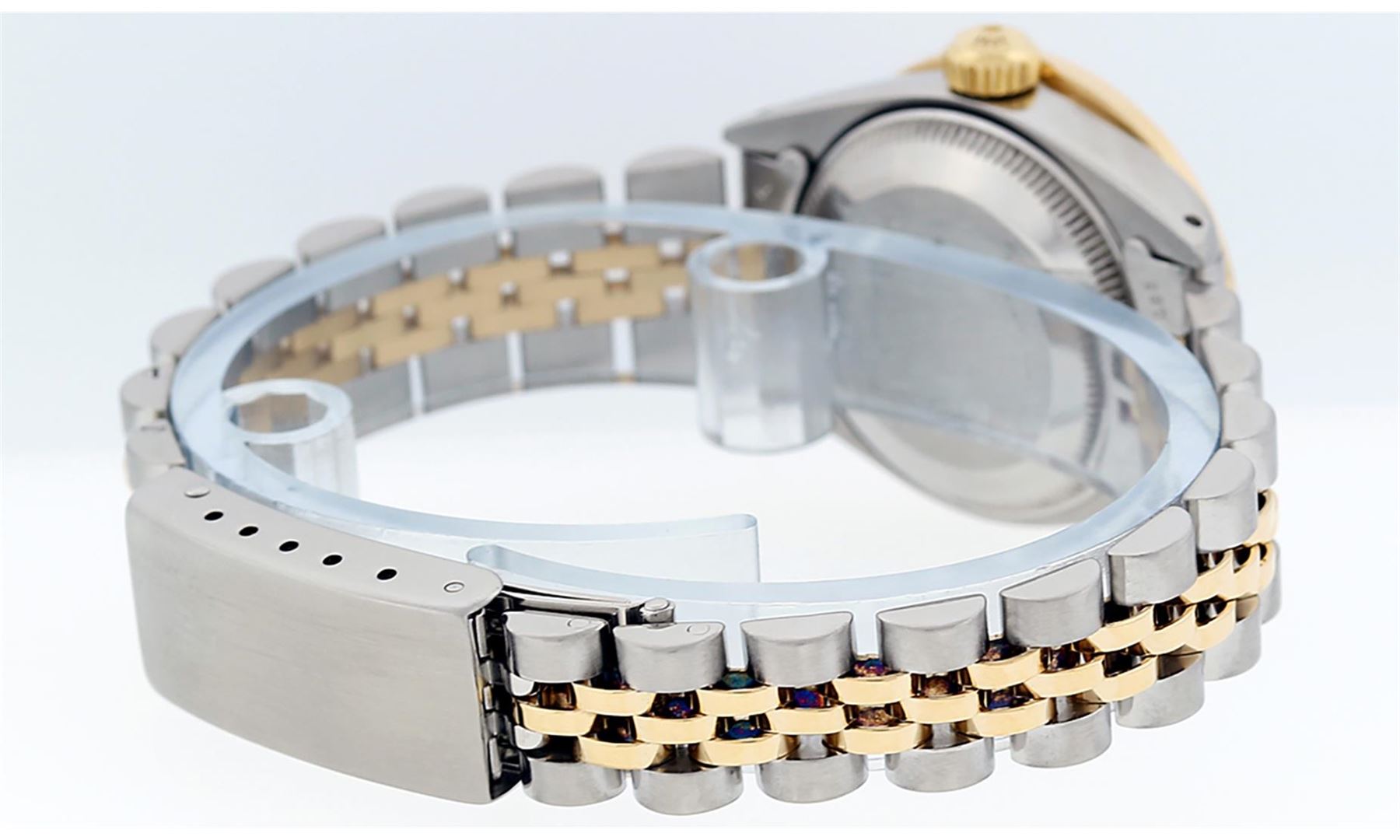 One Ladies Pre Owned Two Tone Rolex Datejust Polished, Serviced & Electronically Tested, Yellow Gold & Stainless Steel Case: 26mm, Yellow Gold Crown, Custom Bezel: New 2.0ctw 18K Yellow Gold Channel Set Diamond Bezel, Diamond + Gem Count: 32 Diamonds In Bezel, Clarity: SI-VS, Color: G to H. Custom Crystal: New Sapphire With Date Window. Custom Hands: New Luminescent Hands. Rolex Movement: Automatic Winding Movement. Custom Dial: Mother Of Pearl With Diamond Hour Markers, Stone Count: 10 Diamonds In Dial. Date Window: 3 Oclock Position Date Display, Model: Datejust, Condition: G-6 Extra Fine. Rolex Bracelet: Two Tone Yellow Gold & Stainless Steel Jubilee Band. Bright Polish. 6.0 Inch Length, Adjustable. Standard Clasp, With Rolex Logo. This Watch Has Been Serviced Time Tested And Is In Excellent Condition It Is Free Of All Scratches And Dents.