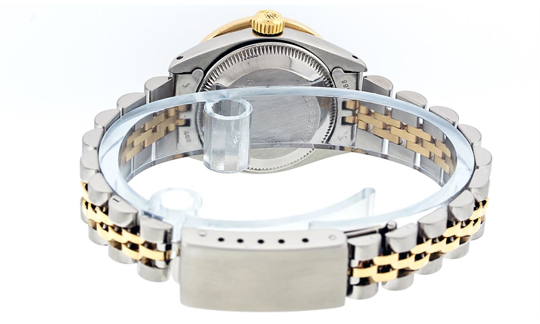 One Ladies Pre Owned Two Tone Rolex Datejust Polished, Serviced & Electronically Tested, Yellow Gold & Stainless Steel Case: 26mm, Yellow Gold Crown, Custom Bezel: New 2.0ctw 18K Yellow Gold Channel Set Diamond Bezel, Diamond + Gem Count: 32 Diamonds In Bezel, Clarity: SI-VS, Color: G to H. Custom Crystal: New Sapphire With Date Window. Custom Hands: New Luminescent Hands. Rolex Movement: Automatic Winding Movement. Custom Dial: Mother Of Pearl With Diamond Hour Markers, Stone Count: 10 Diamonds In Dial. Date Window: 3 Oclock Position Date Display, Model: Datejust, Condition: G-6 Extra Fine. Rolex Bracelet: Two Tone Yellow Gold & Stainless Steel Jubilee Band. Bright Polish. 6.0 Inch Length, Adjustable. Standard Clasp, With Rolex Logo. This Watch Has Been Serviced Time Tested And Is In Excellent Condition It Is Free Of All Scratches And Dents.