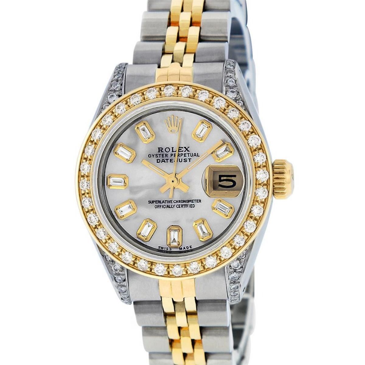 One Ladies Two Tone Rolex Datejust Polished, Serviced & Electronically Tested, Yellow Gold & Stainless Steel Case: 26mm, Yellow Gold Crown, Diamond Lugs: 24 Diamonds On Lugs, Clarity: SI-VS, Color: G to H. Custom Bezel: New 18K Yellow Gold Beadset Diamond Bezel, Diamond Count: 32 Diamonds In Bezel, Total Weight .70 Carat, Clarity: SI-VS, Color: G to H. Custom Crystal: New Scratch Resistant Synthetic Sapphire Cyclops Lens. Custom Hands: New Luminescent Hands. Movement: Automatic Winding Movement. Custom Dial: Mother Of Pearl Baguette Diamond Hour Markers, Diamond Count: 10 Diamonds In Dial, Clarity: SI-VS, Color: G to H. Date Window: 3 O'Clock Position Date Display, Model: Datejust. Condition: G-6 Extra Fine. Bracelet: Two Tone Yellow Gold & Stainless Steel Jubilee Band. Bright Polish. 6.0 Inch Length, Adjustable. Standard Clasp, With Rolex Logo. This Watch Has Been Serviced Time Tested And Is In Excellent Condition It Is Free Of All Scratches And Dents.