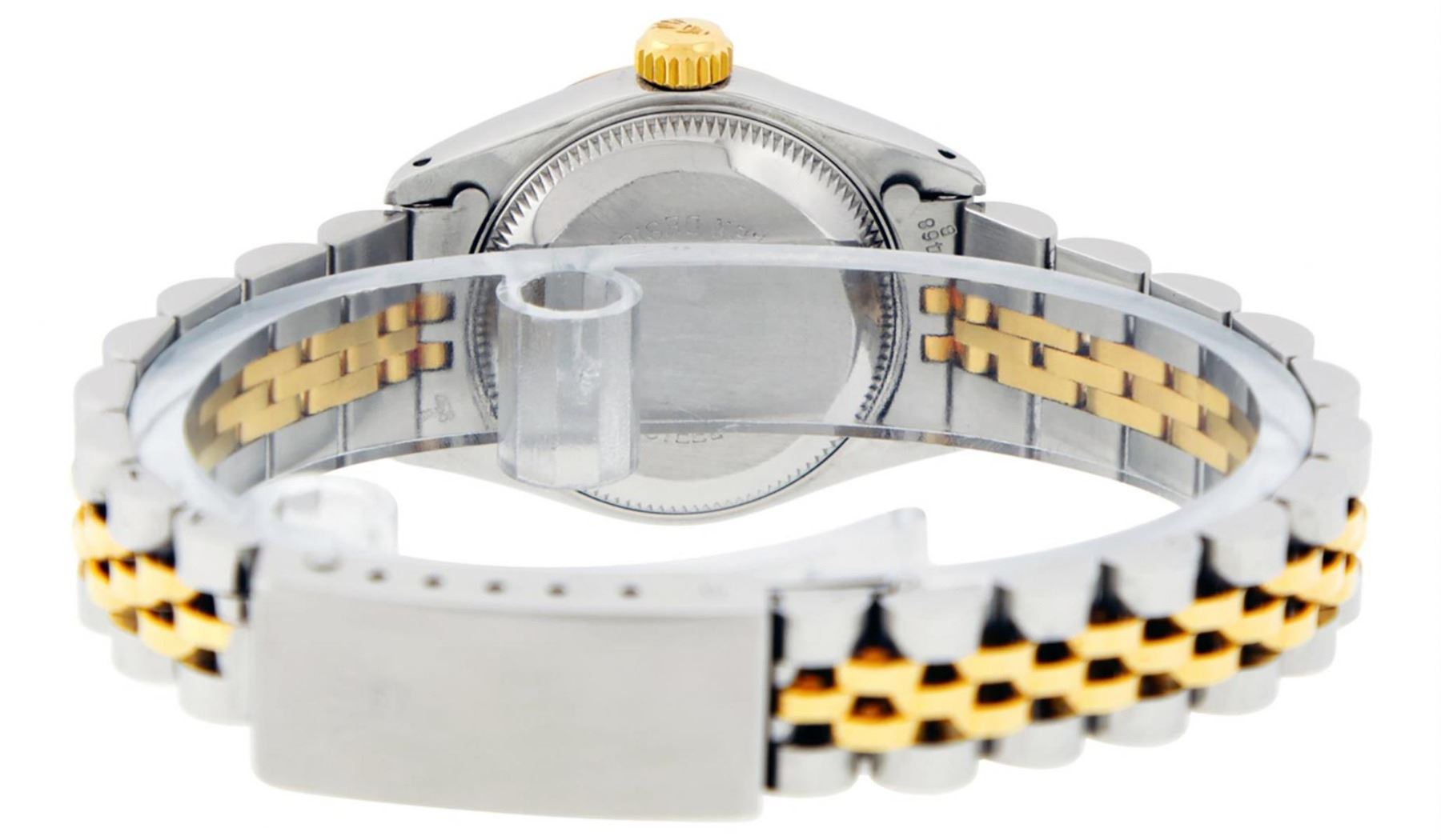 One Ladies Two Tone Rolex Datejust Polished, Serviced & Electronically Tested, Yellow Gold & Stainless Steel Case: 26mm, Yellow Gold Crown, Bezel: Yellow Gold Fluted Bezel. Custom Crystal: New Acrylic Cyclops Lens. Custom Hands: New Luminescent Hands. Movement: Automatic Winding Movement. Custom Dial: Mother Of Pearl With Diamond Hour Markers, Diamond Count: 10 Diamonds In Dial, Color: G to H, Clarity: VS2-SI1. Date Window: 3 O'Clock Position Date Display, Model: Datejust. Condition: G-6 Extra Fine. Bracelet: Two Tone Yellow Gold & Stainless Steel Jubilee Band. Bright Polish. 6.0 Inch Length, Adjustable. Standard Clasp, With Rolex Logo. This Watch Has Been Serviced Time Tested And Is In Excellent Condition It Is Free Of All Scratches And Dents.