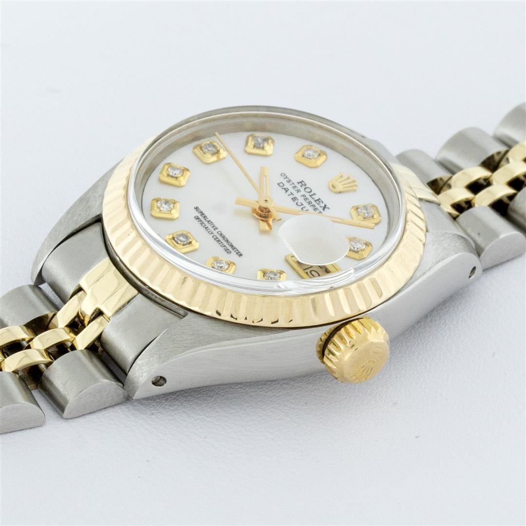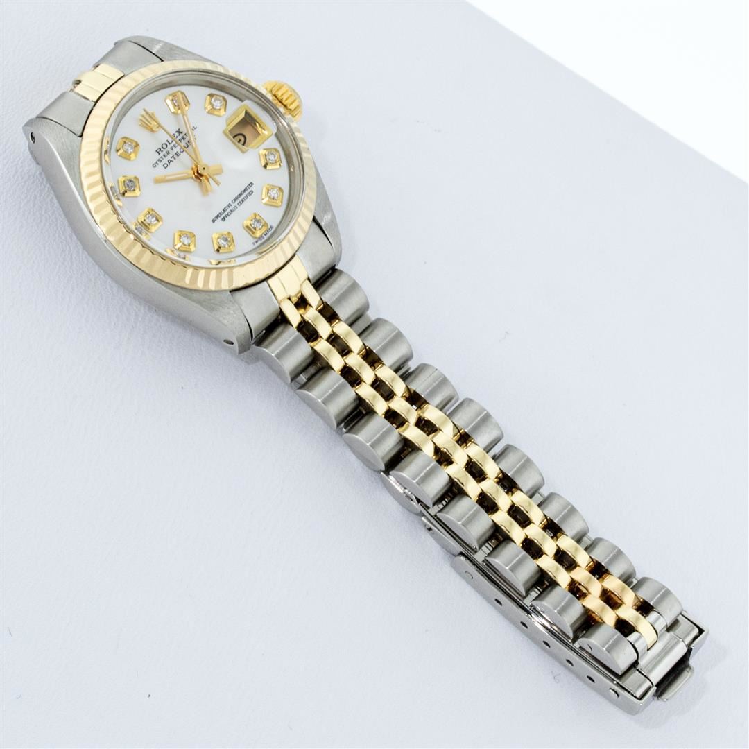 One Ladies Pre Owned Two Tone Rolex Datejust Polished, Serviced & Electronically Tested, Rolex Yellow Gold & Stainless Steel Case: 26mm, Rolex Yellow Gold Crown, Rolex Bezel: Yellow Gold Fluted Bezel. Custom Crystal: New Acrylic Cyclops Lens. Custom Hands: New Luminescent Hands. Rolex Movement: Automatic Winding Movement. Custom Dial: Refinished To Mother Of Pearl With Diamond Hour Markers, Diamond Count: 10 Diamonds In Dial, Color: G to H, Clarity: VS2-SI1. Date Window: 3 O'Clock Position Date Display, Model: Datejust. Condition: G-6 Extra Fine. Rolex Bracelet: Two Tone Yellow Gold & Stainless Steel Jubilee Band. Bright Polish. 6.0 Inch Length, Adjustable. Standard Clasp, With Rolex Logo. This Watch Has Been Serviced Time Tested And Is In Excellent Condition It Is Free Of All Scratches And Dents.