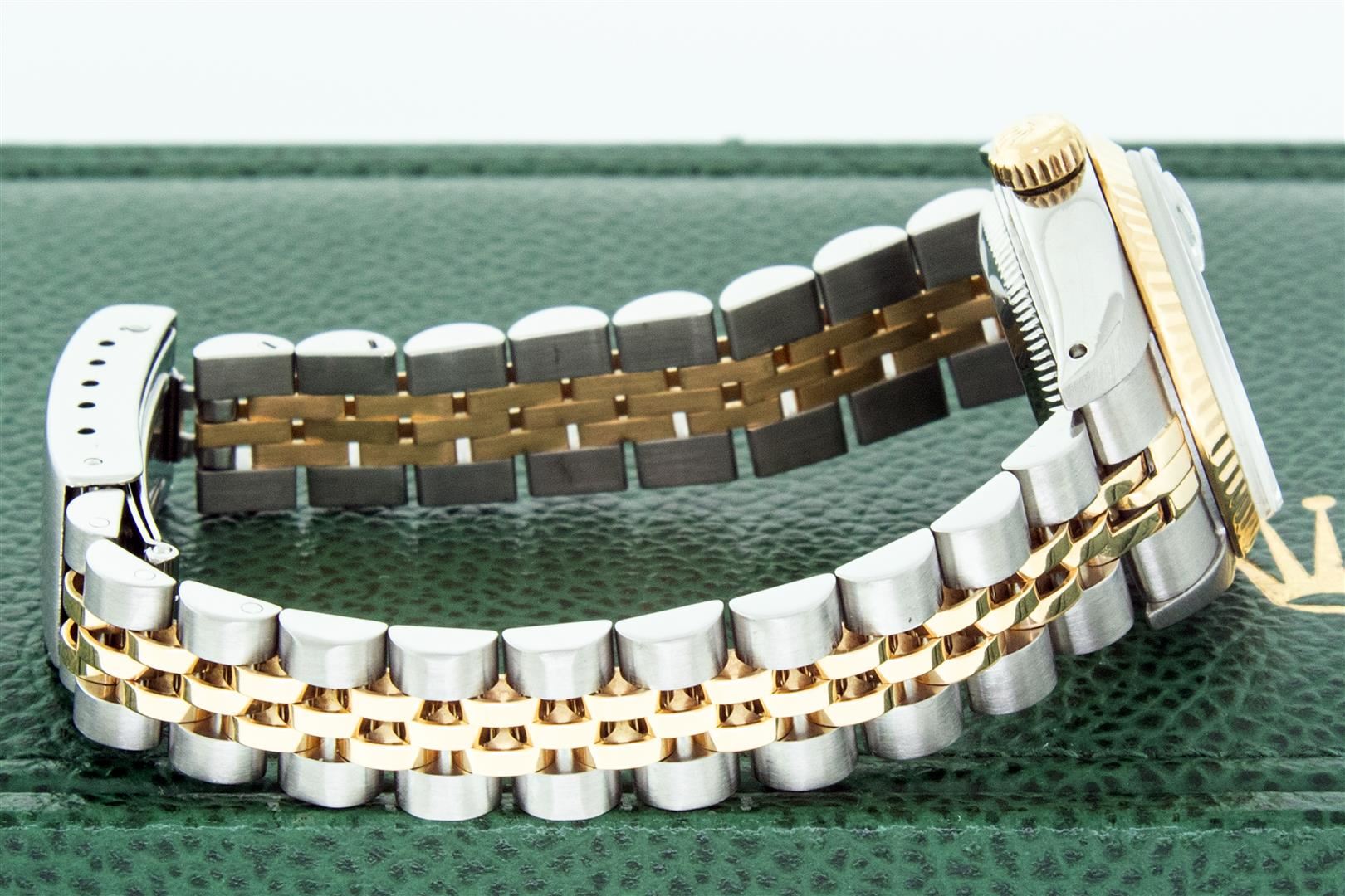 One Ladies Pre Owned Two Tone Rolex Datejust Polished, Serviced & Electronically Tested, Rolex Yellow Gold & Stainless Steel Case: 26mm, Rolex Yellow Gold Crown, Rolex Bezel: Yellow Gold Fluted Bezel. Custom Crystal: New Acrylic Cyclops Lens. Custom Hands: New Luminescent Hands. Rolex Movement: Automatic Winding Movement. Custom Dial: Refinished To Mother Of Pearl With Custom Added Diamond Hour Markers, Diamond Count: 10 Diamonds In Dial, Color: G to H, Clarity: VS2-SI1. Date Window: 3 O'Clock Position Date Display, Model: Datejust. Condition: G-6 Extra Fine. Rolex Bracelet: Two Tone Yellow Gold & Stainless Steel Jubilee Band. Bright Polish. 6.0 Inch Length, Adjustable. Standard Clasp, With Rolex Logo. This Watch Has Been Serviced Time Tested And Is In Excellent Condition It Is Free Of All Scratches And Dents.