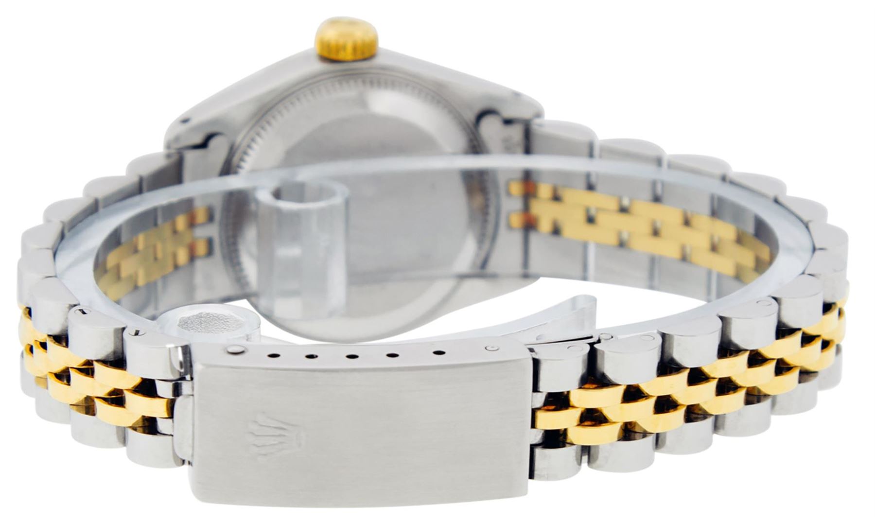 One Ladies Pre Owned Two Tone Rolex Datejust Polished, Serviced & Electronically Tested, Rolex Yellow Gold & Stainless Steel Case: 26mm, Rolex Yellow Gold Crown, Rolex Bezel: Yellow Gold Fluted Bezel. Custom Crystal: New Acrylic Cyclops Lens. Custom Hands