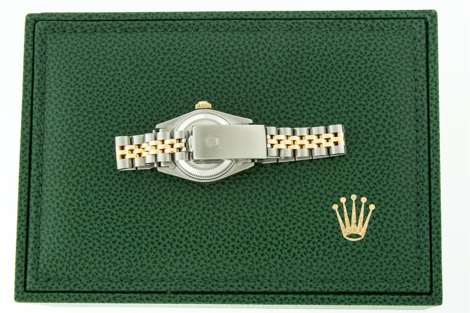 One Ladies Pre Owned Two Tone Rolex Datejust Polished, Serviced & Electronically Tested, Rolex Yellow Gold & Stainless Steel Case: 26mm, Rolex Yellow Gold Crown, Rolex Bezel: Yellow Gold Fluted Bezel. Custom Crystal: New Acrylic Cyclops Lens. Custom Hands: New Luminescent Hands. Rolex Movement: Automatic Winding Movement. Custom Dial: Refinished To Mother Of Pearl With Custom Added Diamond Hour Markers, Diamond Count: 10 Diamonds In Dial, Color: G to H, Clarity: VS2-SI1. Date Window: 3 O'Clock Position Date Display, Model: Datejust. Condition: G-6 Extra Fine. Rolex Bracelet: Two Tone Yellow Gold & Stainless Steel Jubilee Band. Bright Polish. 6.0 Inch Length, Adjustable. Standard Clasp, With Rolex Logo. This Watch Has Been Serviced Time Tested And Is In Excellent Condition It Is Free Of All Scratches And Dents.