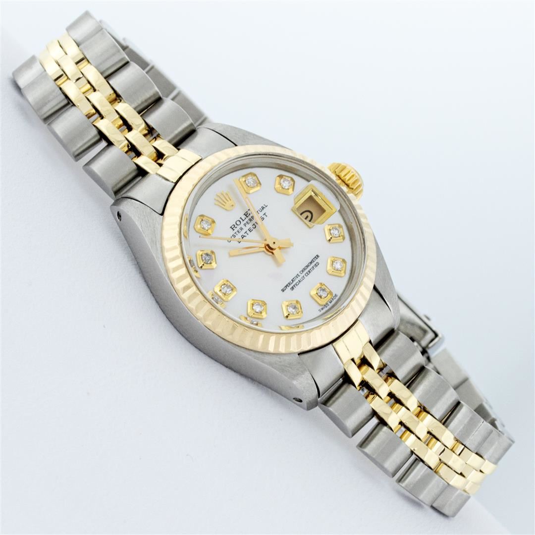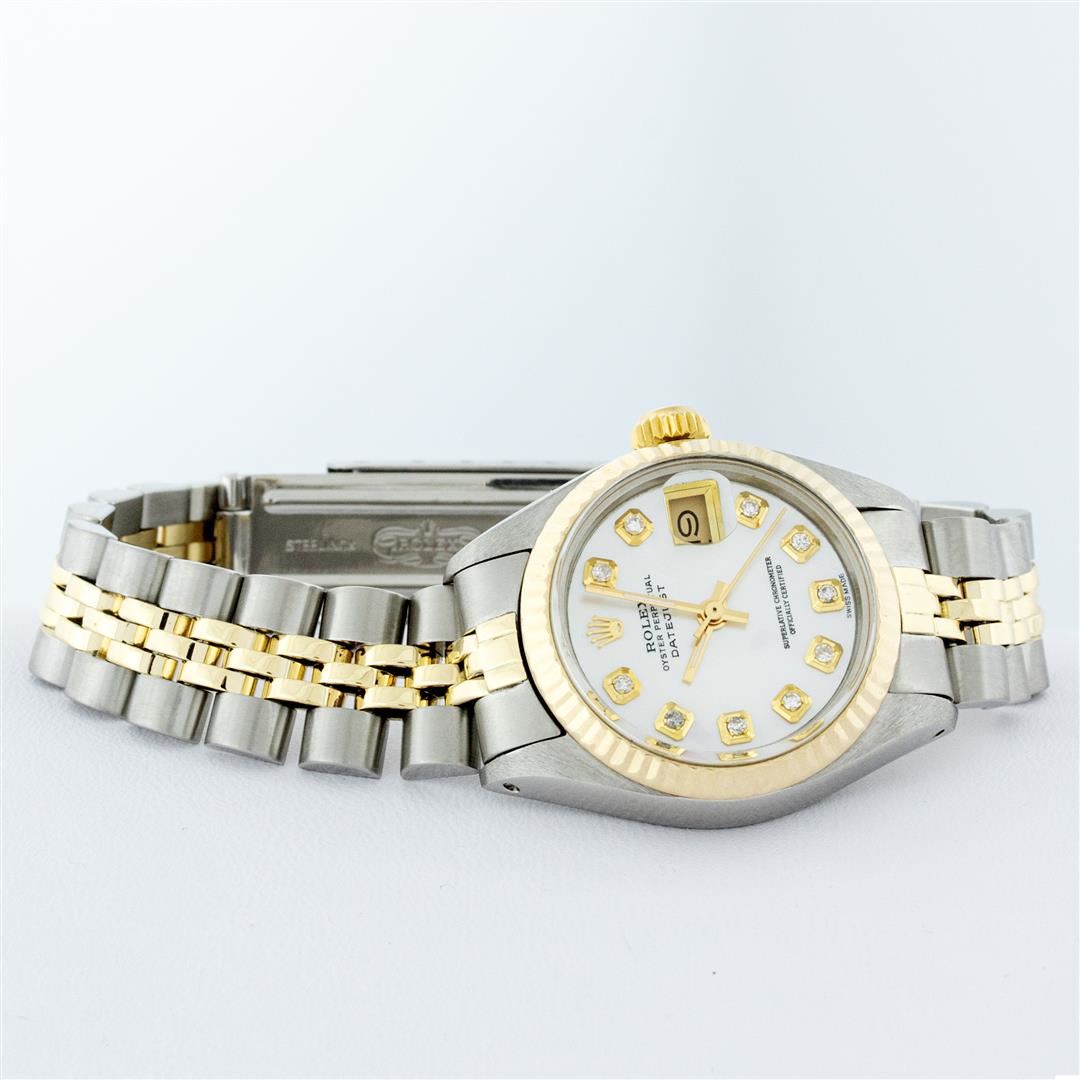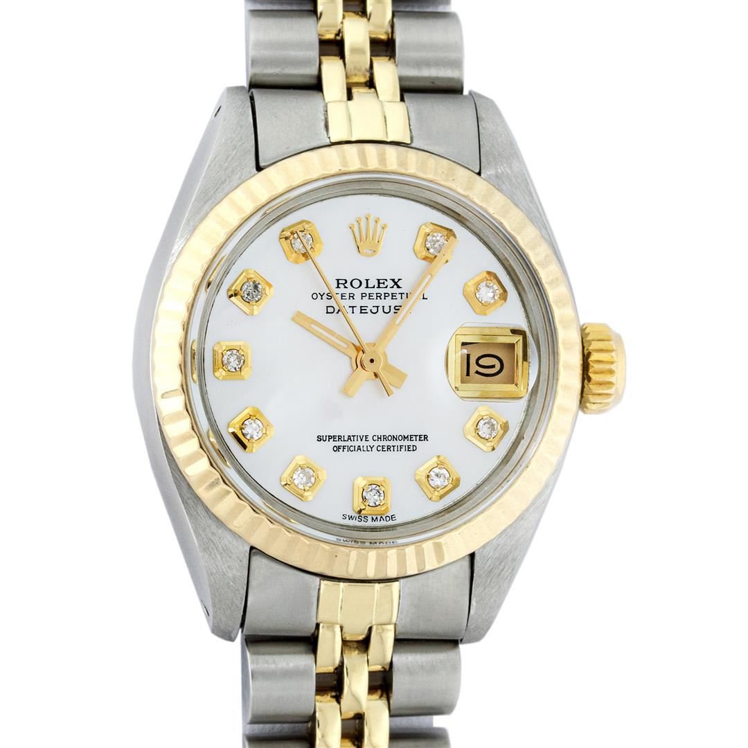 One Ladies Pre Owned Two Tone Rolex Datejust Polished, Serviced & Electronically Tested, Rolex Yellow Gold & Stainless Steel Case: 26mm, Rolex Yellow Gold Crown, Rolex Bezel: Yellow Gold Fluted Bezel. Custom Crystal: New Acrylic Cyclops Lens. Custom Hands: New Luminescent Hands. Rolex Movement: Automatic Winding Movement. Custom Dial: Refinished To Mother Of Pearl With Diamond Hour Markers, Diamond Count: 10 Diamonds In Dial, Color: G to H, Clarity: VS2-SI1. Date Window: 3 O'Clock Position Date Display, Model: Datejust. Condition: G-6 Extra Fine. Rolex Bracelet: Two Tone Yellow Gold & Stainless Steel Jubilee Band. Bright Polish. 6.0 Inch Length, Adjustable. Standard Clasp, With Rolex Logo. This Watch Has Been Serviced Time Tested And Is In Excellent Condition It Is Free Of All Scratches And Dents.