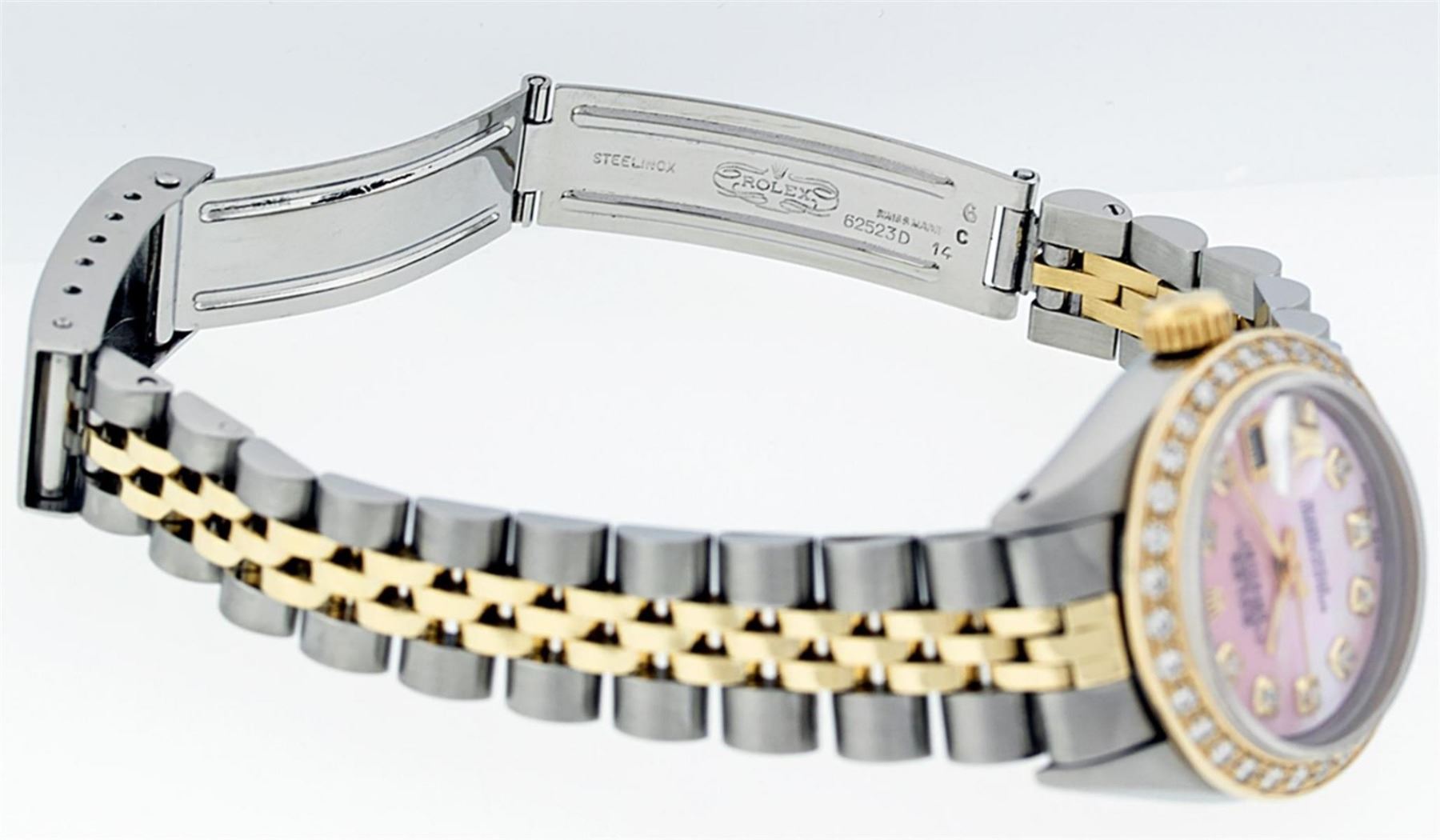 One Ladies Two Tone Rolex Datejust Polished, Serviced & Electronically Tested, Yellow Gold & Stainless Steel Case: 26mm, Yellow Gold Crown, Custom Bezel: 18K Yellow Gold Beadset Diamond Bezel, Diamond Count: 32 Diamonds Total Weight .70 Carat, Clarity: Si-VS, Color: G to H. Custom Crystal: Synthetic Sapphire Cyclops Lens. Custom Hands: New Luminescent Hands. Movement: Automatic Winding Movement Caliber. Custom Dial: Mother Of Pearl Dial Set With Diamond Hour Markers, 10 Diamond in Dial G To H In Color, SI-VS Clarity. Date Window: 3 O'Clock Position Date Display, Model: Datejust. Condition: G-6 Extra Fine. Bracelet: Two Tone Yellow Gold & Stainless Steel Jubilee. Bright Polish. 6.0 Inch Length, Adjustable. Standard Clasp, With Rolex Logo. This Watch Has Been Serviced Time Tested And Is In Excellent Condition It Is Free Of All Scratches And Dents.
