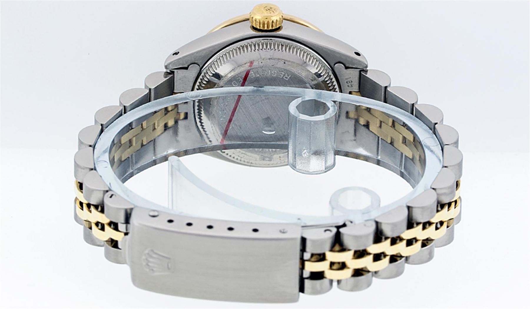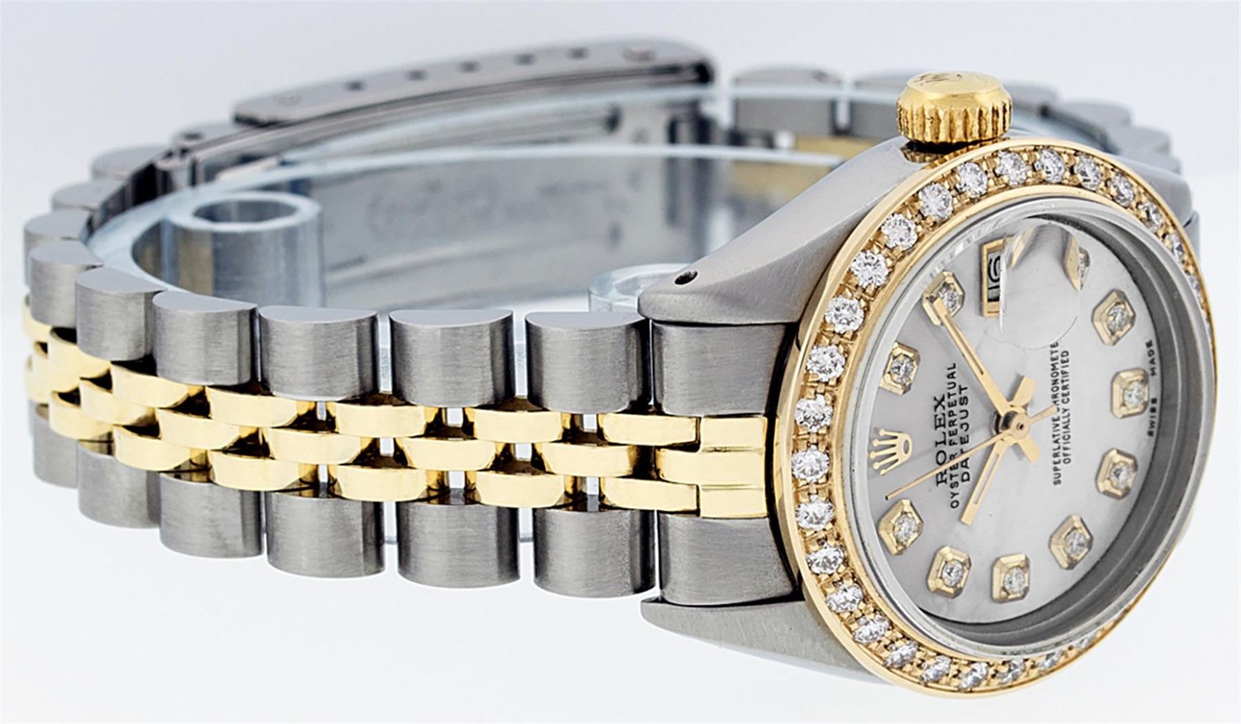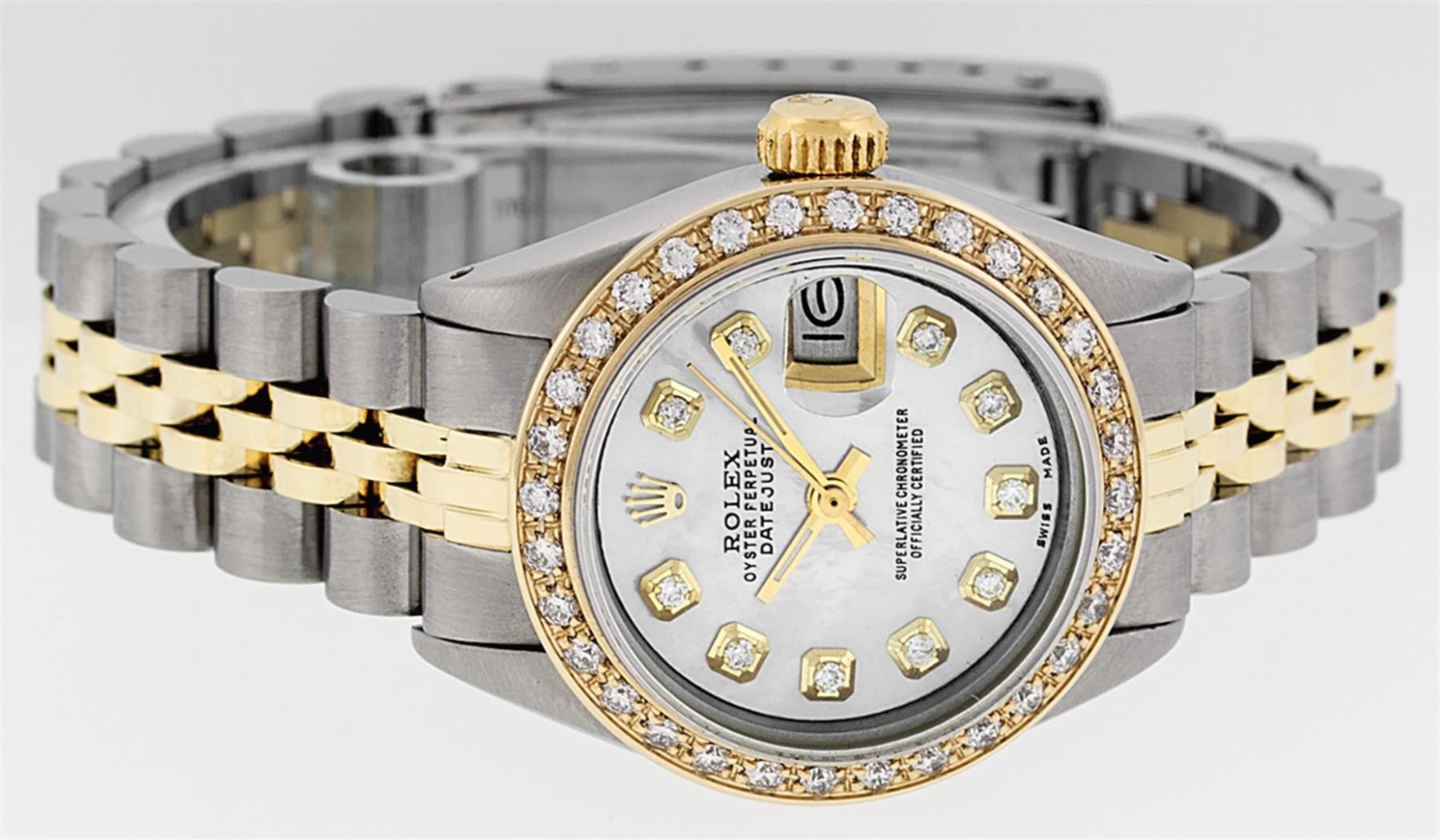 One Ladies Two Tone Rolex Datejust Polished, Serviced & Electronically Tested, Yellow Gold & Stainless Steel Case: 26mm, Yellow Gold Crown, Custom Bezel: 18K Yellow Gold Beadset Diamond Bezel, Diamond Count: 32 Diamonds Total Weight .70 Carat, Clarity: Si-VS, Color: G to H. Custom Crystal: Synthetic Sapphire Cyclops Lens. Custom Hands: New Luminescent Hands. Movement: Automatic Winding Movement Caliber. Custom Dial: Mother Of Pearl Dial Set With Diamond Hour Markers, 10 Diamond in Dial G To H In Color, SI-VS Clarity. Date Window: 3 O'Clock Position Date Display, Model: Datejust. Condition: G-6 Extra Fine. Bracelet: Two Tone Yellow Gold & Stainless Steel Jubilee. Bright Polish. 6.0 Inch Length, Adjustable. Standard Clasp, With Rolex Logo. This Watch Has Been Serviced Time Tested And Is In Excellent Condition It Is Free Of All Scratches And Dents.