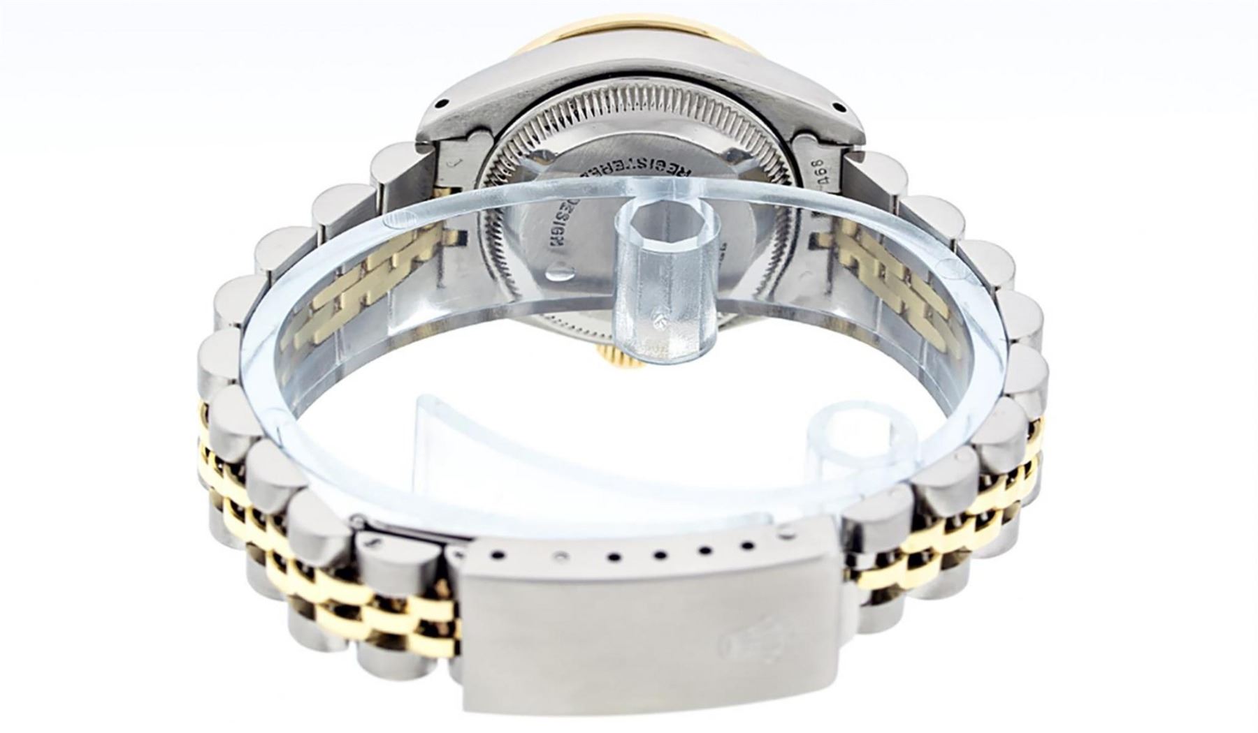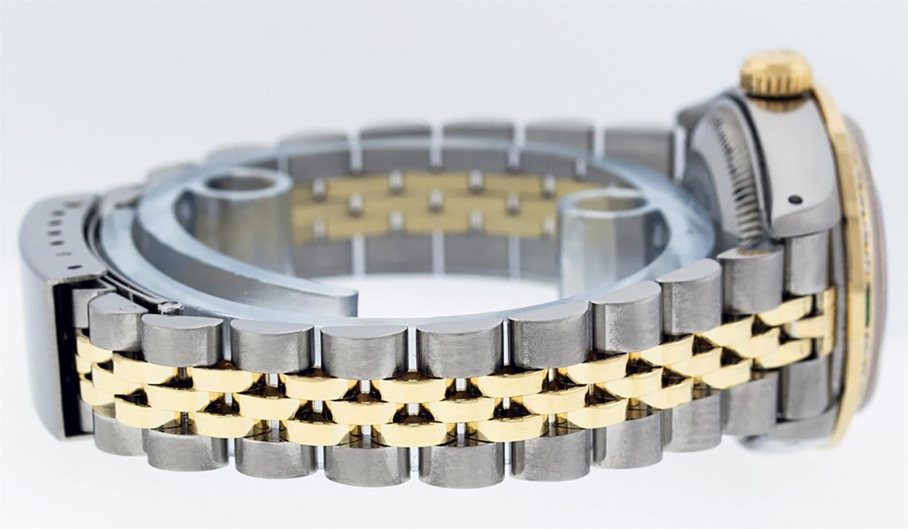 One Ladies Two Tone Rolex Datejust Polished, Serviced & Electronically Tested, Yellow Gold & Stainless Steel Case: 26mm, Yellow Gold Crown, Custom Bezel: New 18K Yellow Gold Synthetic Emerald Beadset Diamond Bezel, Diamond Count: 28 Diamonds + 4 Synthetic Emeralds. Total Weight .70 Carat, Clarity: SI-VS, Color: G to H. Custom Crystal: New Synthetic Sapphire Cyclops Lens. Custom Hands: New Luminescent Hands. Movement: Automatic Winding Movement. Custom Dial: Mother Of Pearl With Green Emerald String Diamond Hour Markers. 10 Emeralds + 33 Diamonds In Dial, Clarity: SI-VS, Color: G to H. Date Window: 3 O'Clock Position Date Display, Model: Datejust. Condition: G-6 Extra Fine. Bracelet: Two Tone Yellow Gold & Stainless Steel Jubilee. Bright Polish. 6.0 Inch Length, Adjustable. Standard Clasp, With Rolex Logo. This Watch Has Been Serviced Time Tested And Is In Excellent Condition It Is Free Of All Scratches And Dents.