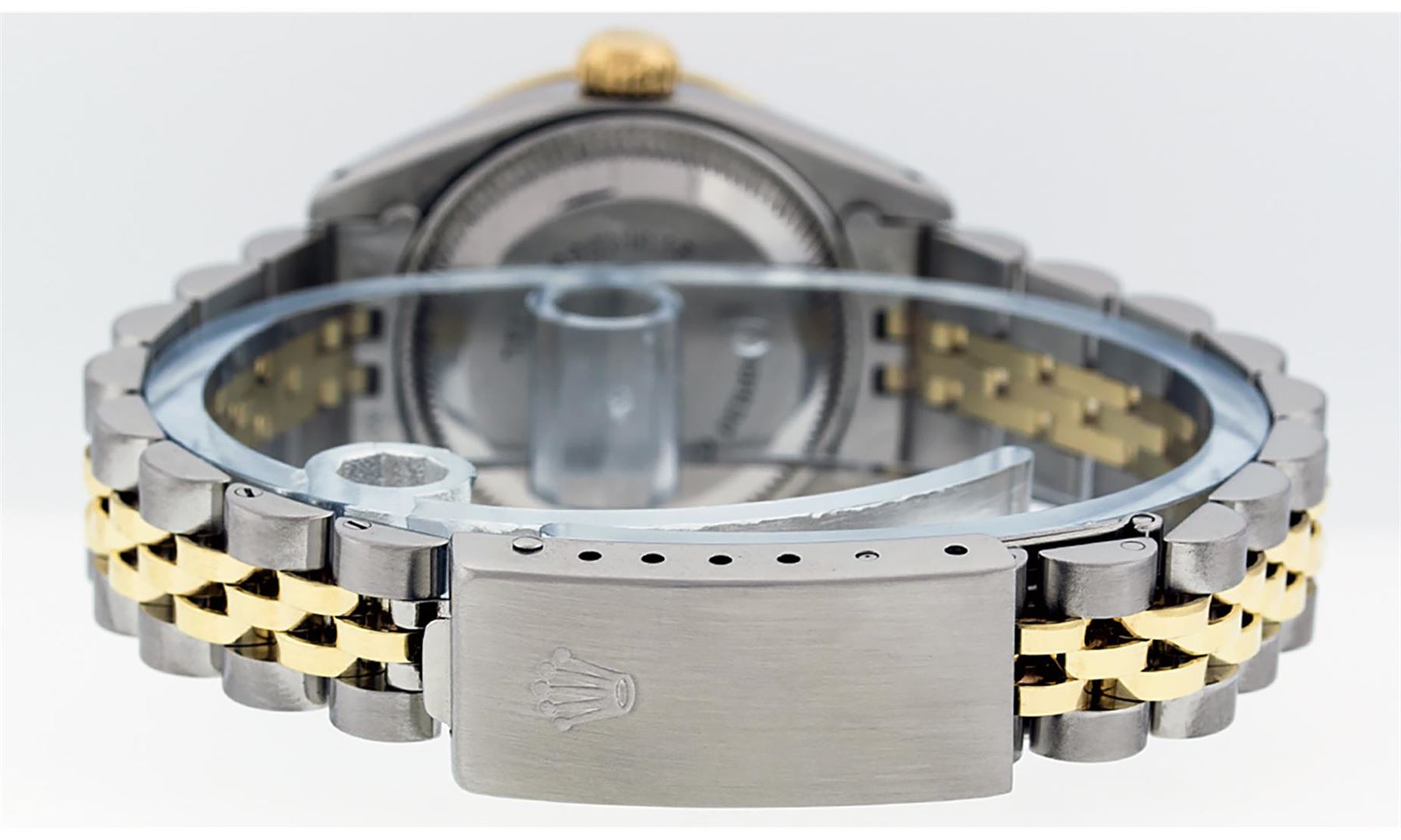 One Ladies Two Tone Rolex Datejust Polished, Serviced & Electronically Tested, Yellow Gold & Stainless Steel Case: 26mm, Yellow Gold Crown, Custom Bezel: New 18K Yellow Gold Synthetic Emerald Beadset Diamond Bezel, Diamond Count: 28 Diamonds + 4 Synthetic Emeralds. Total Weight .70 Carat, Clarity: SI-VS, Color: G to H. Custom Crystal: New Synthetic Sapphire Cyclops Lens. Custom Hands: New Luminescent Hands. Movement: Automatic Winding Movement. Custom Dial: Mother Of Pearl With Green Emerald String Diamond Hour Markers. 10 Emeralds + 33 Diamonds In Dial, Clarity: SI-VS, Color: G to H. Date Window: 3 O'Clock Position Date Display, Model: Datejust. Condition: G-6 Extra Fine. Bracelet: Two Tone Yellow Gold & Stainless Steel Jubilee. Bright Polish. 6.0 Inch Length, Adjustable. Standard Clasp, With Rolex Logo. This Watch Has Been Serviced Time Tested And Is In Excellent Condition It Is Free Of All Scratches And Dents.