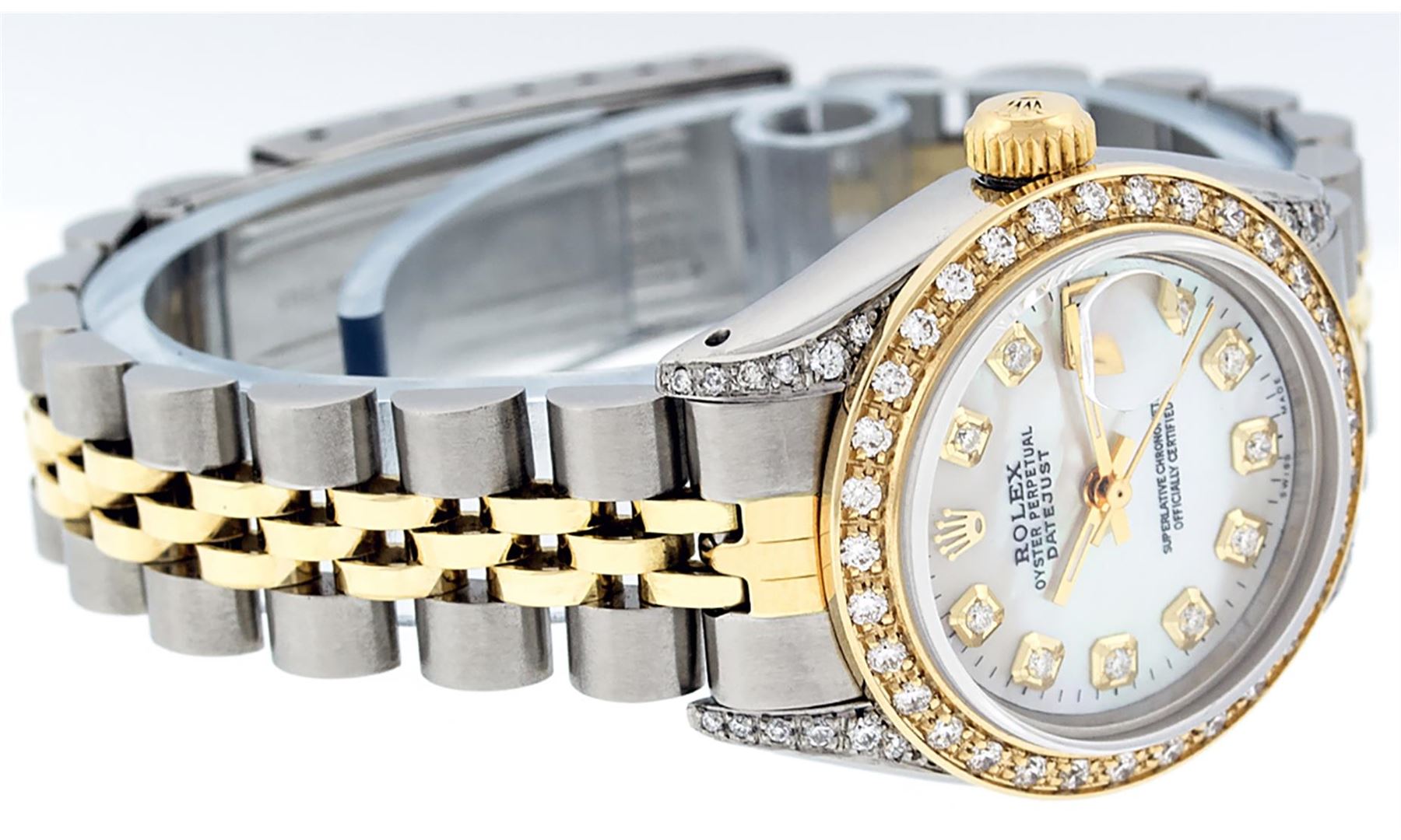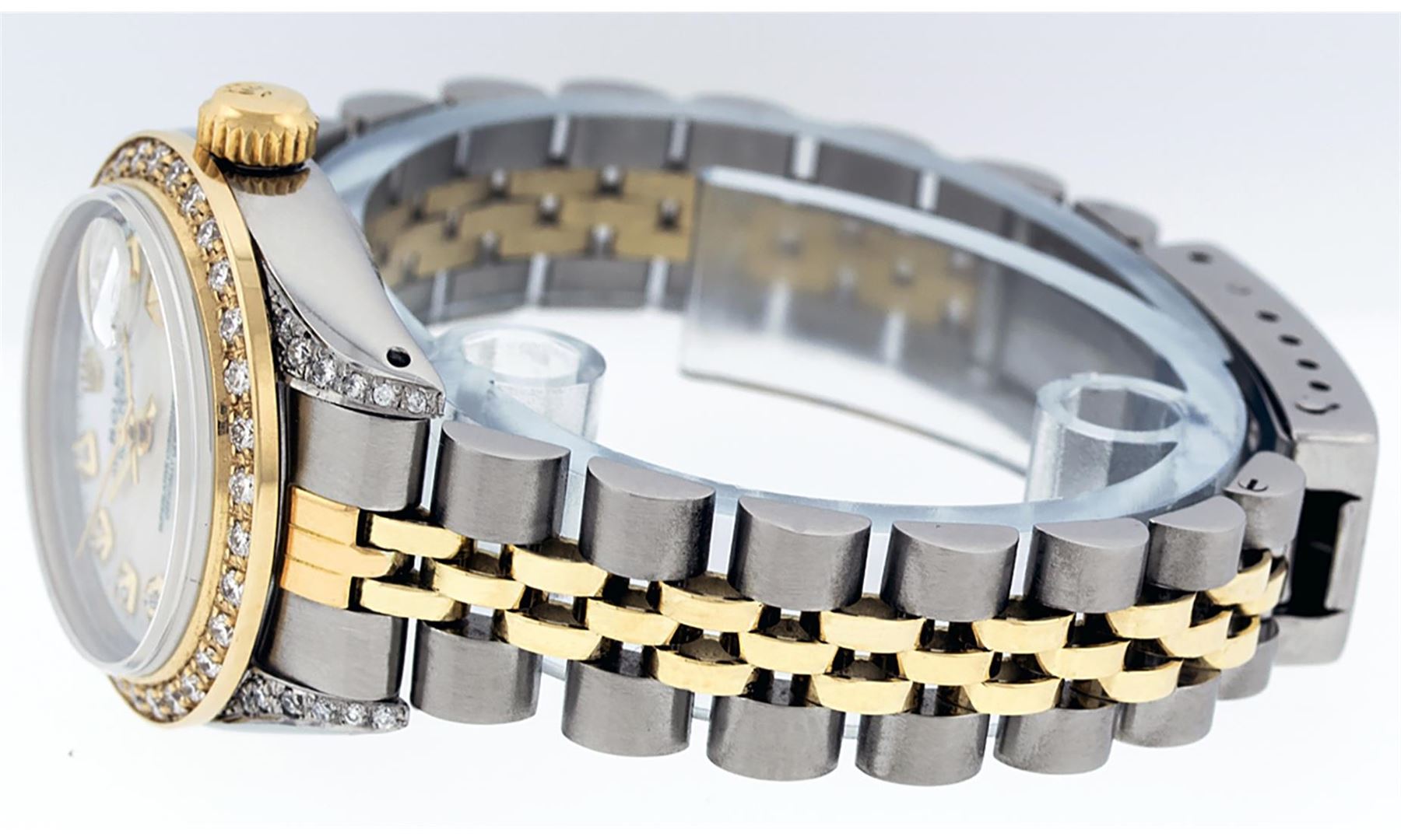 One Ladies Two Tone Rolex Datejust Polished, Serviced & Electronically Tested, Yellow Gold & Stainless Steel Case: 26mm, Yellow Gold Crown, Diamond Lugs: 24 Diamonds On Lugs, Clarity: SI-VS, Color: G to H, Clarity SI-VS. Custom Bezel: New 18K Yellow Gold Beadset Diamond Bezel, Diamond Count: 32 Diamonds, Total Weight .70 Carat, Clarity: SI-VS, Color: G to H. Custom Crystal: New Synthetic Sapphire Cyclops Lens. Custom Hands: New Luminescent Hands. Movement: Automatic Winding Movement. Custom Dial: Mother Of Pearl With Diamond Hour Markers and Dash Track, Diamond Count: 10 Diamonds, Clarity: SI-VS, Color: G to H. Date Window: 3 O'Clock Position Date Display, Model: Datejust. Condition: G-6 Extra Fine. Bracelet: Two Tone Yellow Gold & Stainless Steel Jubilee. Bright Polish. 6.0 Inch Length, Adjustable. Standard Clasp, With Rolex Logo. This Watch Has Been Serviced Time Tested And Is In Excellent Condition It Is Free Of All Scratches And Dents.