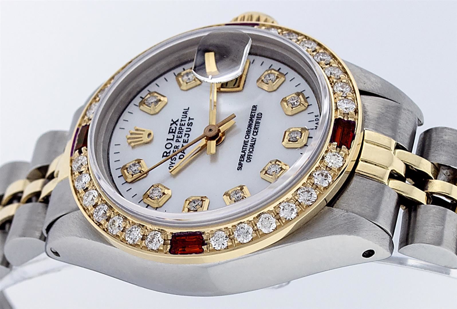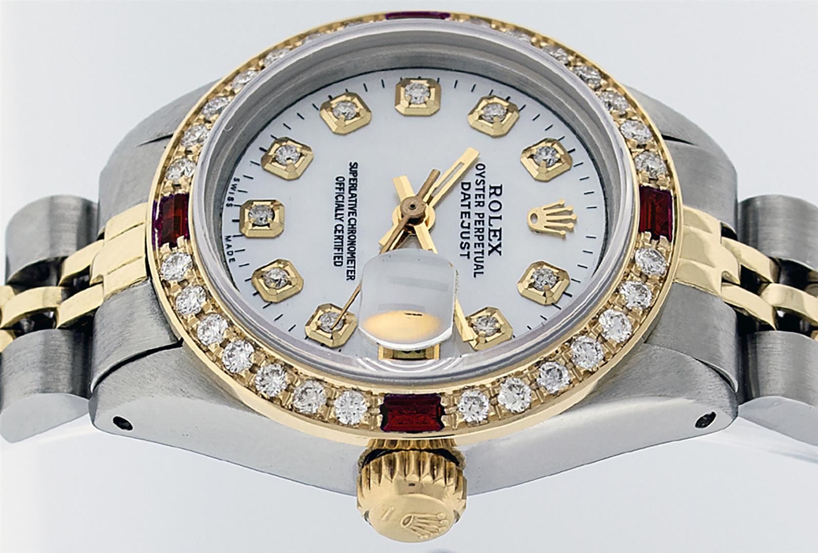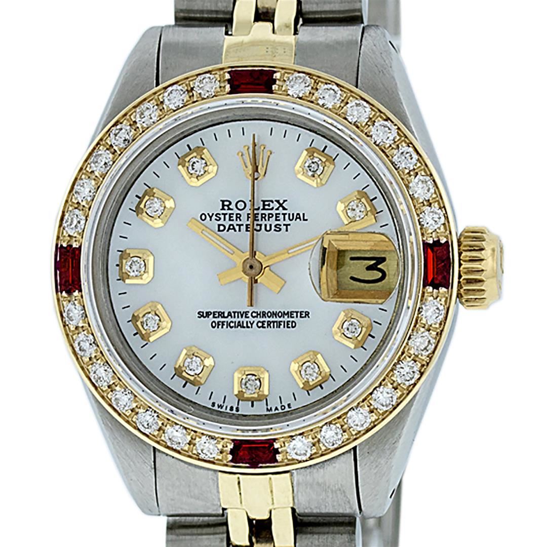 One Ladies Pre Owned Two Tone Rolex Datejust Polished, Serviced & Electronically Tested, Yellow Gold & Stainless Steel Case: 26mm, Yellow Gold Crown, Custom Bezel: New 18K Yellow Gold Ruby Beadset Diamond Bezel, Diamond + Gem Count: 28 Diamonds + 4 Rubies