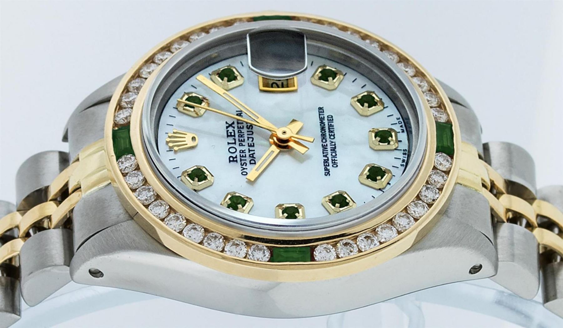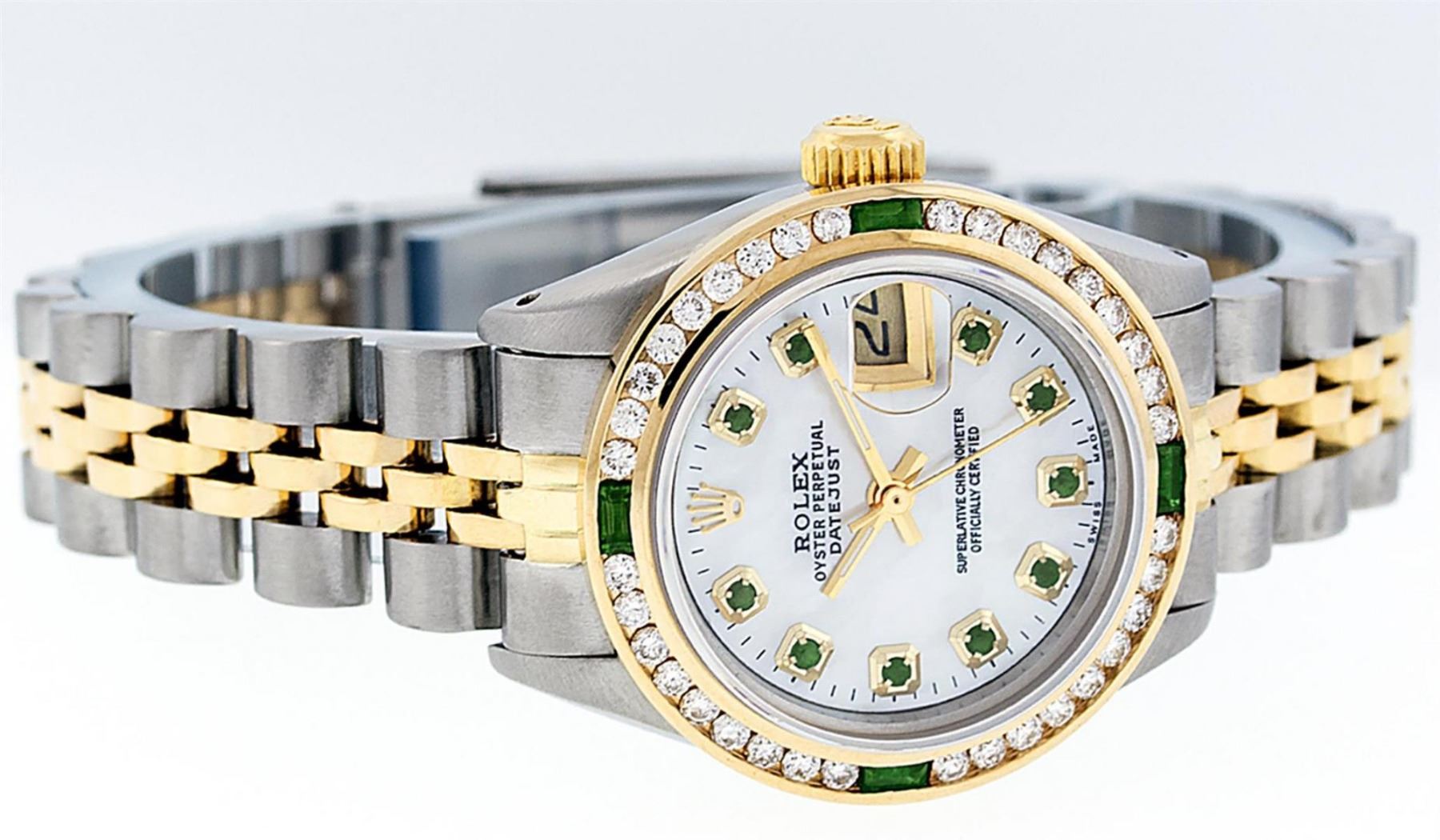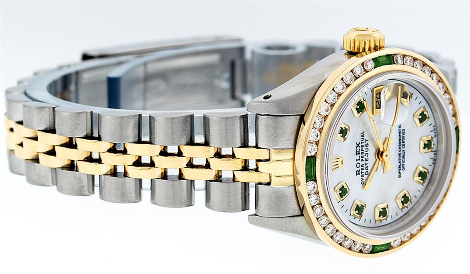 One Ladies Two Tone Rolex Datejust Polished, Serviced & Electronically Tested, Yellow Gold & Stainless Steel Case: 26mm, Yellow Gold Crown, Custom Bezel: New 18K Yellow Gold Emerald Channel Set Diamond Bezel, Diamond + Gem Count: 36 Diamonds + 4 Emeralds, Total Weight 1.00 Carat, Clarity: SI-VS, Color: G to H. Custom Crystal: New Scratch Resistant Synthetic Sapphire Cyclops Lens. Custom Hands: New Luminescent Hands. Movement: Automatic Winding Movement. Custom Dial: Mother Of Pearl with Emerald Hour Markers And Dash Tracks, Stone Count: 10 Emeralds In Dial. Date Window: 3 O'Clock Position Date Display, Model: Datejust, Condition: G-6 Extra Fine. Bracelet: Two Tone Yellow Gold & Stainless Steel Jubilee Band. Bright Polish. 6.0 Inch Length, Adjustable. Standard Clasp, With Rolex Logo. This Watch Has Been Serviced Time Tested And Is In Excellent Condition It Is Free Of All Scratches And Dents.