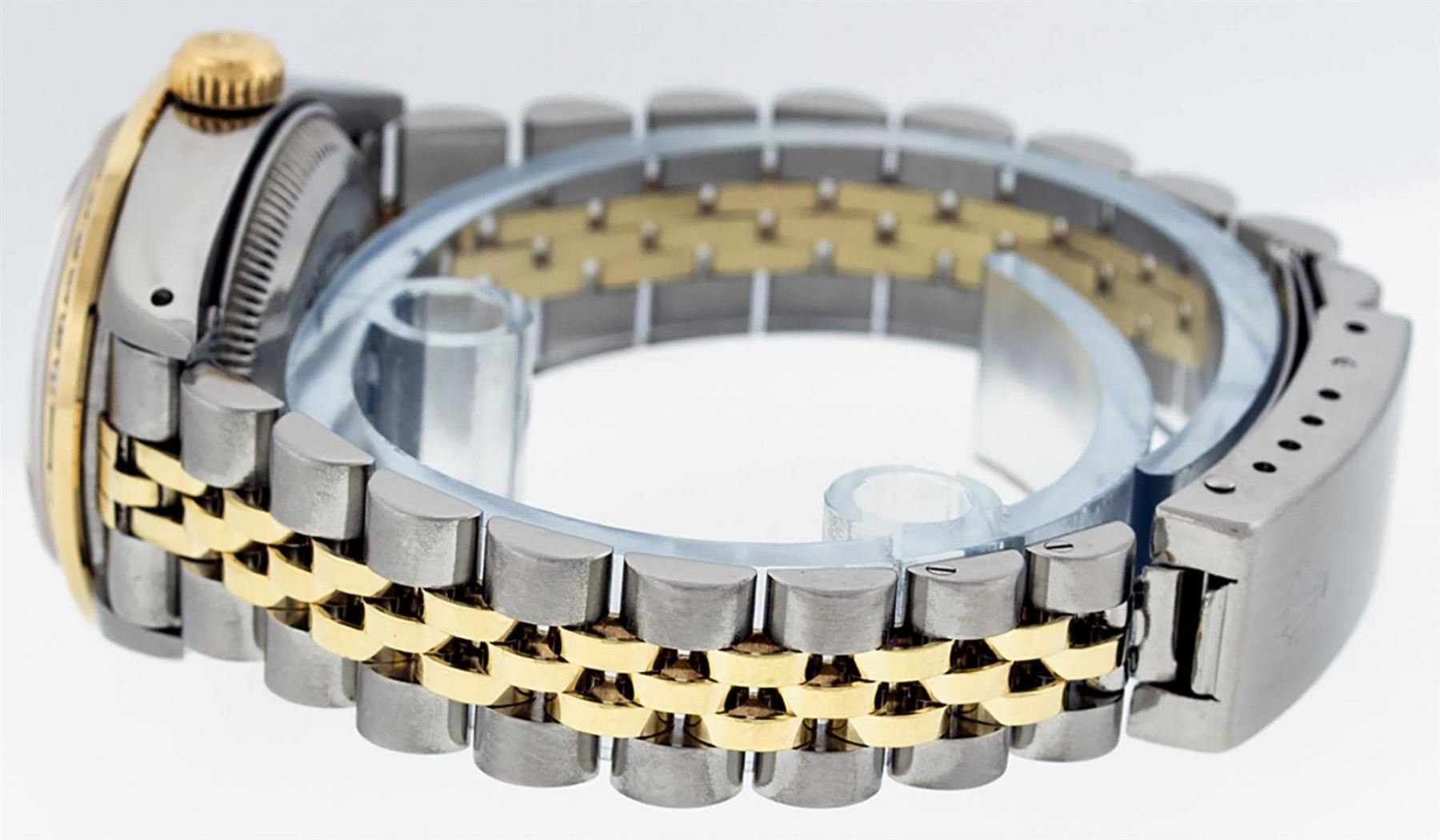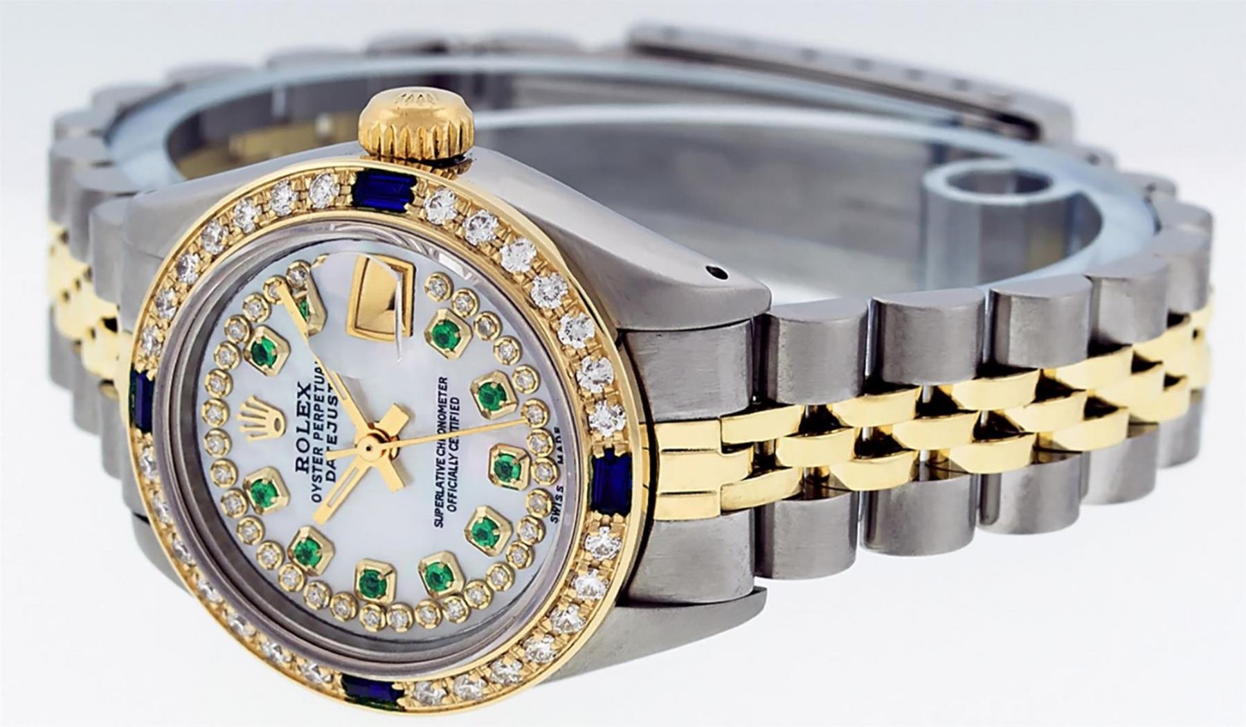 One Ladies Two Tone Rolex Datejust Polished, Serviced & Electronically Tested, Yellow Gold & Stainless Steel Case: 26mm, Yellow Gold Crown, Custom Bezel: New 18K New Yellow Gold Sapphire Beadset Diamond Bezel, Diamond Count: 28 Diamonds + 4 Sapphires In Dial, Total Weight .70 Carat, Clarity: SI-VS, Color: G to H. Custom Crystal: New Scratch Resistant Synthetic Sapphire Cyclops Lens. Custom Hands: New Luminescent Hands. Movement: Automatic Winding Movement. Custom Dial: Mother Of Pearl Emerald String Diamond Dial, Stone Count: 10 Emeralds + 33 Diamonds In Dial, Clarity: SI-VS, Color: G to H. Date Window: 3 O'Clock Position Date Display, Model: Datejust. Condition: G-6 Extra Fine. Bracelet: Two Tone Yellow Gold & Stainless Steel Jubilee Band. Bright Polish. 6.0 Inch Length, Adjustable. Standard Clasp, With Rolex Logo. This Watch Has Been Serviced Time Tested And Is In Excellent Condition It Is Free Of All Scratches And Dents.