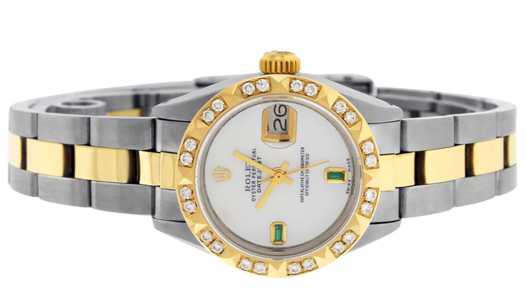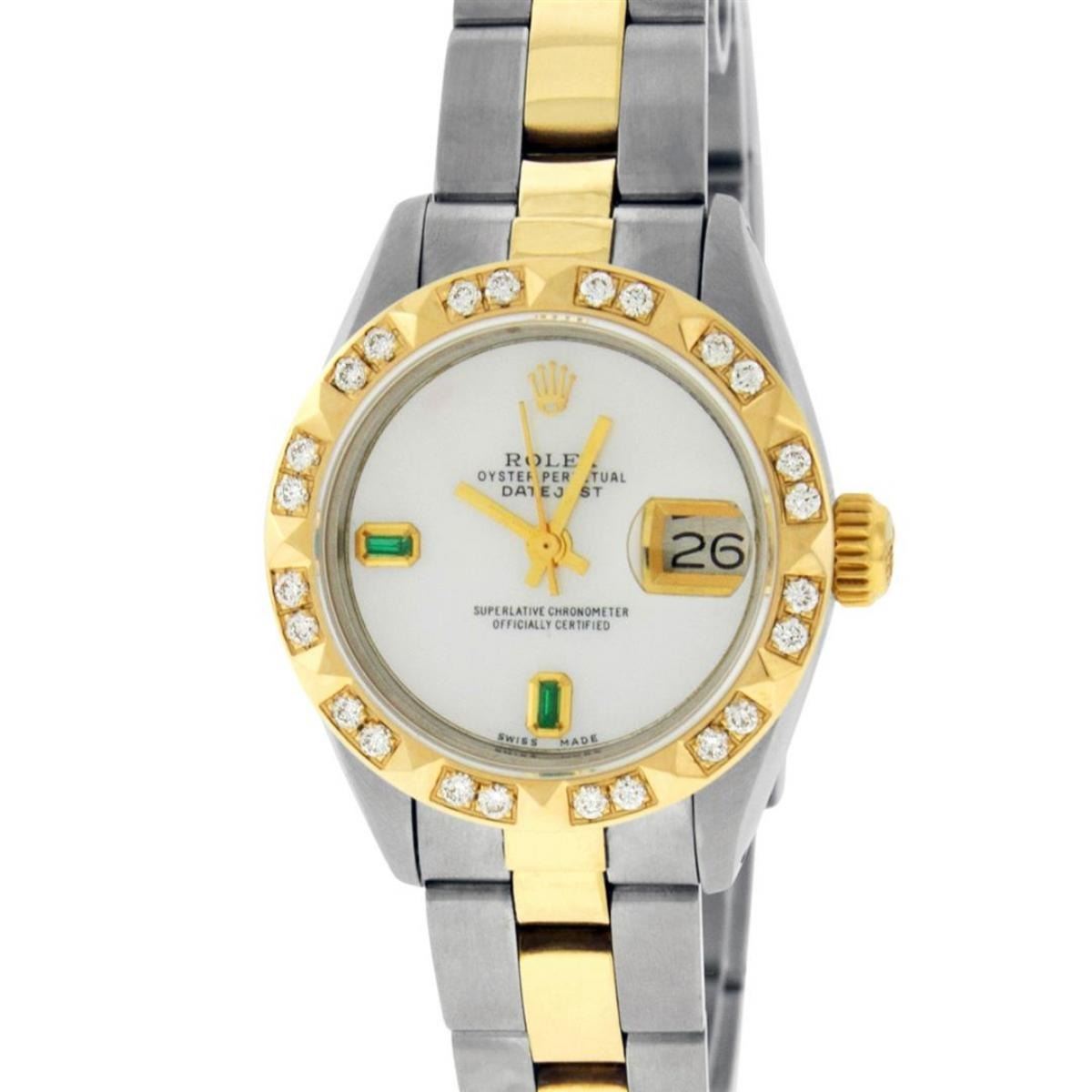 One Ladies Two Tone Rolex Datejust Polished, Serviced & Electronically Tested, Yellow Gold & Stainless Steel Case: 26mm, Yellow Gold Crown, Custom Bezel: New 18K Yellow Gold Pyramid Diamond Bezel, Diamond Count: 24 Diamonds In Bezel. Total Weight .50 Carat, Clarity: SI-VS, Color: G to H. Custom Crystal: New Synthetic Sapphire Cyclops Lens. Custom Hands: New Luminescent Hands. Movement: Automatic Winding Movement. Custom Dial: Mother Of Pearl With Synthetic Emeralds, Stone Count: 2 Synthetic Emeralds. Date Window: 3 O'Clock Position Date Display, Model: Datejust. Condition: G-6 Extra Fine. Bracelet: Two Tone Yellow Gold & Stainless Steel Jubilee Band. Bright Polish. 6.0 Inch Length, Adjustable. Standard Clasp, With Rolex Logo. This Watch Has Been Serviced Time Tested And Is In Excellent Condition It Is Free Of All Scratches And Dents.