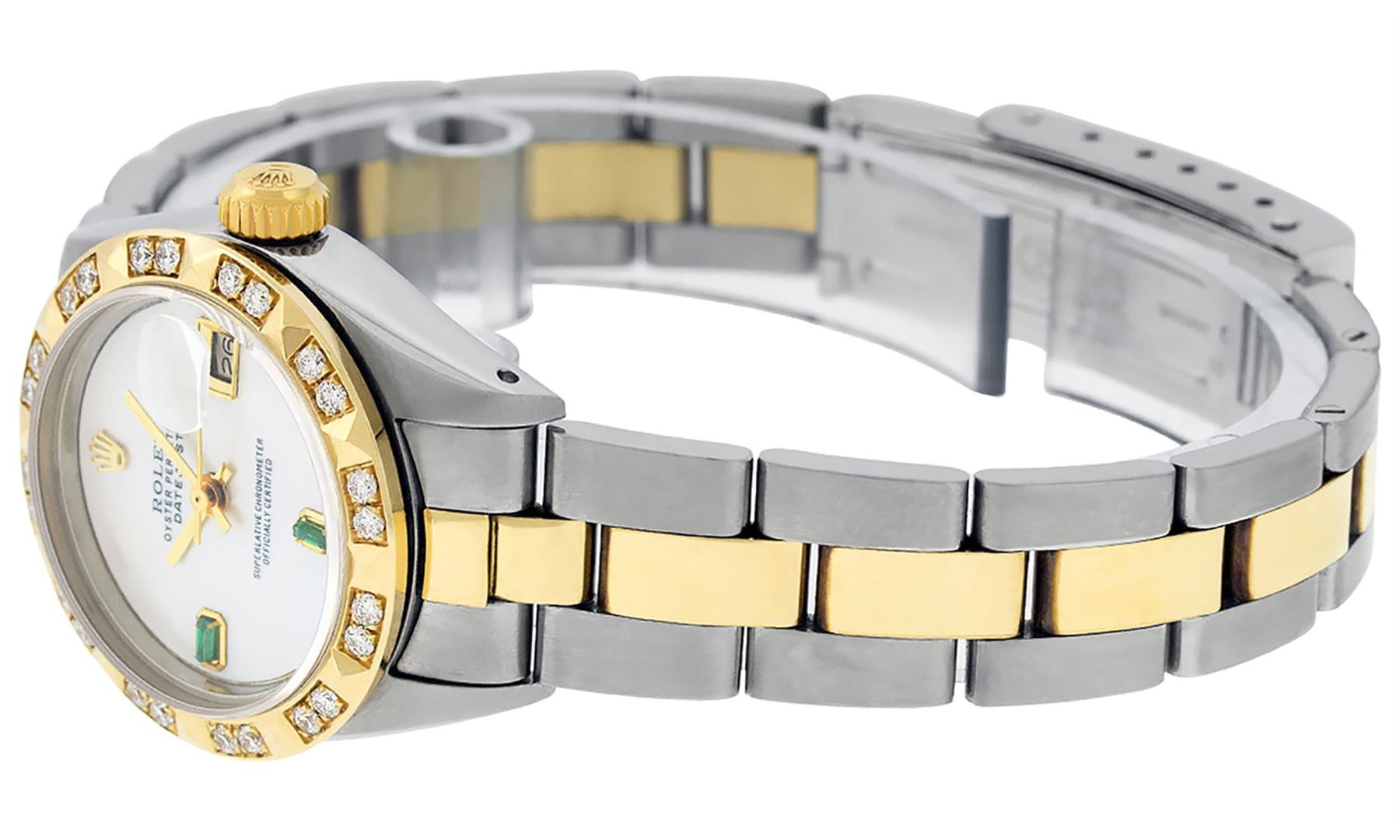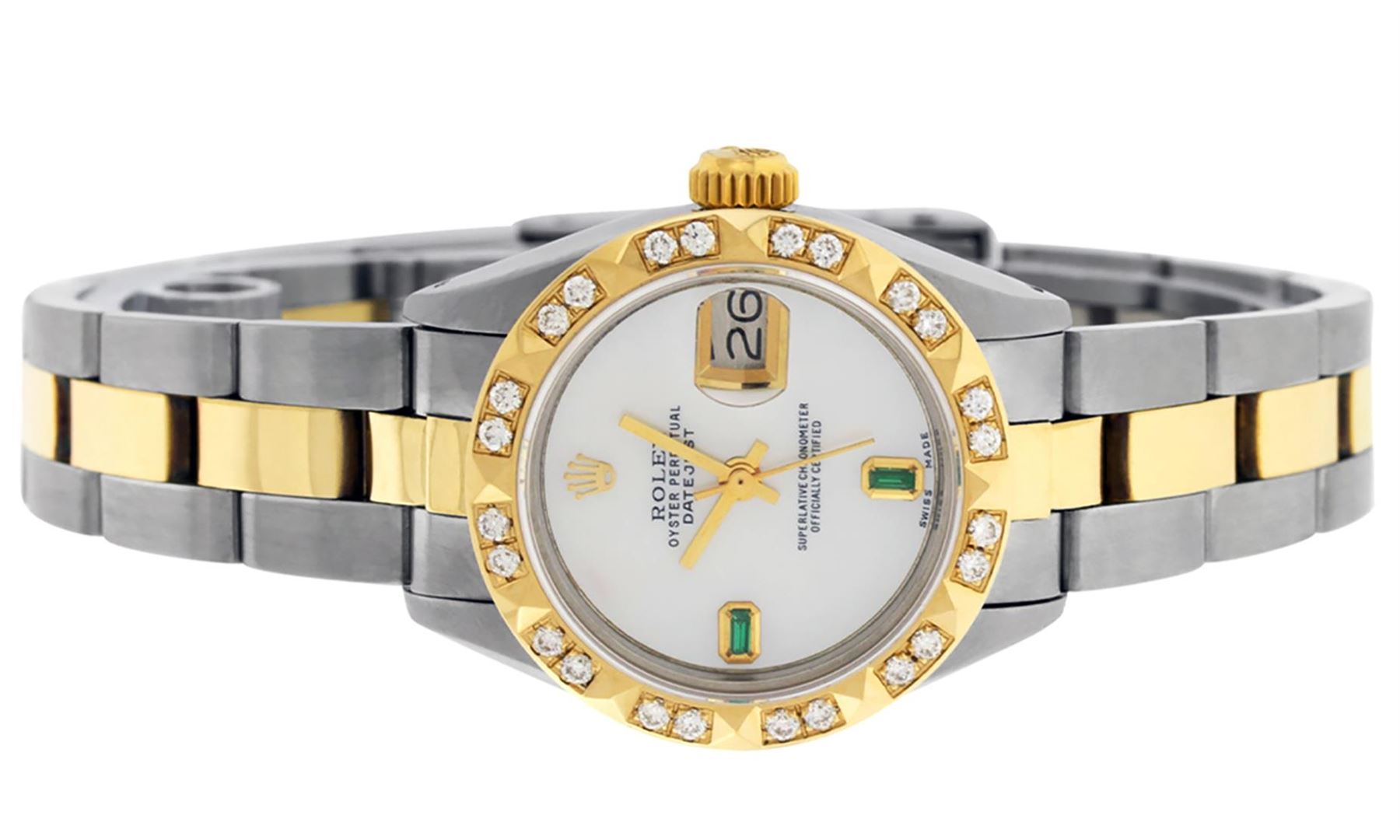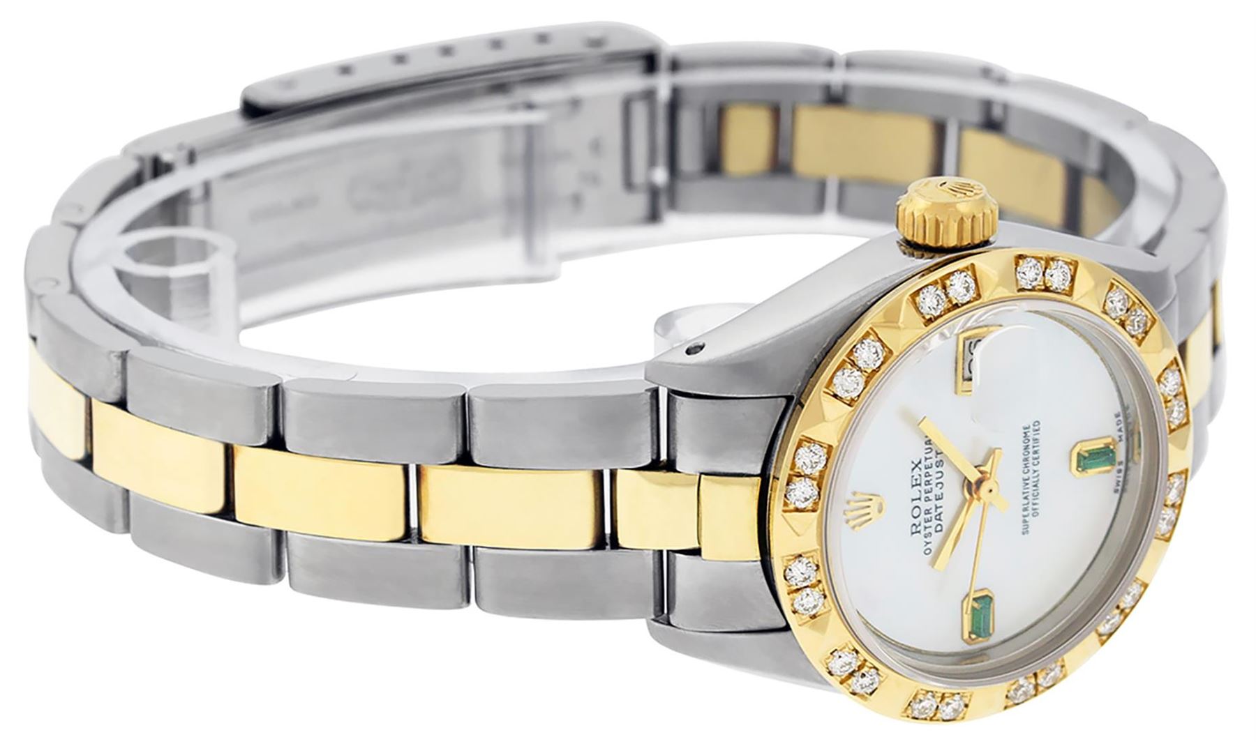 One Ladies Two Tone Rolex Datejust Polished, Serviced & Electronically Tested, Yellow Gold & Stainless Steel Case: 26mm, Yellow Gold Crown, Custom Bezel: New 18K Yellow Gold Pyramid Diamond Bezel, Diamond Count: 24 Diamonds In Bezel. Total Weight .50 Carat, Clarity: SI-VS, Color: G to H. Custom Crystal: New Synthetic Sapphire Cyclops Lens. Custom Hands: New Luminescent Hands. Movement: Automatic Winding Movement. Custom Dial: Mother Of Pearl With Synthetic Emeralds, Stone Count: 2 Synthetic Emeralds. Date Window: 3 O'Clock Position Date Display, Model: Datejust. Condition: G-6 Extra Fine. Bracelet: Two Tone Yellow Gold & Stainless Steel Jubilee Band. Bright Polish. 6.0 Inch Length, Adjustable. Standard Clasp, With Rolex Logo. This Watch Has Been Serviced Time Tested And Is In Excellent Condition It Is Free Of All Scratches And Dents.