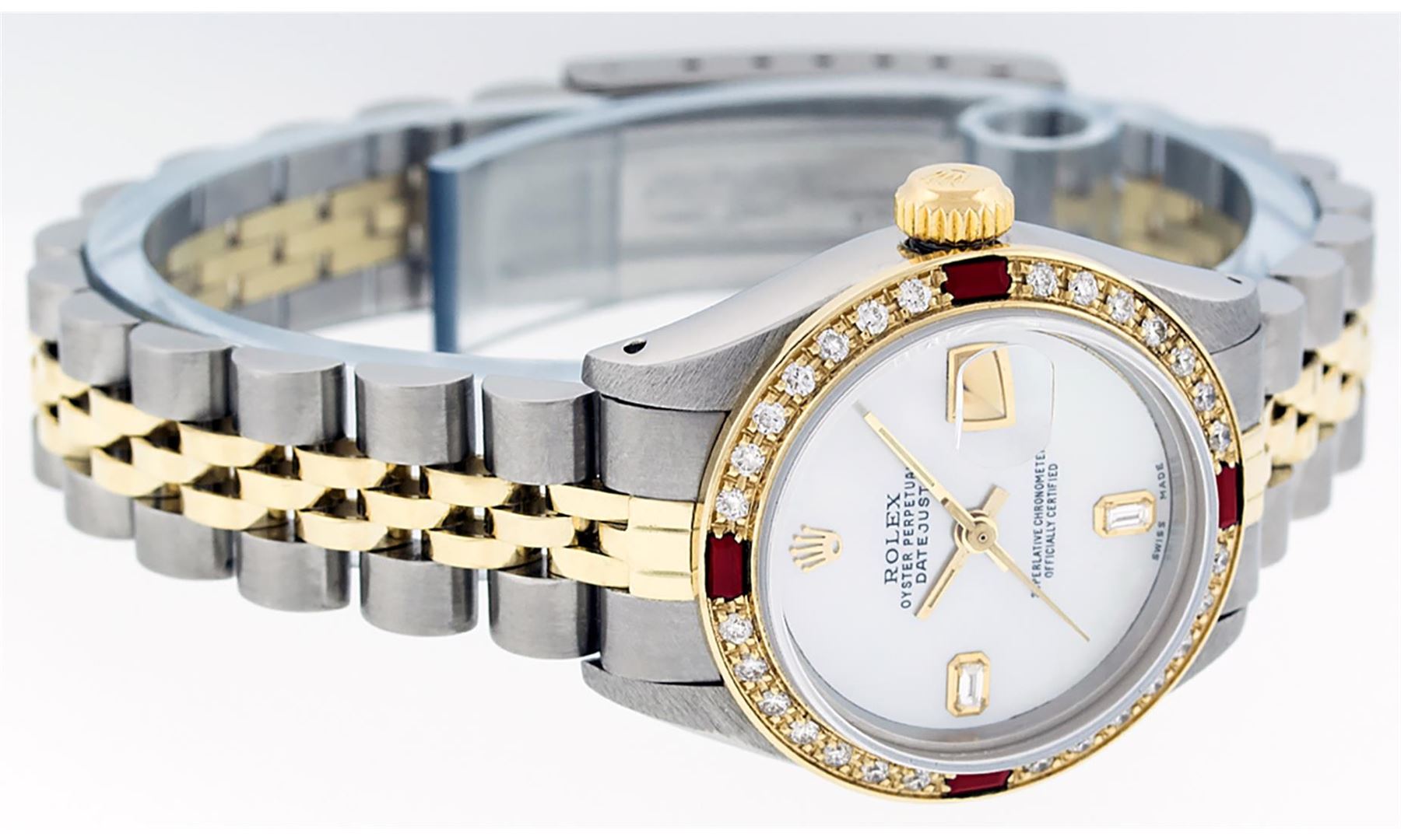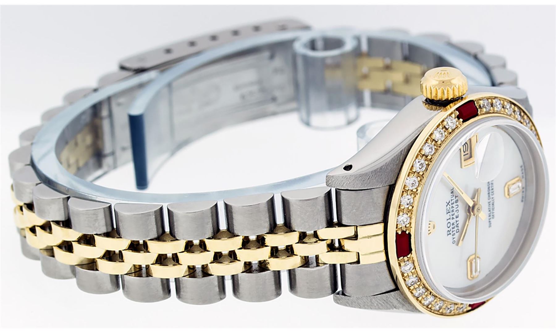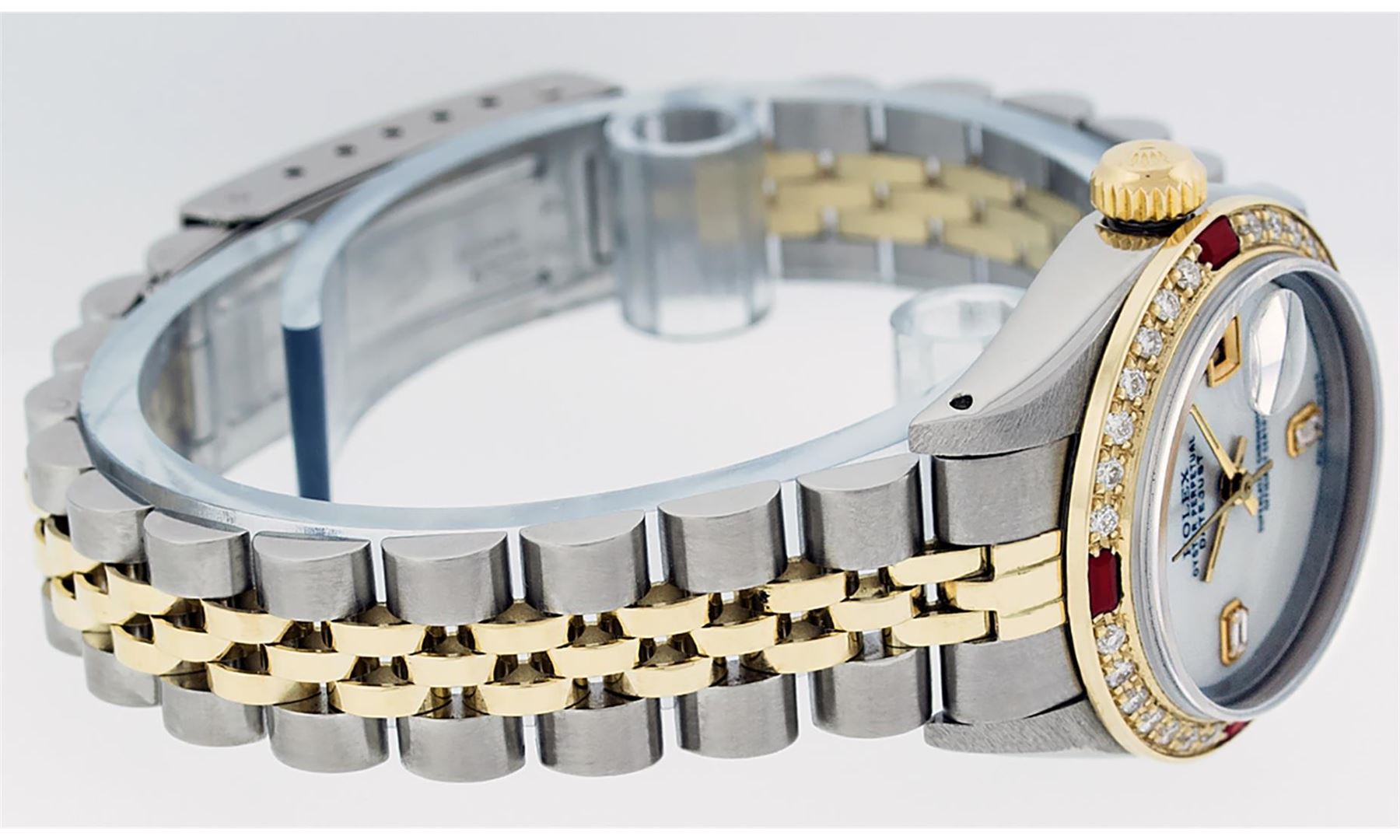 One Ladies Pre Owned Two Tone Rolex Datejust Polished, Serviced & Electronically Tested, Yellow Gold & Stainless Steel Case: 26mm, Yellow Gold Crown, Custom Bezel: New 18K Yellow Gold Sapphire Beadset Diamond Bezel, Diamond Count: 28 Diamonds + 4 Sapphire