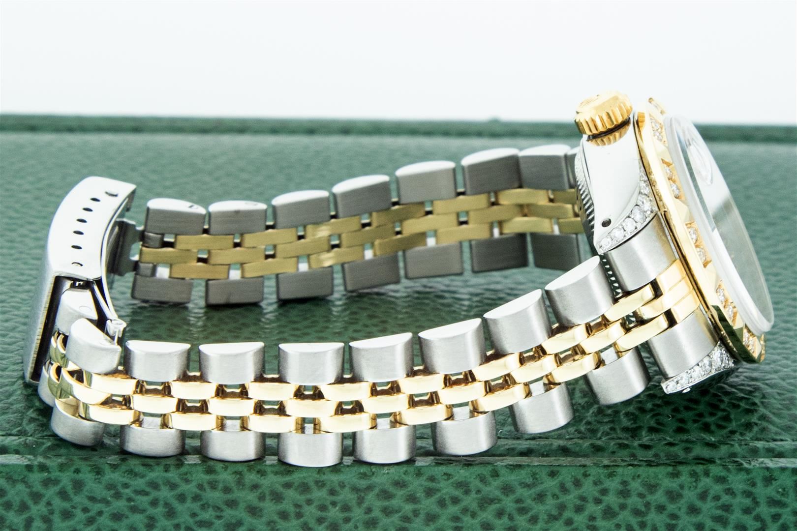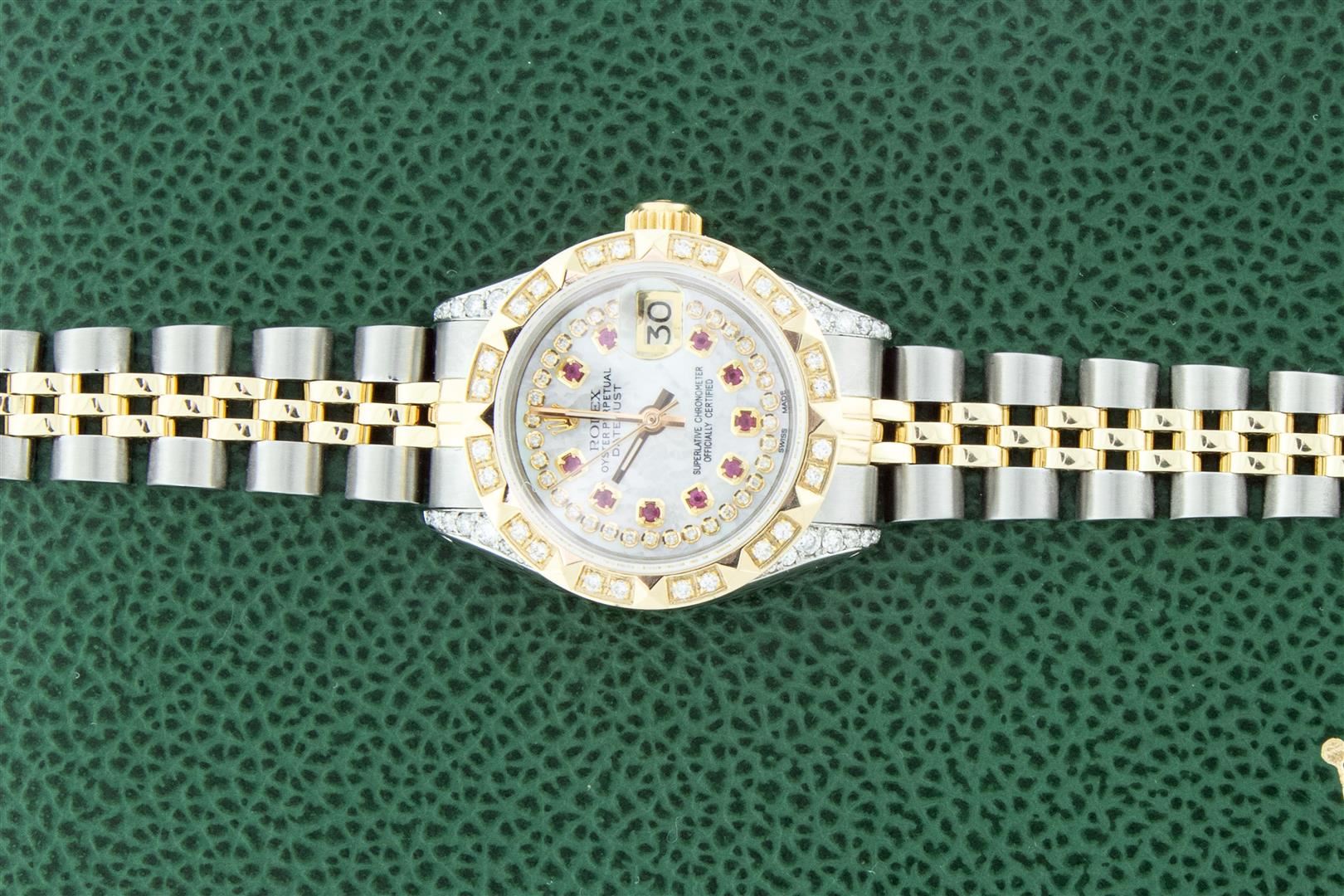 One Ladies Two Tone Rolex Datejust Polished, Serviced & Electronically Tested, Yellow Gold & Stainless Steel Case: 26mm, Yellow Gold Crown, Diamond Lugs: 24 Diamonds On Lugs, Clarity: SI-VS, Color: G to H, Clarity SI-VS. Custom Bezel: New 18K Yellow Gold Pyramid Diamond Bezel, Diamond Count: 24 Diamonds, Total Weight .50 Carat, Clarity: SI-VS, Color: G to H. Custom Crystal: New Synthetic Scratch Resistant Sapphire Cyclops Lens. Custom Hands: New Luminescent Hands. Movement: Automatic Winding Movement. Custom Dial: Mother Of Pearl With Ruby Hour Markers, Stone Count: 10 Rubies + 33 Diamonds In Dial, Clarity: SI-VS, Color: G to H. Date Window: 3 O'Clock Position Date Display, Model: Datejust. Condition: G-6 Extra Fine. Bracelet: Two Tone Yellow Gold & Stainless Steel Jubilee. Bright Polish. 6.0 Inch Length, Adjustable. Standard Clasp, With Rolex Logo. This Watch Has Been Serviced Time Tested And Is In Excellent Condition It Is Free Of All Scratches And Dents.This Watch Comes With A Rolex Box.