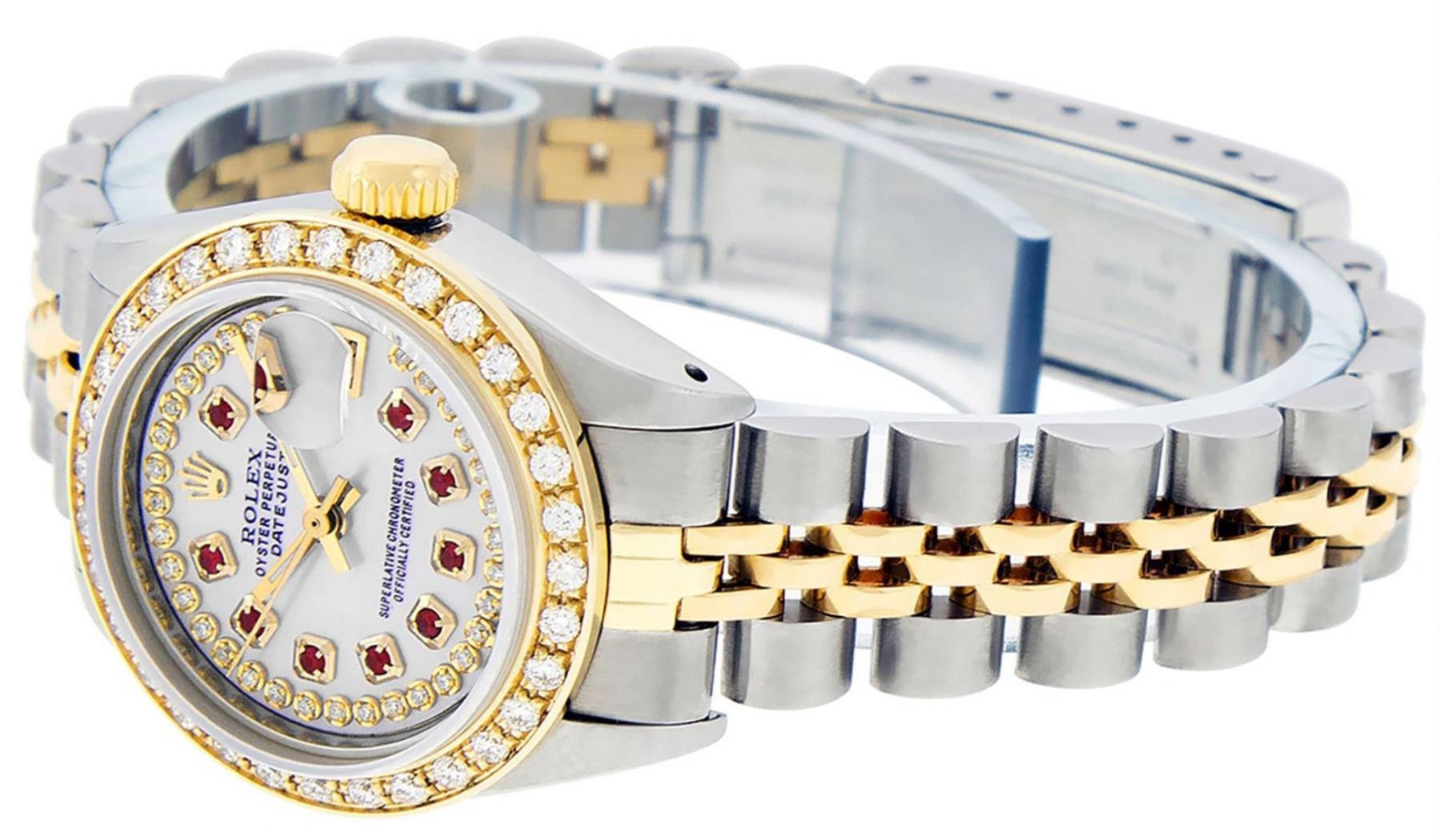 One Ladies Two Tone Rolex Datejust Polished, Serviced & Electronically Tested, Yellow Gold & Stainless Steel Case: 26mm, Yellow Gold Crown, Custom Bezel: New 18K Yellow Gold Beadset Diamond Bezel, Diamond Count: 32 Diamonds In Bezel, Total Weight .70 Carat, Clarity: SI-VS, Color: G to H. Custom Crystal: New Synthetic Sapphire Cyclops Lens. Custom Hands: New Luminescent Hands. Movement: Automatic Winding Movement. Custom Dial: Mother Of Pearl Ruby String Diamond Dial, Stone Count: 10 Rubies + 33 Diamonds In Dial. Clarity: SI-VS, Color: G to H. Date Window: 3 O'Clock Position Date Display, Model: Datejust. Condition: G-6 Extra Fine. Bracelet: Two Tone Yellow Gold & Stainless Steel Jubilee. Bright Polish. 6.0 Inch Length, Adjustable. Standard Clasp, With Rolex Logo. This Watch Has Been Serviced Time Tested And Is In Excellent Condition It Is Free Of All Scratches And Dents.