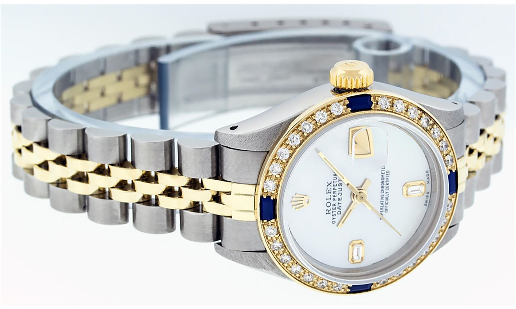 One Ladies Pre Owned Two Tone Rolex Datejust Polished, Serviced & Electronically Tested, Yellow Gold & Stainless Steel Case: 26mm, Yellow Gold Crown, Custom Bezel: New 18K Yellow Gold Sapphire Beadset Diamond Bezel, Diamond Count: 28 Diamonds + 4 Sapphire