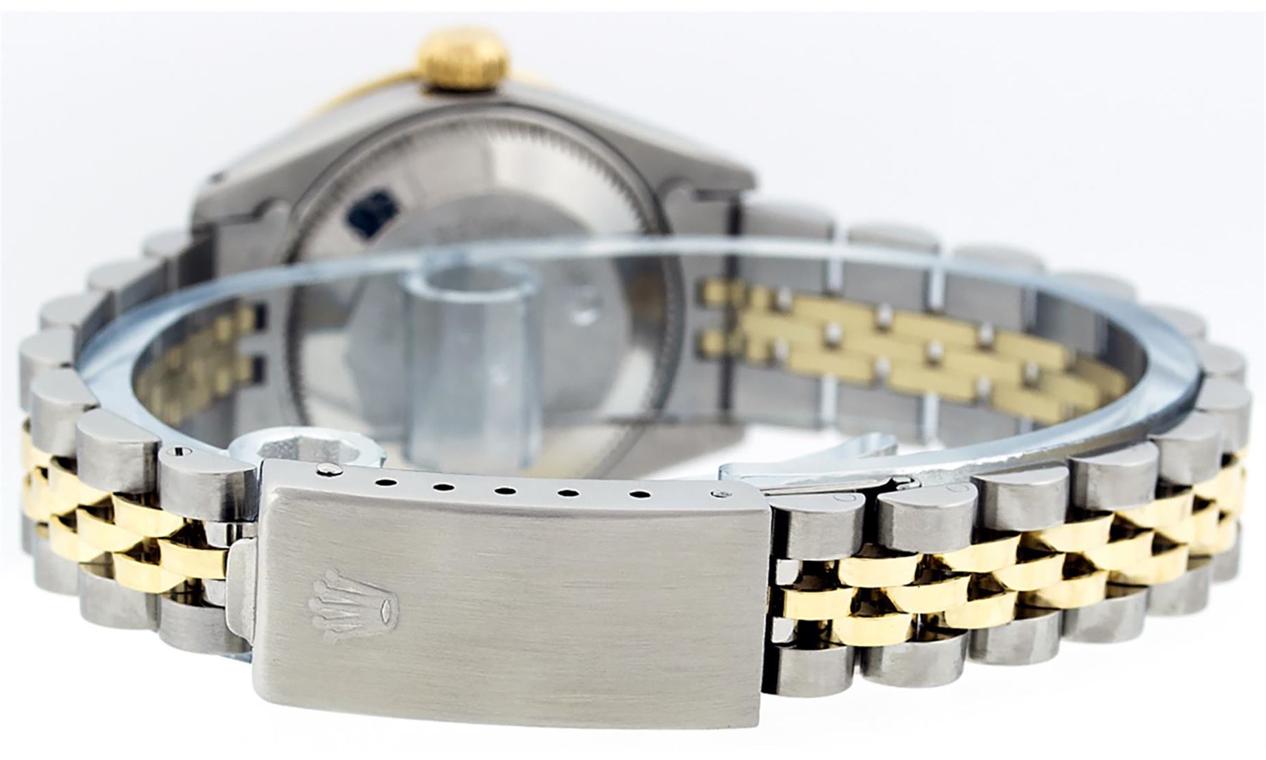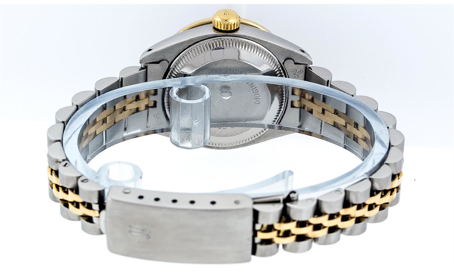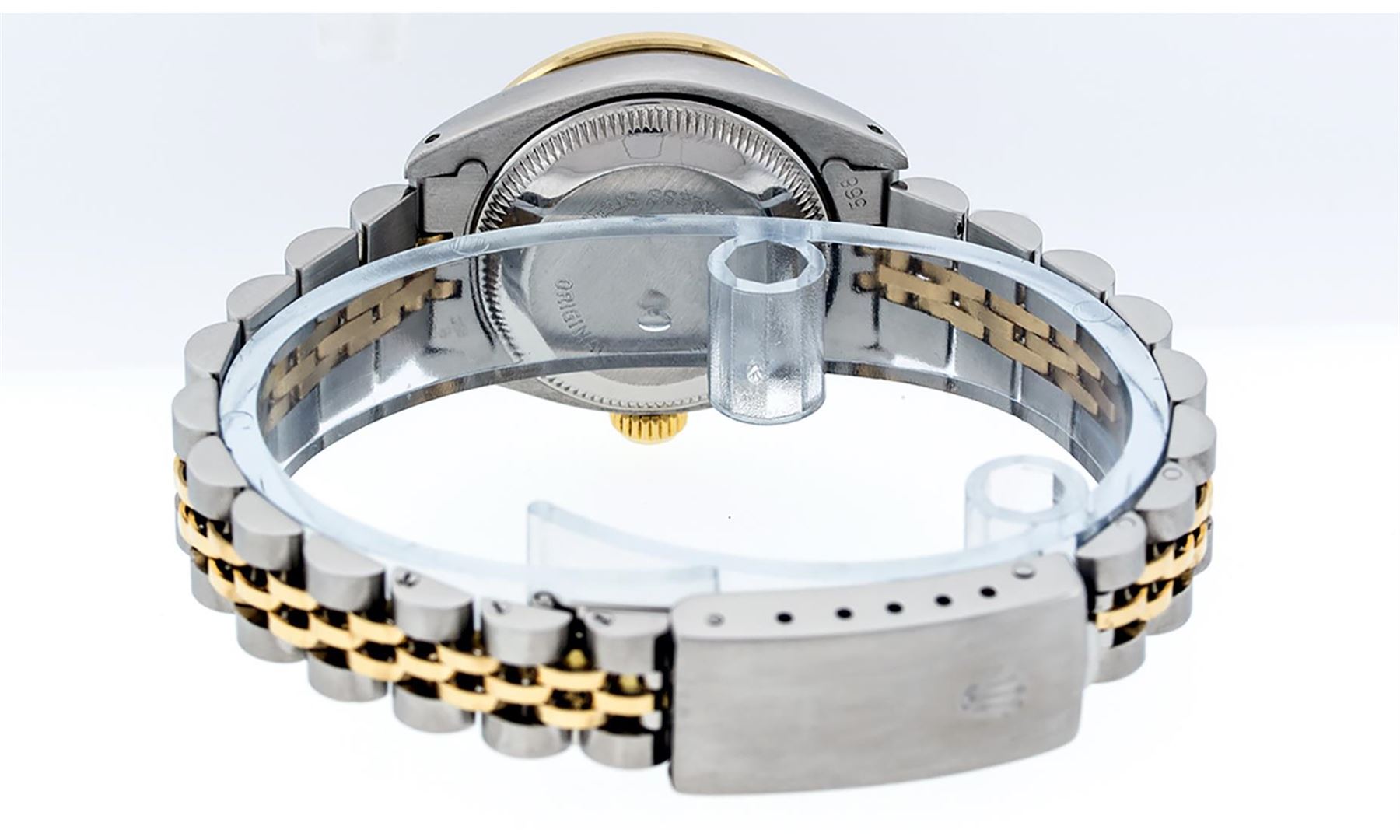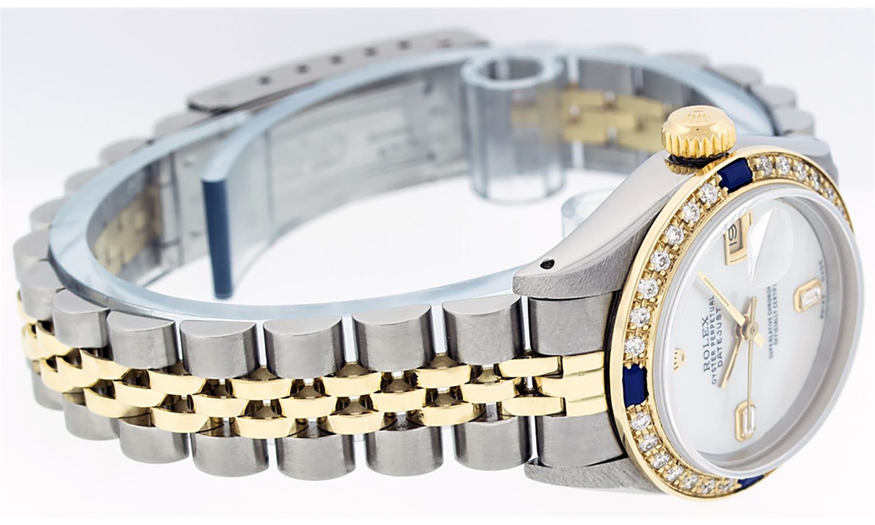 One Ladies Pre Owned Two Tone Rolex Datejust Polished, Serviced & Electronically Tested, Yellow Gold & Stainless Steel Case: 26mm, Yellow Gold Crown, Custom Bezel: New 18K Yellow Gold Sapphire Beadset Diamond Bezel, Diamond Count: 28 Diamonds + 4 Sapphire