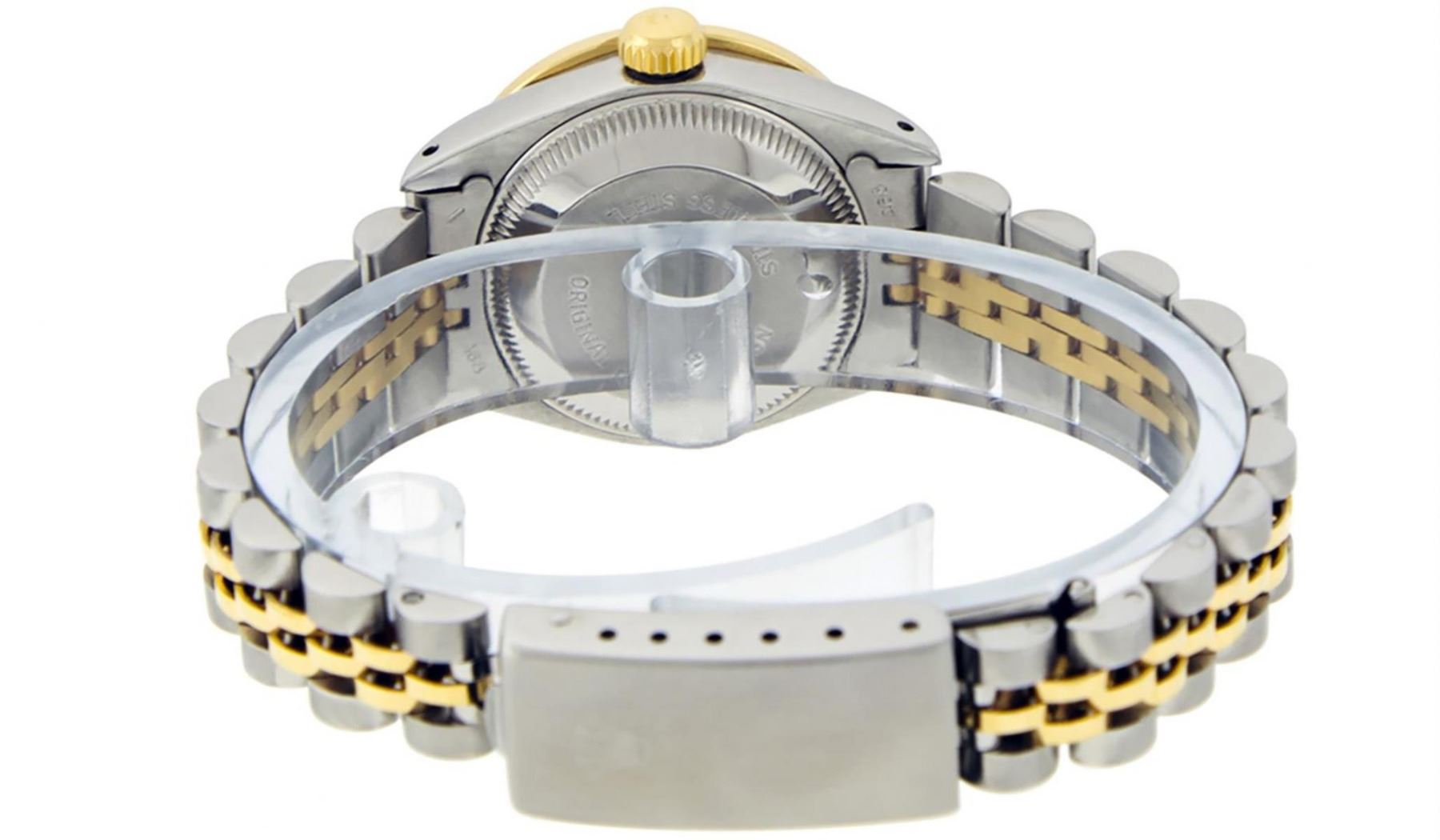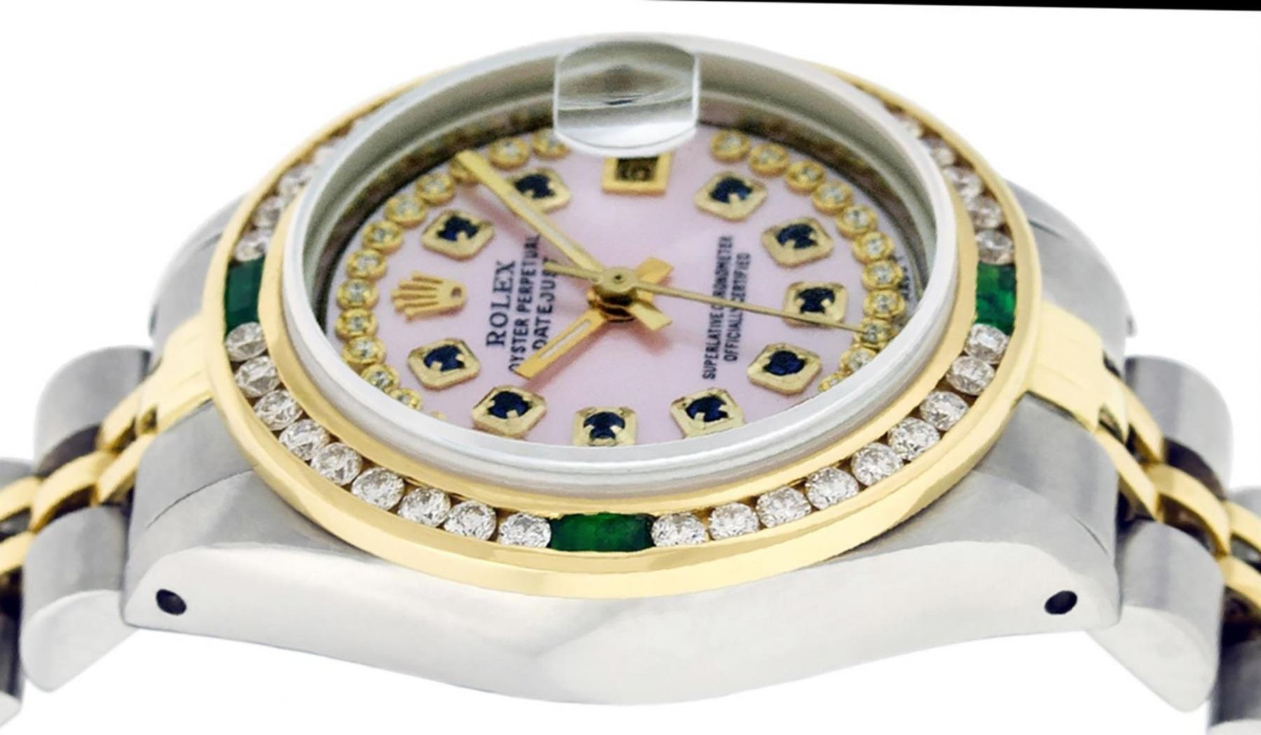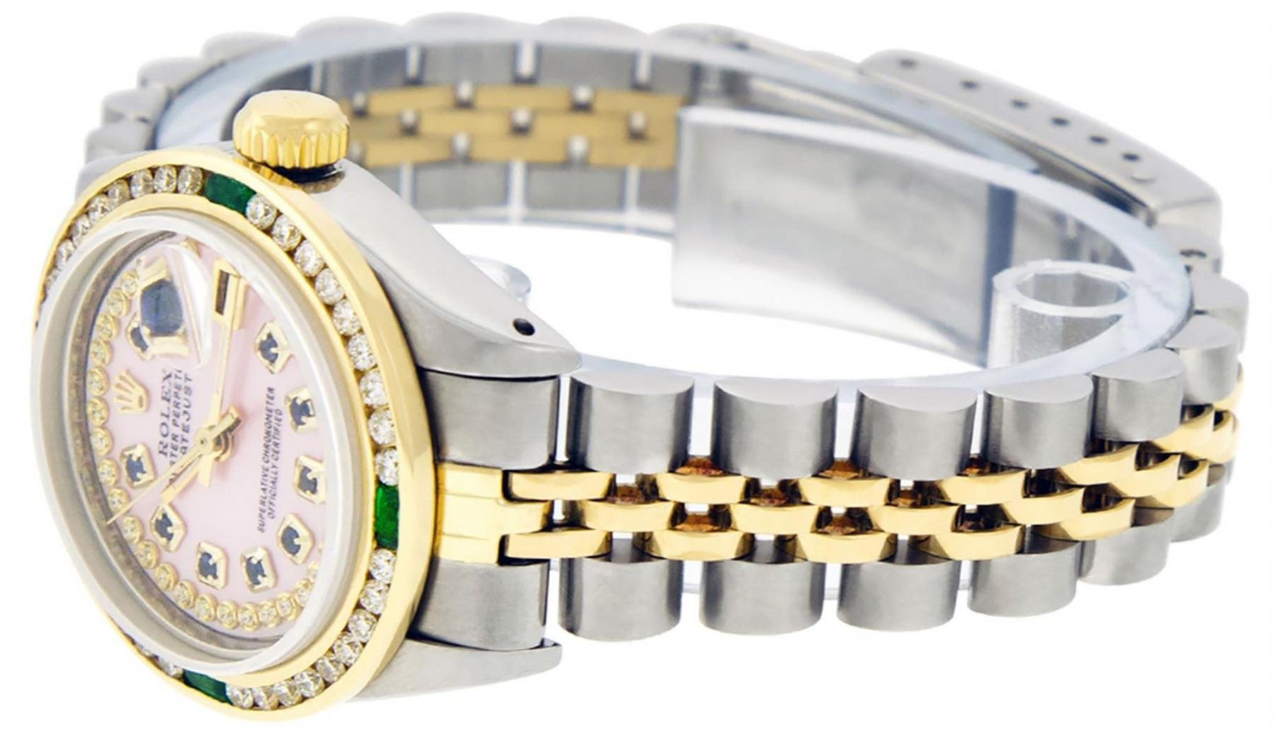 One Ladies Two Tone Rolex Oyster Perpetual Datejust Polished, Serviced & Electronically Tested, Yellow Gold & Stainless Steel Case: 26mm, Yellow Gold Crown, Custom Bezel: New 18K Yellow Gold Emerald Channel Set Diamond Bezel, Diamond + Gem Count: 36 Diamonds + 4 Emeralds, Total Weight 1.00 Carat, Clarity: SI-VS, Color: G to H. Custom Crystal: New Synthetic Sapphire Cyclops Lens. Custom Hands: New Luminescent Hands. Movement: Automatic Winding Movement. Custom Dial: Pink Mother Of Pearl with Sapphire Diamond Hour Markers, Stone Count: 10 Sapphires + 33 Diamonds In Dial. Date Window: 3 O'Clock Position Date Display, Model: Datejust, Condition: G-6 Extra Fine. Bracelet: Two Tone Yellow Gold & Stainless Steel Jubilee. Bright Polish. 6.0 Inch Length, Adjustable. Standard Clasp, With Rolex Logo. This Watch Has Been Serviced Time Tested And Is In Excellent Condition It Is Free Of All Scratches And Dents.