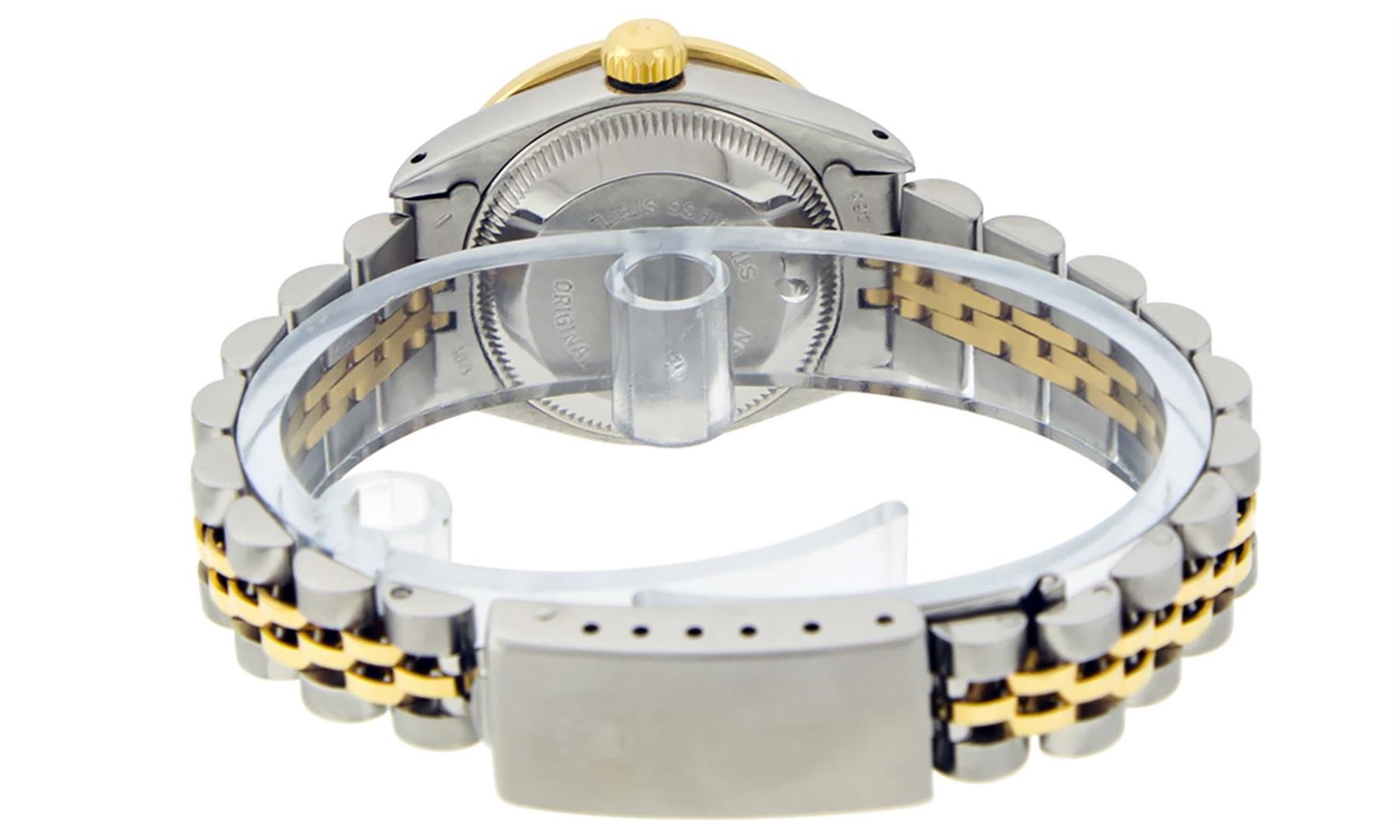 One Ladies Two Tone Rolex Oyster Perpetual Datejust Polished, Serviced & Electronically Tested, Yellow Gold & Stainless Steel Case: 26mm, Yellow Gold Crown, Custom Bezel: New 18K Yellow Gold Emerald Channel Set Diamond Bezel, Diamond + Gem Count: 36 Diamonds + 4 Emeralds, Total Weight 1.00 Carat, Clarity: SI-VS, Color: G to H. Custom Crystal: New Synthetic Sapphire Cyclops Lens. Custom Hands: New Luminescent Hands. Movement: Automatic Winding Movement. Custom Dial: Pink Mother Of Pearl with Sapphire Diamond Hour Markers, Stone Count: 10 Sapphires + 33 Diamonds In Dial. Date Window: 3 O'Clock Position Date Display, Model: Datejust, Condition: G-6 Extra Fine. Bracelet: Two Tone Yellow Gold & Stainless Steel Jubilee. Bright Polish. 6.0 Inch Length, Adjustable. Standard Clasp, With Rolex Logo. This Watch Has Been Serviced Time Tested And Is In Excellent Condition It Is Free Of All Scratches And Dents.
