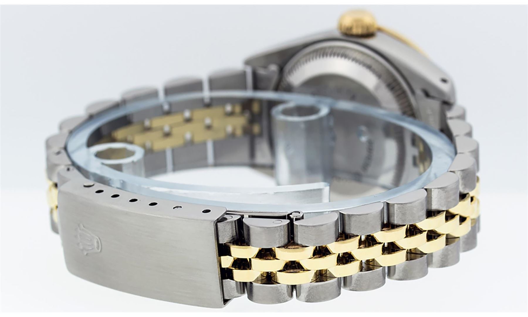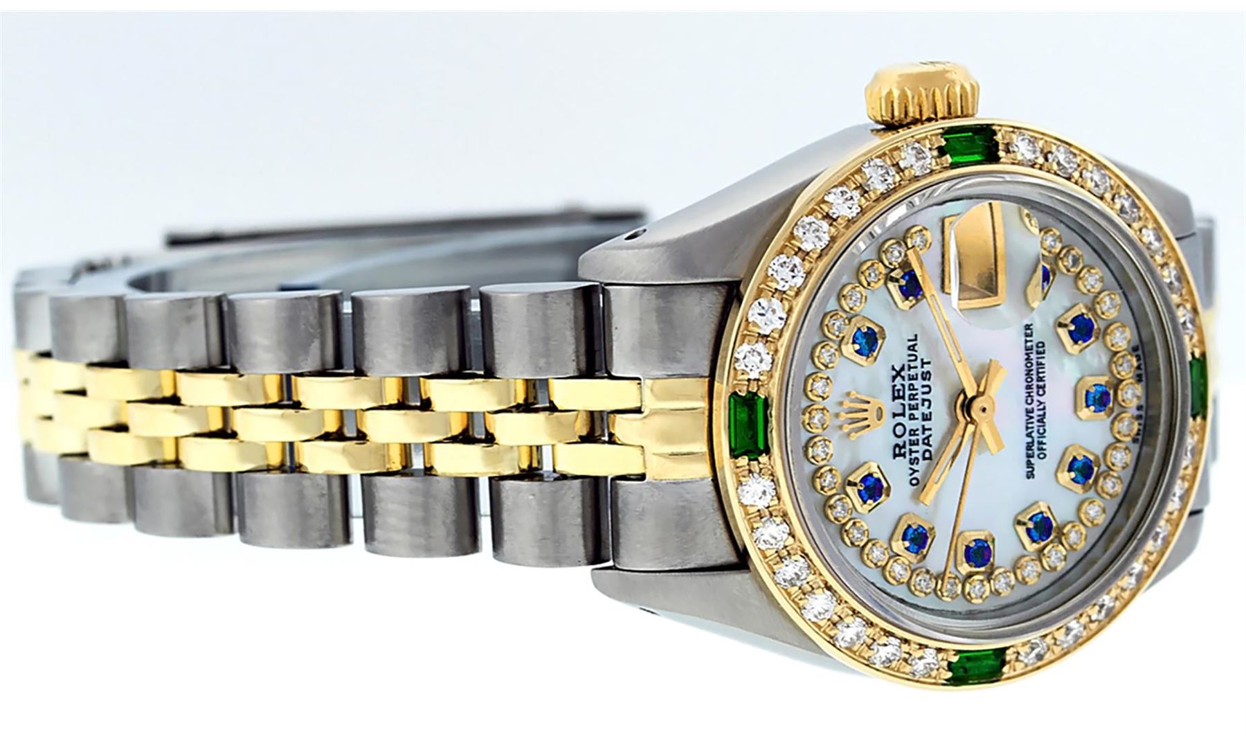 One Ladies Pre Owned Two Tone Rolex Datejust Polished, Serviced & Electronically Tested, Yellow Gold & Stainless Steel Case: 26mm, Yellow Gold Crown, Custom Bezel: New 18K New Yellow Gold Emerald Beadset Diamond Bezel, Diamond Count: 28 Diamonds + 4 Emeralds In Dial, Clarity: SI-VS, Color: G to H. Custom Crystal: New Sapphire With Date Window. Custom Hands: New Luminescent Hands. Rolex Movement: Automatic Winding Movement. Custom Dial: Mother Of Pearl Sapphire String Diamond Dial, Stone Count: 10 Sapphires + 33 Diamonds In Dial, Clarity: SI-VS, Color: G to H. Date Window: 3 Oclock Position Date Display, Model: Datejust. Condition: G-6 Extra Fine. Rolex Bracelet: Two Tone Yellow Gold & Stainless Steel Jubilee Band. Bright Polish. 6.0 Inch Length, Adjustable. Standard Clasp, With Rolex Logo. This Watch Has Been Serviced Time Tested And Is In Excellent Condition It Is Free Of All Scratches And Dents.