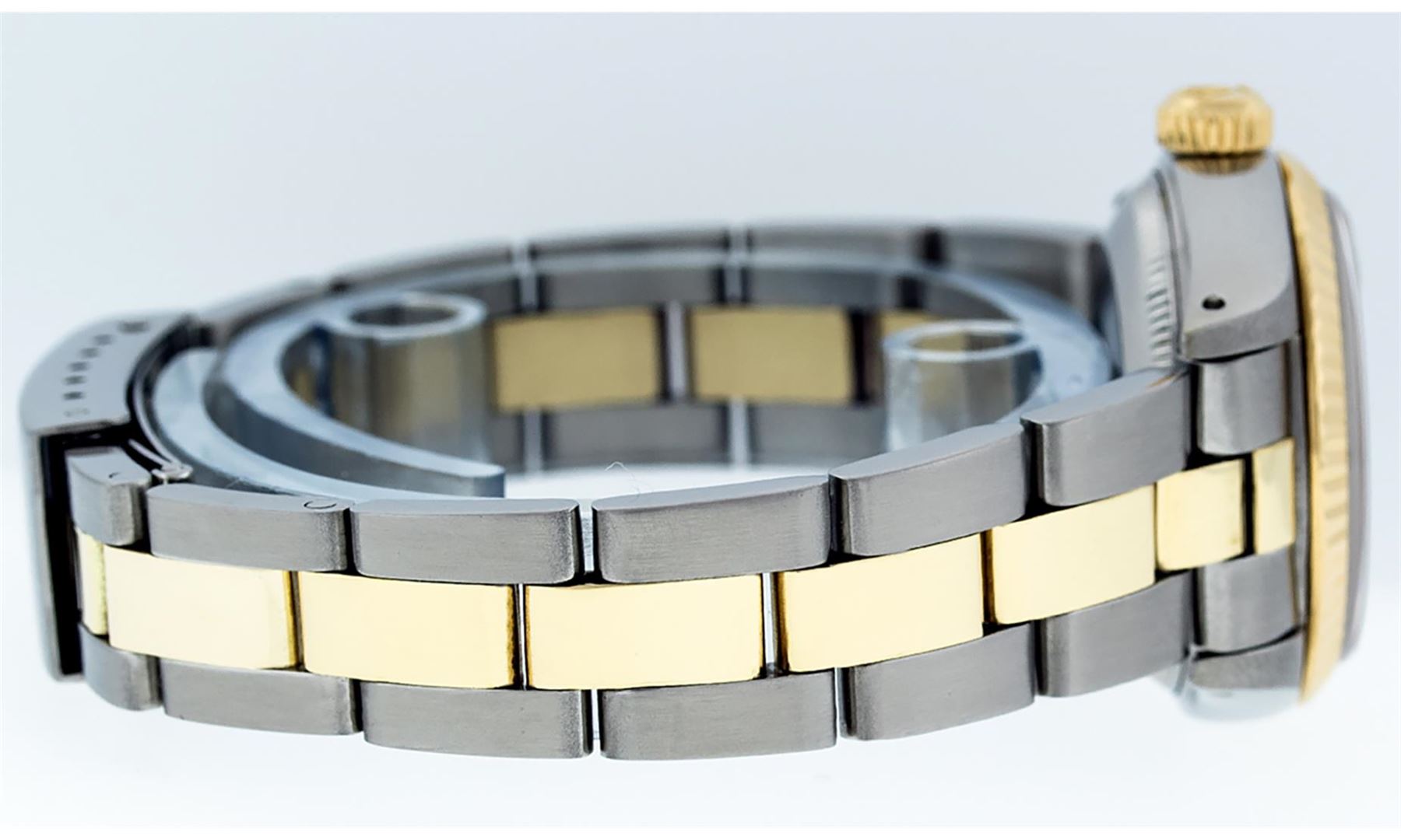 One Ladies Two Tone Yellow Gold And Stainless Steel Rolex Datejust Polished, Serviced & Electronically Tested, Yellow Gold & Stainless Steel Case: 26mm, Yellow Gold Crown, Custom Bezel: New 18K Yellow Gold Beadset Diamond Bezel, Diamond Count: 43 Diamonds On Dial, Total Weight .70 Carat, Clarity: SI-VS, Color: G to H. Custom Crystal: New Scratch Resistant Synthetic Sapphire Cyclops Lens. Custom Hands: New Luminescent Hands. Movement: Automatic Winding Movement. Custom Dial: Mother Of Pearl String Diamond and Sapphire Dial, Stone Count: 33 Diamonds + 10 Sapphires, Clarity: SI-VS, Color: G to H. Date Window: 3 O'Clock Position Date Display, Model: Datejust. Condition: G-6 Extra Fine. Bracelet: Two Tone Yellow Gold & Stainless Steel Jubilee Band. Bright Polish. 6.0 Inch Length, Adjustable. Standard Clasp, With Rolex Logo. This Watch Has Been Serviced Time Tested And Is In Excellent Condition It Is Free Of All Scratches And Dents.