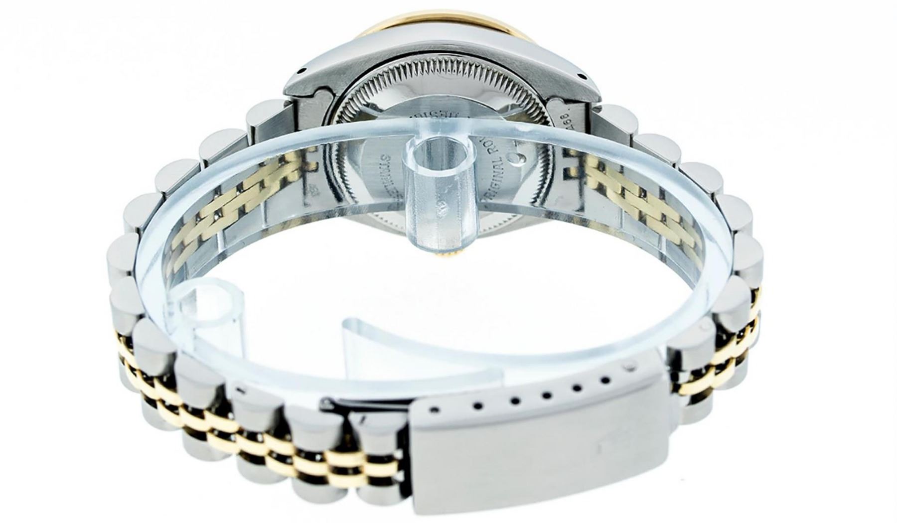 One Ladies Two Tone Rolex Datejust Polished, Serviced & Electronically Tested, Yellow Gold & Stainless Steel Case: 26mm, Yellow Gold Crown, Diamond Lugs: 24 Diamonds On Lugs, Clarity: SI-VS, Color: G to H. Custom Bezel: New 1ctw 18K Yellow Gold Beadset Diamond Bezel, Diamond Count: 42 Diamonds In Bezel, Total Weight 1.00 Carat, Clarity: SI-VS, Color: G to H. Custom Crystal: New Scratch Resistant Synthetic Sapphire Cyclops Lens. Custom Hands: New Luminescent Hands. Movement: Automatic Winding Movement. Custom Dial: Mother Of Pearl String Diamond Dial, Diamond Count: 43 Diamonds In Dial, Clarity: SI-VS, Color: G to H. Date Window: 3 O'Clock Position Date Display, Model: Datejust. Condition: G-6 Extra Fine. Bracelet: Two Tone Yellow Gold & Stainless Steel Jubilee Band. Bright Polish. 6.0 Inch Length, Adjustable. Standard Clasp, With Rolex Logo. This Watch Has Been Serviced Time Tested And Is In Excellent Condition It Is Free Of All Scratches And Dents.