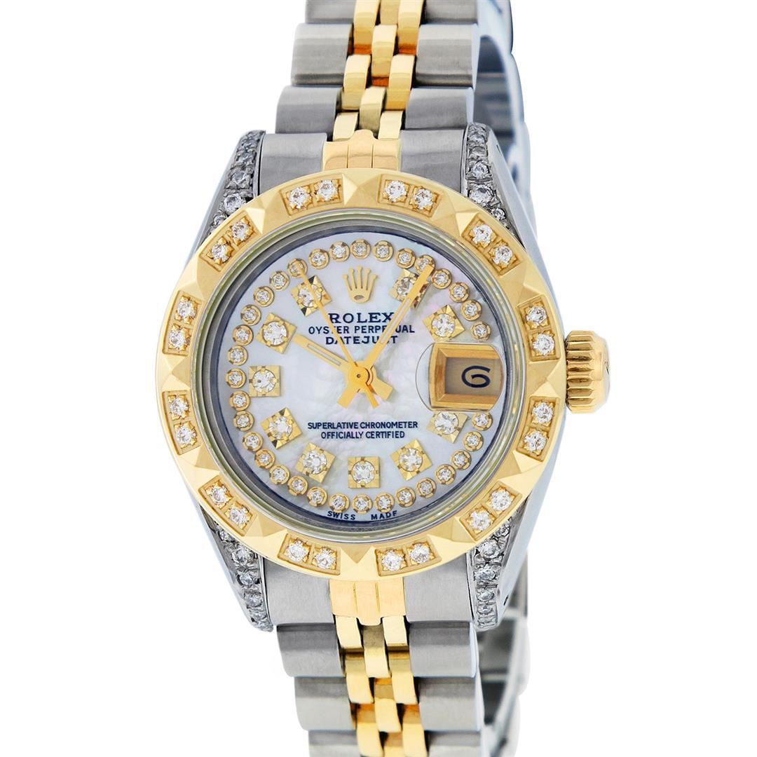 One Ladies Two Tone Rolex Datejust Polished, Serviced & Electronically Tested, Yellow Gold & Stainless Steel Case: 26mm, Yellow Gold Crown, Diamond Lugs: 24 Diamonds On Lugs, Clarity: SI-VS, Color: G to H. Custom Bezel: New 18K Yellow Gold Pyramid Diamond Bezel, Diamond Count: 24 Diamonds On Bezel, Total Weight .50 Carat, Clarity: SI-VS, Color: G to H. Custom Crystal: New Synthetic Scratch Resistant Sapphire Cyclops Lens. Custom Hands: New Luminescent Hands. Movement: Automatic Winding Movement. Custom Dial: Mother Of Pearl With String Single Cut Diamond Hour Markers, Diamond Count: 43 Diamonds On Dial, Clarity: SI-VS, Color: G to H. Date Window: 3 O'Clock Position Date Display, Model: Datejust. Condition: G-6 Extra Fine. Bracelet: Two Tone Yellow Gold & Stainless Steel Jubilee Band. Bright Polish. 6.0 Inch Length, Adjustable. Standard Clasp, With Rolex Logo. This Watch Has Been Serviced Time Tested And Is In Excellent Condition It Is Free Of All Scratches And Dents.