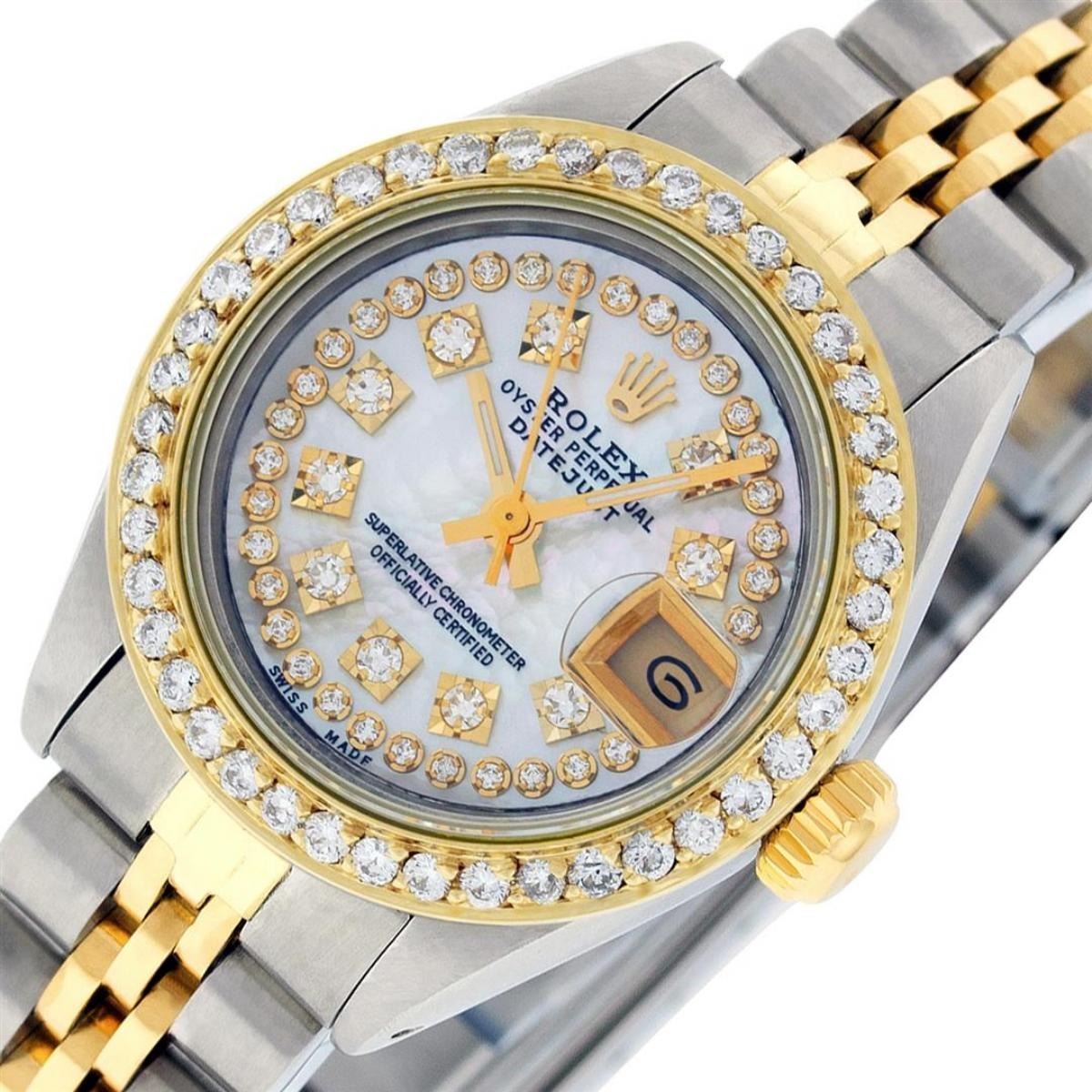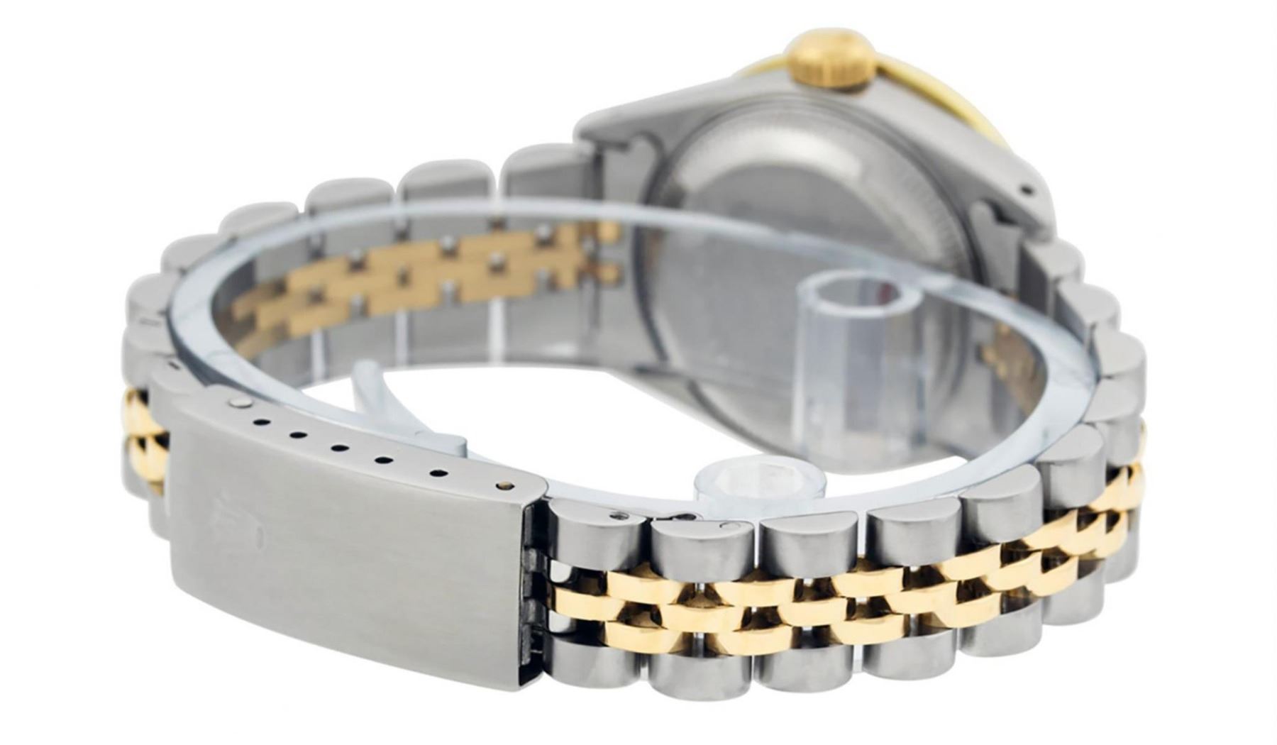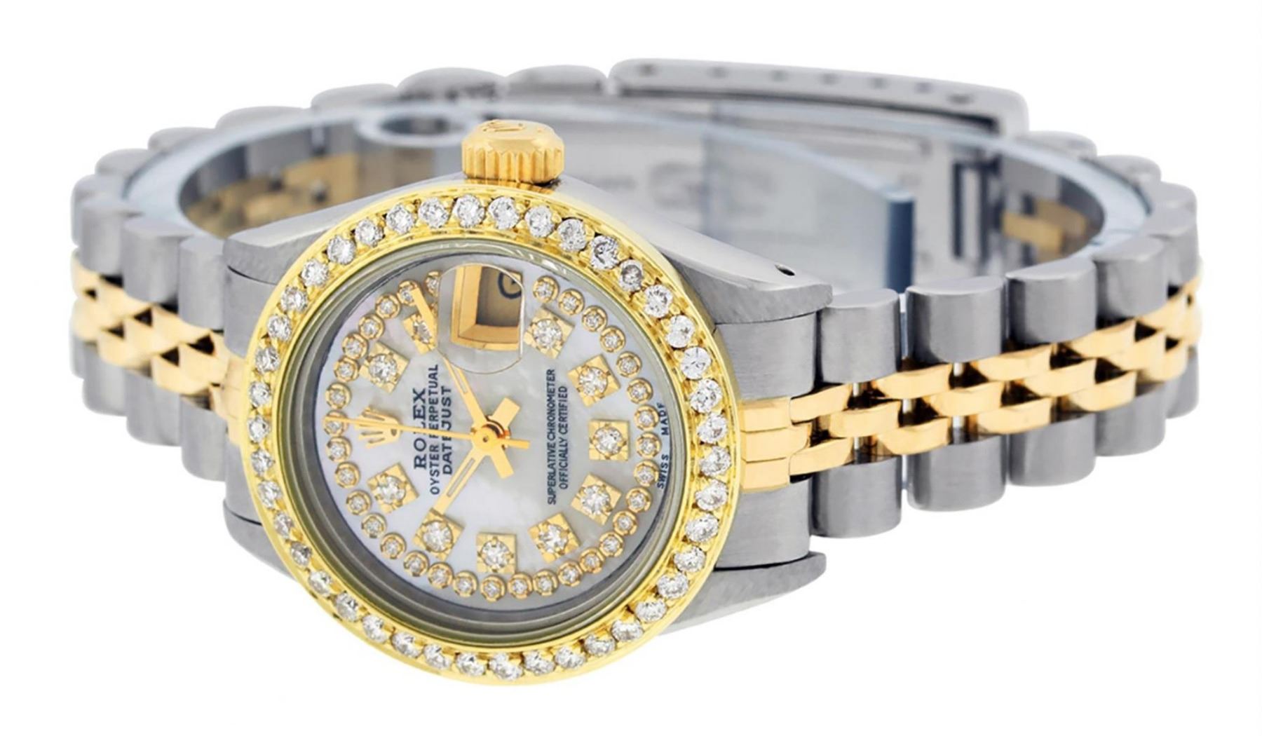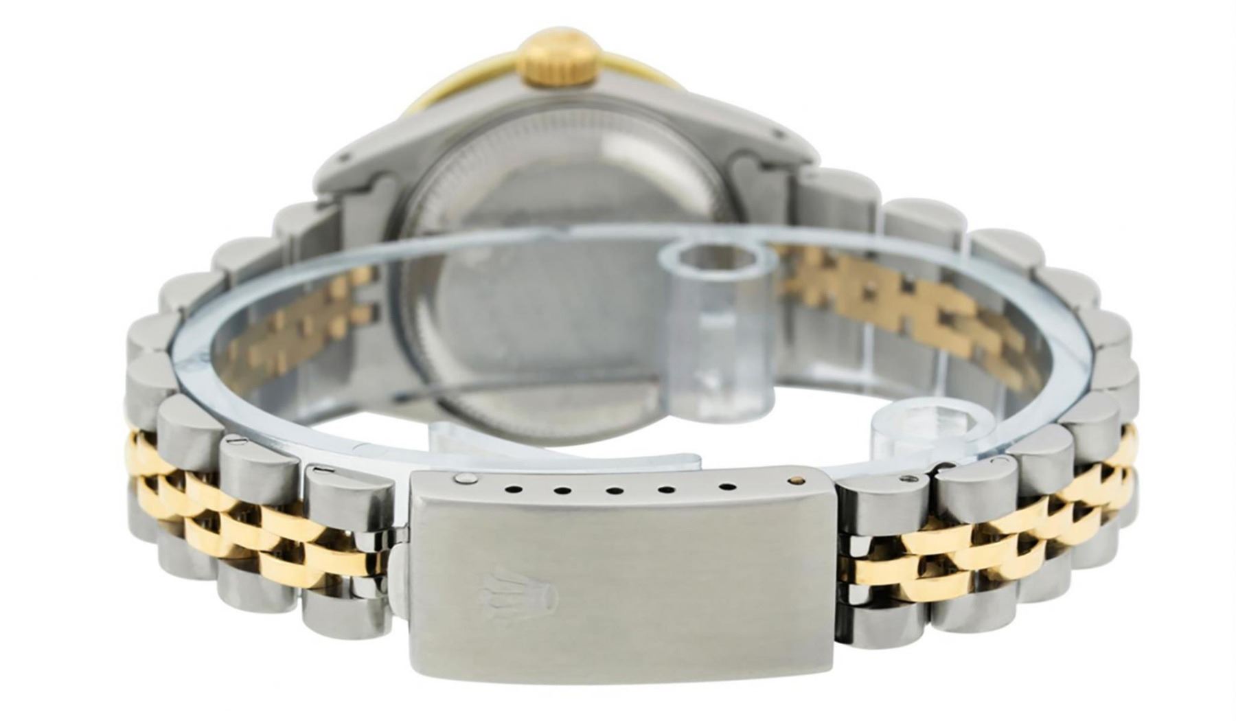 One Ladies Two Tone Rolex Datejust Polished, Serviced & Electronically Tested, Yellow Gold & Stainless Steel Case: 26mm, Yellow Gold Crown, Custom Bezel: New 18K 1ctw Yellow Gold Beadset Diamond Bezel, Diamond Count: 44 Diamonds, Total Weight 1.00 Carat, Clarity: Si-VS, Color: G to H. Custom Crystal: New Synthetic Sapphire Cyclops Lens. Custom Hands: New Luminescent Hands. Movement: Automatic Winding Movement. Custom Dial: Mother Of Pearl String Diamond Dial, Diamond Count: 43 Single Cut Diamonds in Dial, G To H In Color, VS Clarity. Date Window: 3 O'Clock Position Date Display, Model: Datejust, Condition: G-6 Extra Fine. Bracelet: Two Tone Yellow Gold & Stainless Steel Jubilee. Bright Polish. 6.0 Inch Length, Adjustable. Standard Clasp, With Rolex Logo. This Watch Has Been Serviced Time Tested And Is In Excellent Condition It Is Free Of All Scratches And Dents.