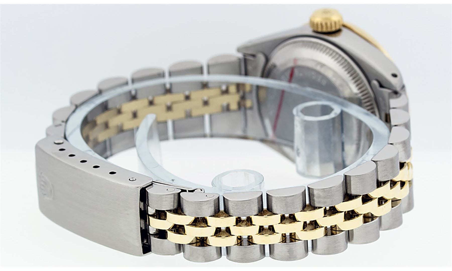 One Ladies Pre Owned Two Tone Rolex Datejust Polished, Serviced & Electronically Tested, Yellow Gold & Stainless Steel Case: 26mm, Yellow Gold Crown, Custom Bezel: New 18K Yellow Gold Beadset Diamond Bezel, Diamond Count: 32 Diamonds, Clarity: SI-VS, Color: G to H. Custom Crystal: New Sapphire With Date Window. Custom Hands: New Luminescent Hands. Rolex Movement: Automatic Winding Movement. Custom Dial: Pink Mother Of Pearl Diamond Dial, Diamond Count: 10 Diamonds in Dial, G To H In Color, VS Clarity. Date Window: 3 O'Clock Position Date Display, Model: Datejust, Condition: G-6 Extra Fine. Rolex Bracelet: Two Tone Yellow Gold & Stainless Steel Jubilee Band. Bright Polish. 6.0 Inch Length, Adjustable. Standard Clasp, With Rolex Logo. This Watch Has Been Serviced Time Tested And Is In Excellent Condition It Is Free Of All Scratches And Dents.