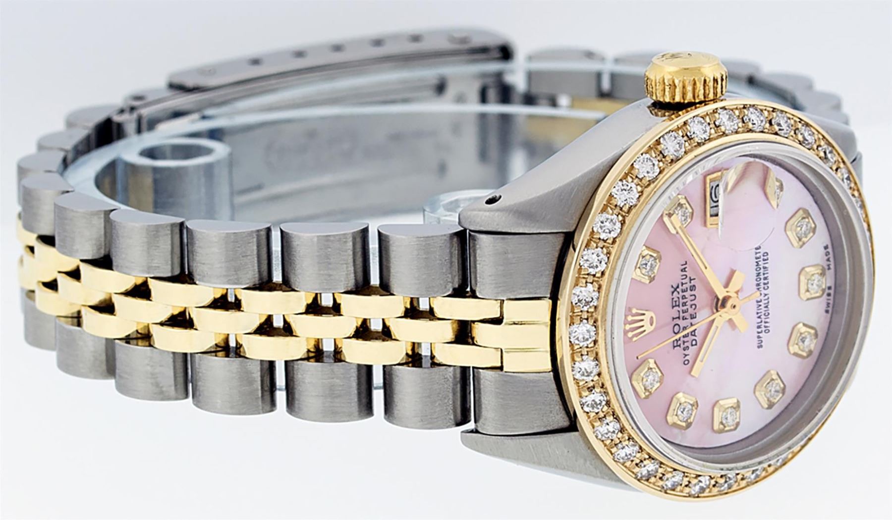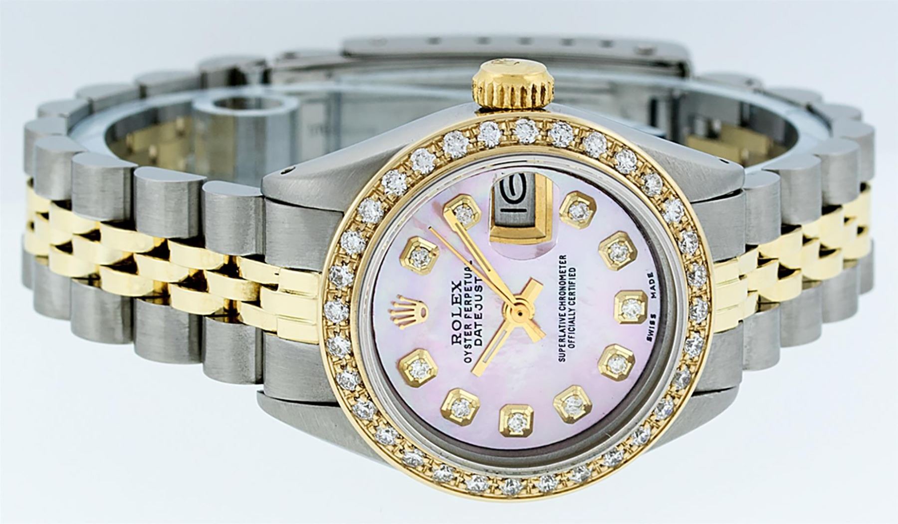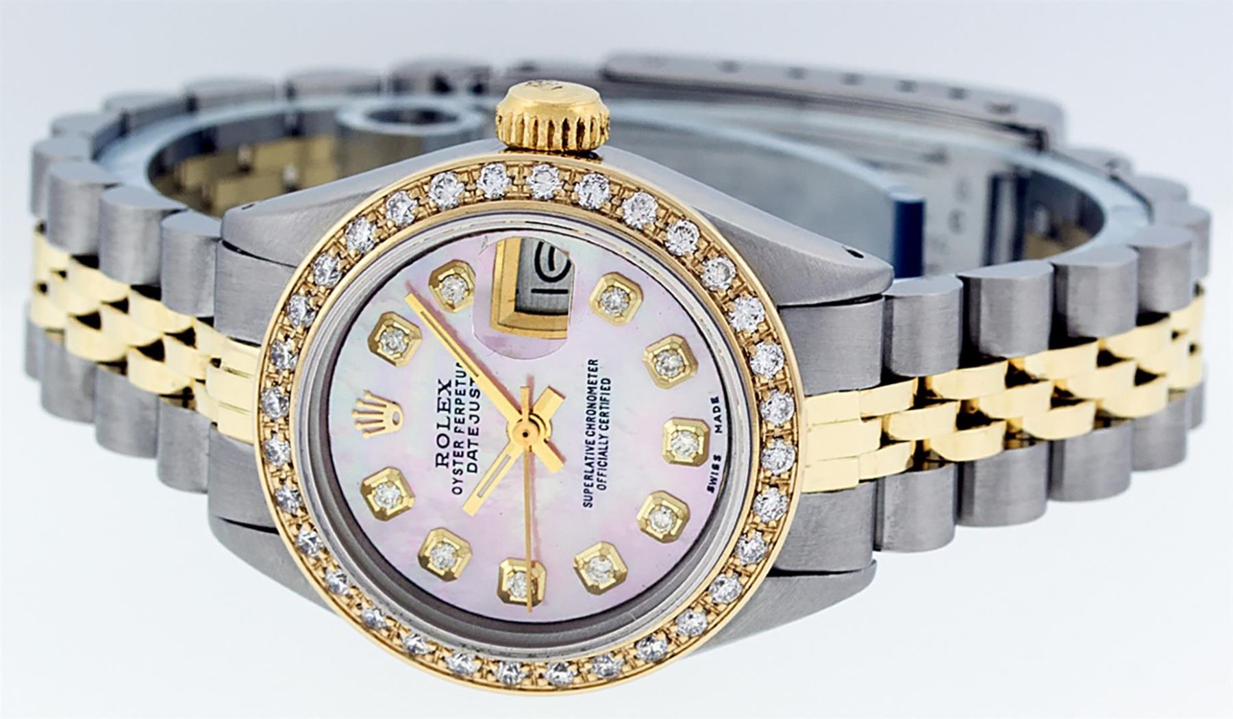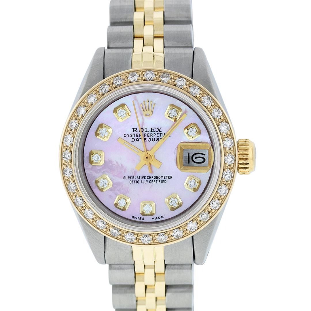 One Ladies Pre Owned Two Tone Rolex Datejust Polished, Serviced & Electronically Tested, Yellow Gold & Stainless Steel Case: 26mm, Yellow Gold Crown, Custom Bezel: New 18K Yellow Gold Beadset Diamond Bezel, Diamond Count: 32 Diamonds, Clarity: SI-VS, Color: G to H. Custom Crystal: New Sapphire With Date Window. Custom Hands: New Luminescent Hands. Rolex Movement: Automatic Winding Movement. Custom Dial: Pink Mother Of Pearl Diamond Dial, Diamond Count: 10 Diamonds in Dial, G To H In Color, VS Clarity. Date Window: 3 O'Clock Position Date Display, Model: Datejust, Condition: G-6 Extra Fine. Rolex Bracelet: Two Tone Yellow Gold & Stainless Steel Jubilee Band. Bright Polish. 6.0 Inch Length, Adjustable. Standard Clasp, With Rolex Logo. This Watch Has Been Serviced Time Tested And Is In Excellent Condition It Is Free Of All Scratches And Dents.
