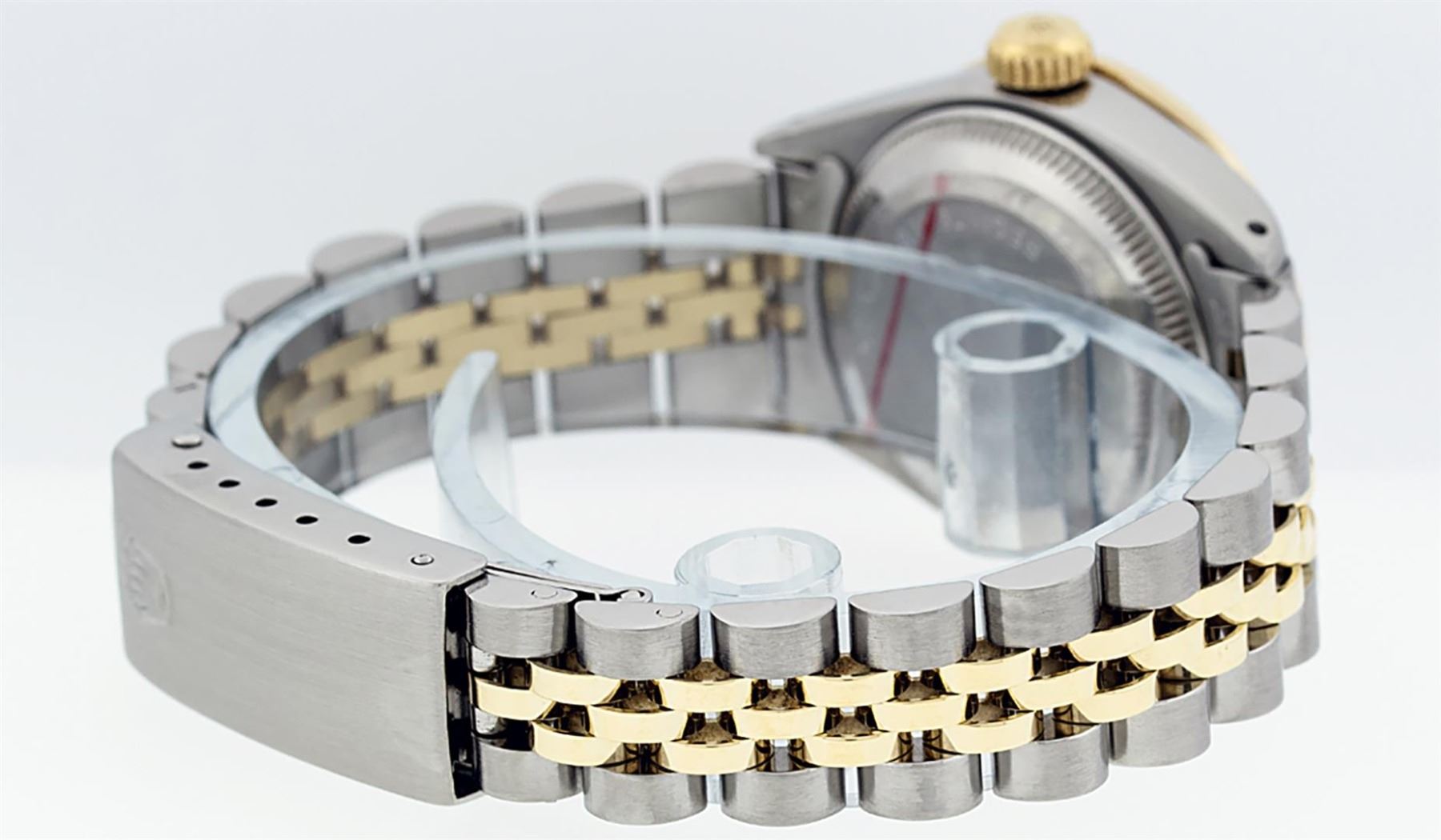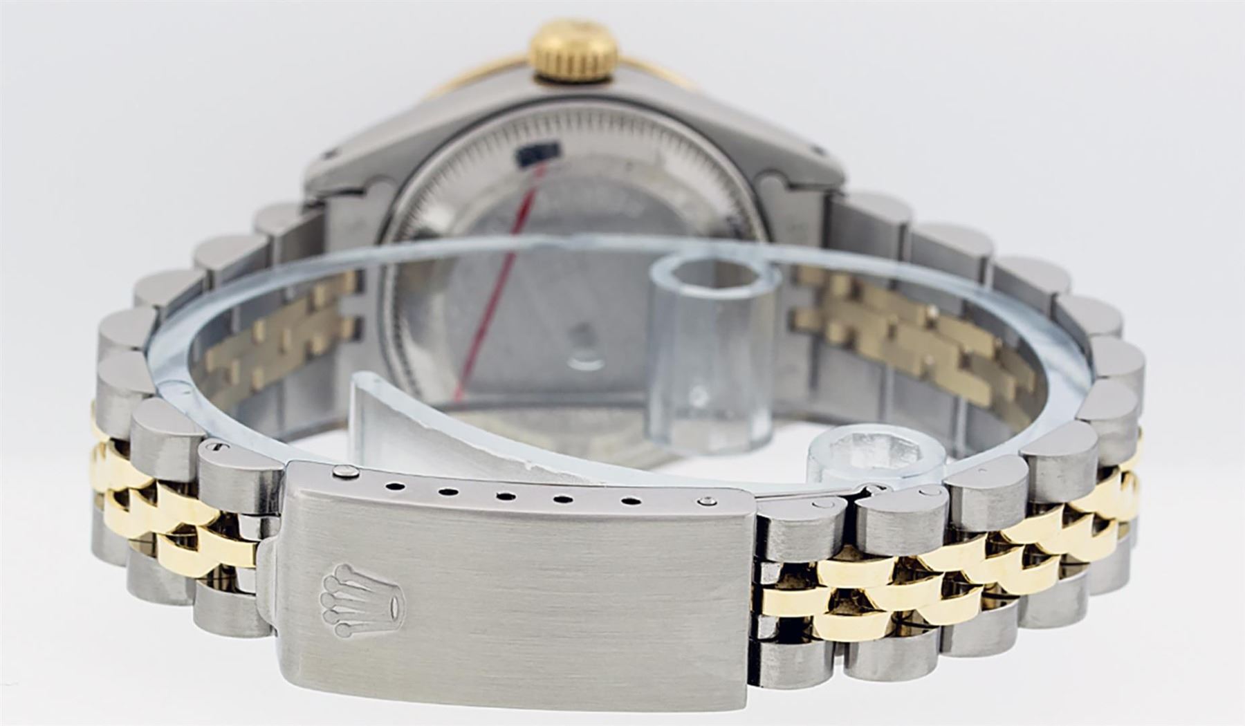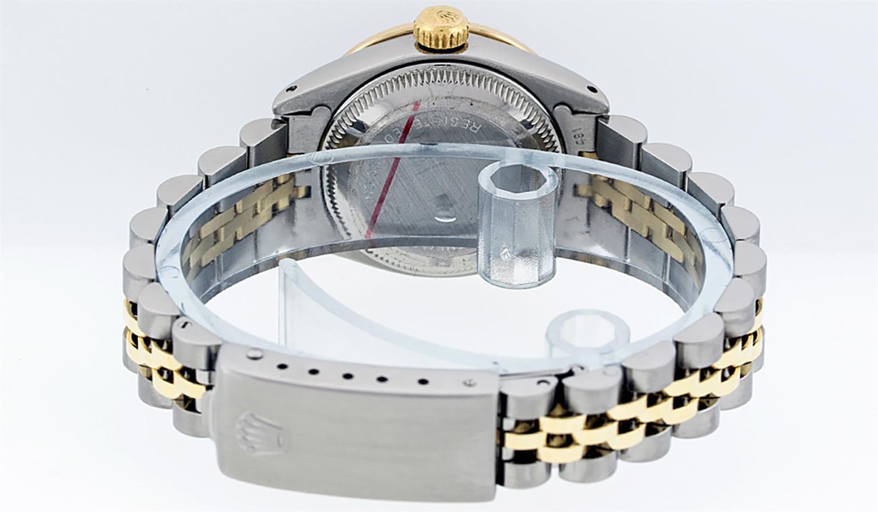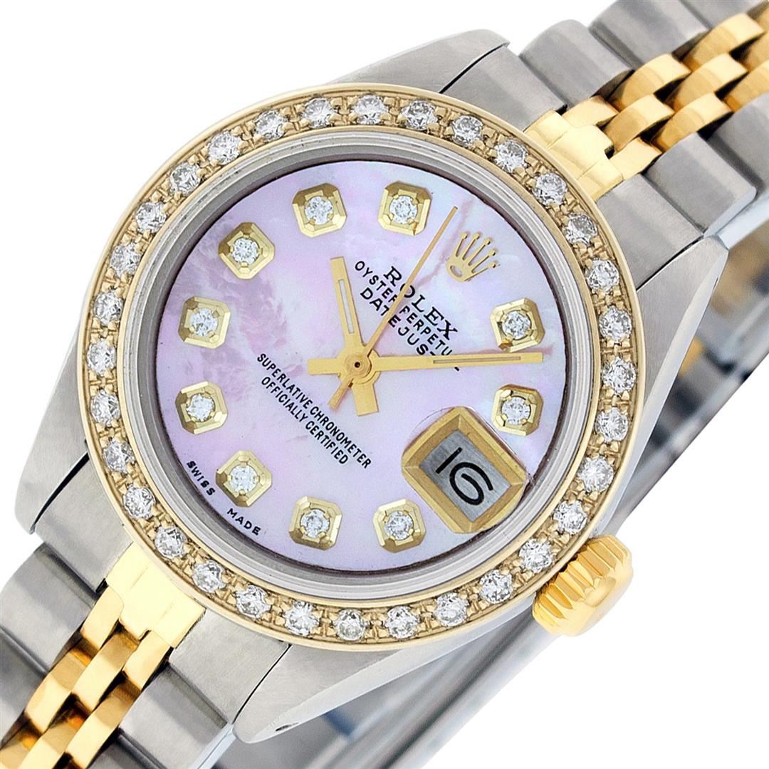 One Ladies Pre Owned Two Tone Rolex Datejust Polished, Serviced & Electronically Tested, Yellow Gold & Stainless Steel Case: 26mm, Yellow Gold Crown, Custom Bezel: New 18K Yellow Gold Beadset Diamond Bezel, Diamond Count: 32 Diamonds, Clarity: SI-VS, Color: G to H. Custom Crystal: New Sapphire With Date Window. Custom Hands: New Luminescent Hands. Rolex Movement: Automatic Winding Movement. Custom Dial: Pink Mother Of Pearl Diamond Dial, Diamond Count: 10 Diamonds in Dial, G To H In Color, VS Clarity. Date Window: 3 O'Clock Position Date Display, Model: Datejust, Condition: G-6 Extra Fine. Rolex Bracelet: Two Tone Yellow Gold & Stainless Steel Jubilee Band. Bright Polish. 6.0 Inch Length, Adjustable. Standard Clasp, With Rolex Logo. This Watch Has Been Serviced Time Tested And Is In Excellent Condition It Is Free Of All Scratches And Dents.