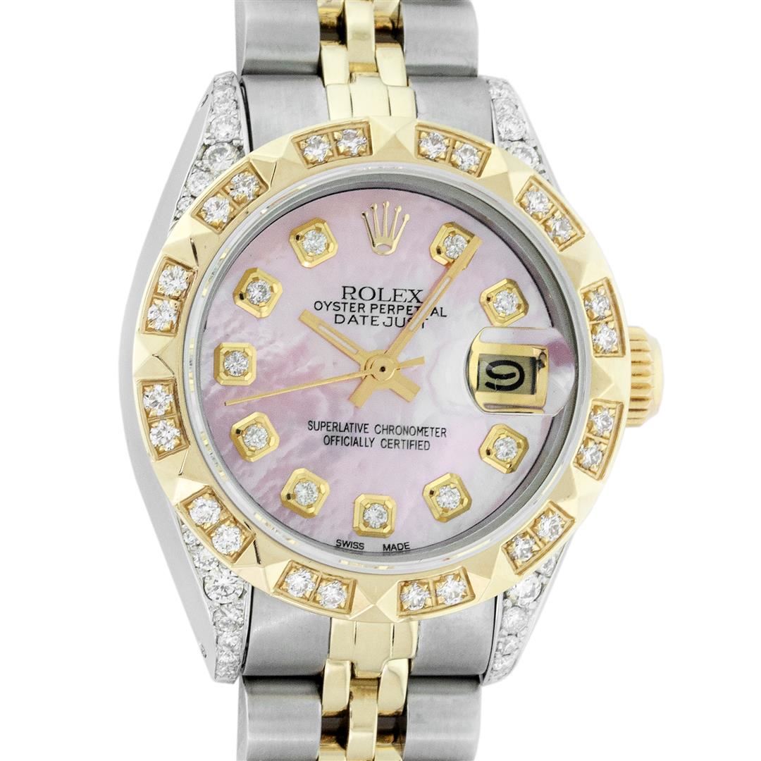 One Ladies Two Tone Rolex Datejust Polished, Serviced & Electronically Tested, Yellow Gold & Stainless Steel Case: 26mm, Yellow Gold Crown, Diamond Lugs: 24 Diamonds On Lugs, Clarity: SI-VS, Color: G to H. Custom Bezel: New 18K Yellow Gold Pyramid Diamond Bezel, Diamond Count: 24 Diamonds, Total Bezel Weight .50 Carat, Clarity: SI-VS, Color: G to H. Custom Crystal: New Scratch Resistant Synthetic Sapphire Cyclops Lens. Custom Hands: New Luminescent Hands. Movement: Automatic Winding Movement. Custom Dial: Pink Mother Of Pearl With Diamond Hour Markers, Diamond Count: 10 Diamonds In Dial, Clarity: SI-VS, Color: G to H. Date Window: 3 O'Clock Position Date Display, Model: Datejust. Condition: G-6 Extra Fine. Bracelet: Two Tone Yellow Gold & Stainless Steel Jubilee Band. Bright Polish. 6.0 Inch Length, Adjustable. Standard Clasp, With Rolex Logo. This Watch Has Been Serviced Time Tested And Is In Excellent Condition It Is Free Of All Scratches And Dents.