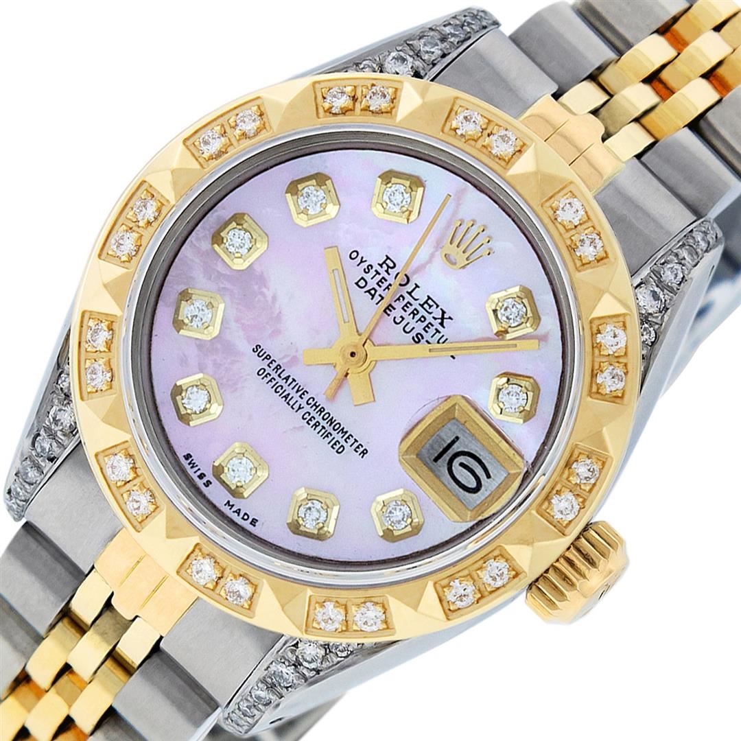 One Ladies Pre Owned Two Tone Rolex Datejust Polished, Serviced & Electronically Tested, Rolex Yellow Gold & Stainless Steel Case: 26mm, Rolex Yellow Gold Crown, Custom Diamond Lugs: 24 Diamonds On Lugs, Clarity: SI-VS, Color: G to H. Custom Bezel: New 18K Yellow Gold Pyramid Diamond Bezel, Diamond Count: 24 Diamonds, Clarity: SI-VS, Color: G to H. Custom Crystal: New Sapphire With Magnified Date Window. Custom Hands: New Luminescent Hands. Rolex Movement: Automatic Winding Movement. Custom Dial: Pink Mother Of Pearl With Diamond Hour Markers, Diamond Count: 10 Diamonds In Dial, Clarity: SI-VS, Color: G to H. Date Window: 3 O'Clock Position Date Display, Model: Datejust. Condition: G-6 Extra Fine. Rolex Bracelet: Two Tone Yellow Gold & Stainless Steel Jubilee Band. Bright Polish. 6.0 Inch Length, Adjustable. Standard Clasp, With Rolex Logo. This Watch Has Been Serviced Time Tested And Is In Excellent Condition It Is Free Of All Scratches And Dents.