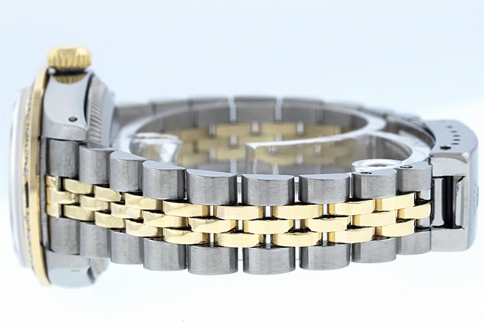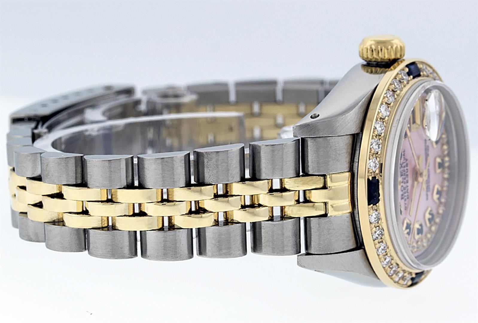 One Ladies Two Tone Rolex Datejust Polished, Serviced & Electronically Tested, Yellow Gold & Stainless Steel Case: 26mm, Yellow Gold Crown, Custom Bezel: New 18K Yellow Gold Sapphire Beadset Diamond Bezel, Diamond Count: 28 Diamonds + 4 Sapphires, Total Weight .70 Carat, Clarity: SI-VS, Color: G to H. Custom Crystal: New Synthetic Sapphire Cyclops Lens. Custom Hands: New Luminescent Hands. Movement: Automatic Winding Movement. Custom Dial: Pink Mother Of Pearl With Sapphire String Diamond Hour Markers. Stone Count: 10 Sapphires + 33 Diamonds In Dial, Clarity: SI-VS, Color: G to H. Date Window: 3 O'Clock Position Date Display, Model: Datejust. Condition: G-6 Extra Fine. Bracelet: Two Tone Yellow Gold & Stainless Steel Jubilee. Bright Polish. 6.0 Inch Length, Adjustable. Standard Clasp, With Rolex Logo. This Watch Has Been Serviced Time Tested And Is In Excellent Condition It Is Free Of All Scratches And Dents.