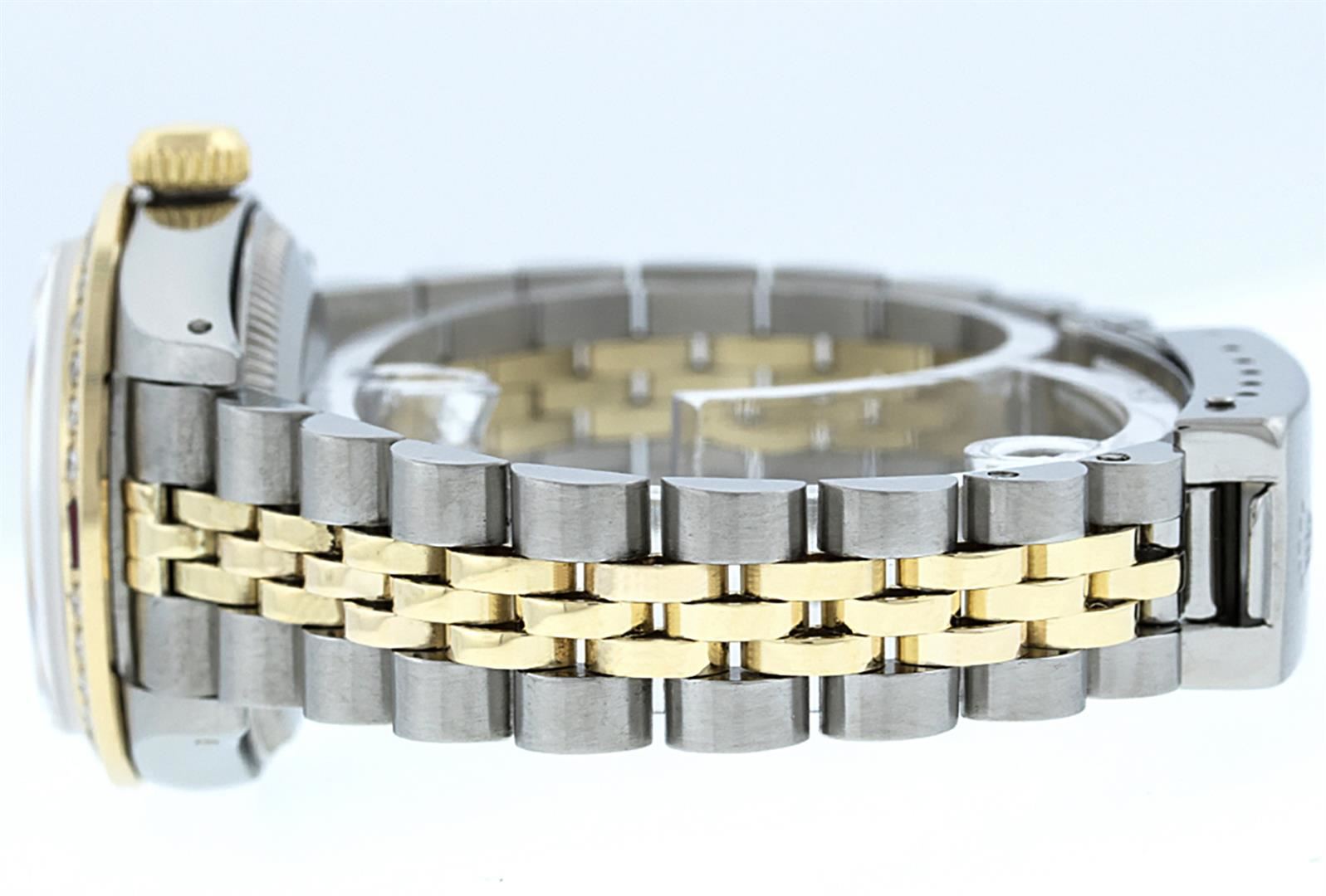 One Ladies Two Tone Rolex Datejust Polished, Serviced & Electronically Tested, Yellow Gold & Stainless Steel Case: 26mm, Yellow Gold Crown, Custom Bezel: New 18K Yellow Gold Ruby Beadset Diamond Bezel, Diamond Count: 28 Diamonds + 4 Rubies, Total Weight .70 Carat, Clarity: SI-VS, Color: G to H. Custom Crystal: New Scratch Resistant Synthetic Sapphire Cyclops Lens. Custom Hands: New Luminescent Hands. Movement: Automatic Winding Movement. Custom Dial: Pink Mother Of Pearl With Ruby String Diamond Hour Markers. Stone Count: 10 Rubies + 33 Diamonds In Dial, Clarity: SI-VS, Color: G to H. Date Window: 3 O'Clock Position Date Display, Model: Datejust. Condition: G-6 Extra Fine. Bracelet: Two Tone Yellow Gold & Stainless Steel Jubilee. Bright Polish. 6.0 Inch Length, Adjustable. Standard Clasp, With Rolex Logo. This Watch Has Been Serviced Time Tested And Is In Excellent Condition It Is Free Of All Scratches And Dents.