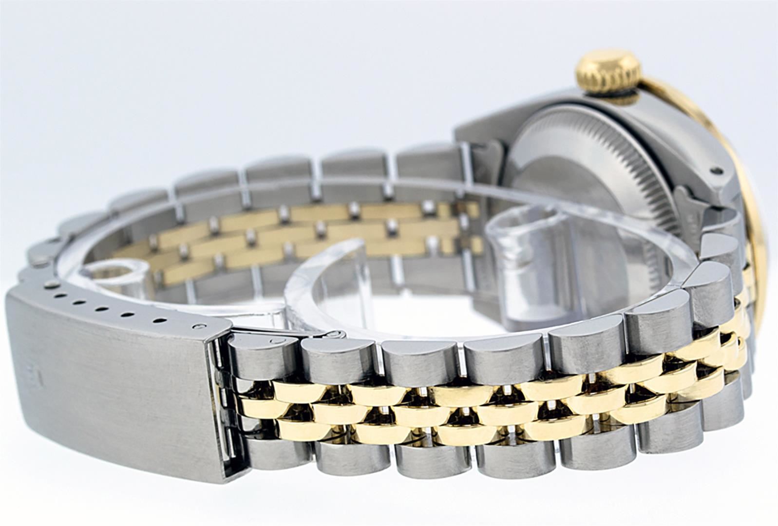 One Ladies Two Tone Rolex Datejust Polished, Serviced & Electronically Tested, Yellow Gold & Stainless Steel Case: 26mm, Yellow Gold Crown, Custom Bezel: New 18K New Yellow Gold Sapphire Beadset Diamond Bezel, Diamond Count: 28 Diamonds + 4 Sapphires In Dial, Total Weight .70 Carat, Clarity: SI-VS, Color: G to H. Custom Crystal: New Scratch Resistant Synthetic Sapphire Cyclops Lens. Custom Hands: New Luminescent Hands. Movement: Automatic Winding Movement. Custom Dial: Pink Mother Of Pearl Ruby String Diamond Dial, Stone Count: 10 Rubies + 33 Diamonds In Dial, Clarity: SI-VS, Color: G to H. Date Window: 3 O'Clock Position Date Display, Model: Datejust. Condition: G-6 Extra Fine. Bracelet: Two Tone Yellow Gold & Stainless Steel Jubilee Band. Bright Polish. 6.0 Inch Length, Adjustable. Standard Clasp, With Rolex Logo. This Watch Has Been Serviced Time Tested And Is In Excellent Condition It Is Free Of All Scratches And Dents.