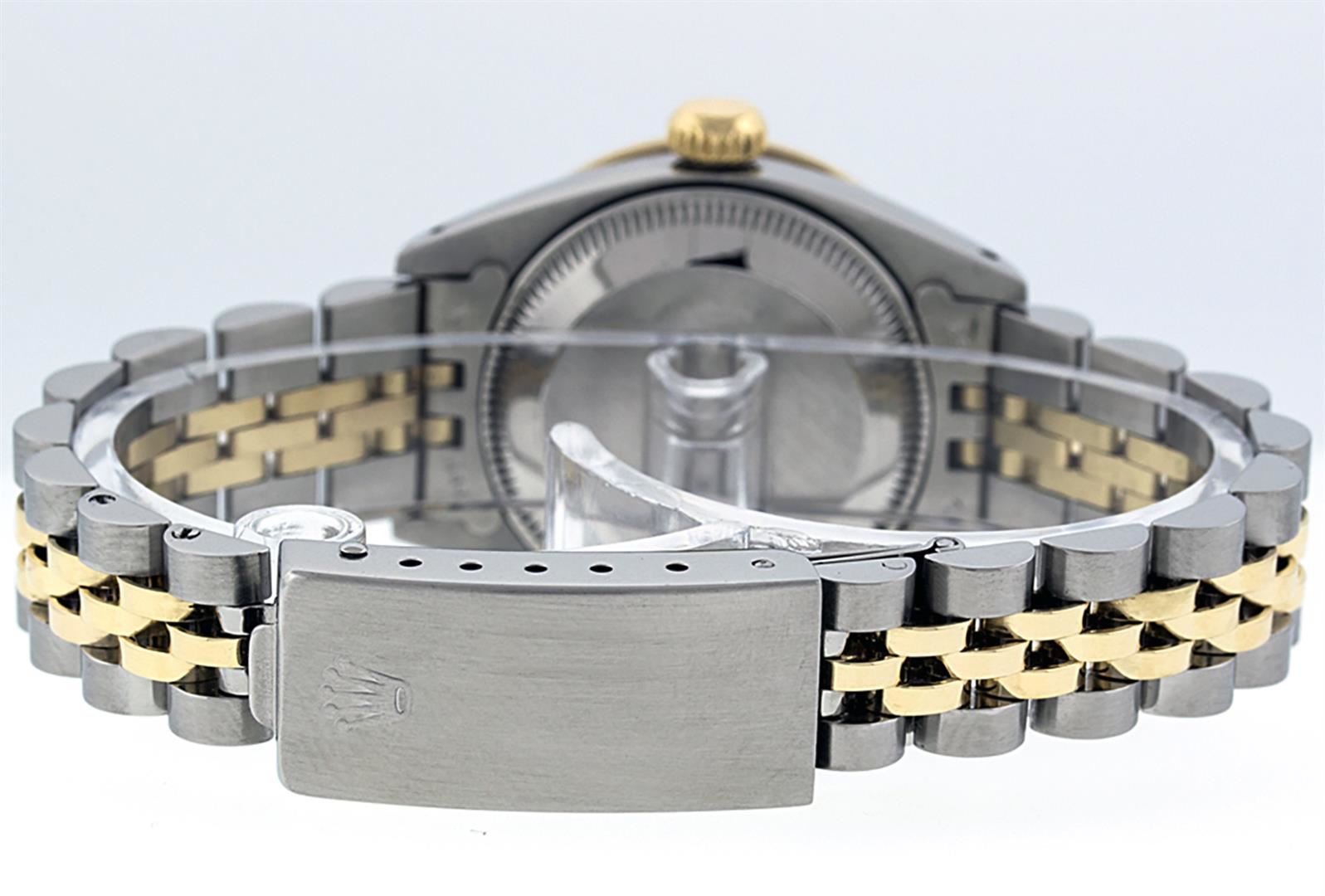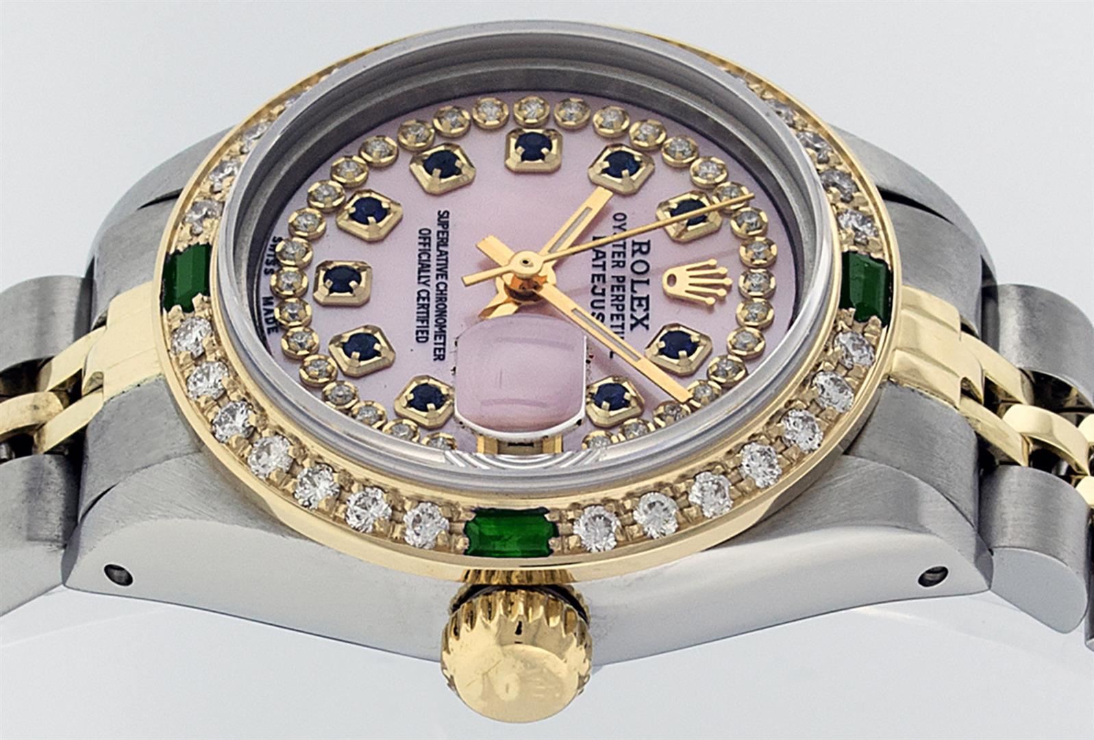 One Ladies Pre Owned Two Tone Rolex Datejust Polished, Serviced & Electronically Tested, Yellow Gold & Stainless Steel Case: 26mm, Yellow Gold Crown, Custom Bezel: New 18K New Yellow Gold Emerald Beadset Diamond Bezel, Diamond Count: 28 Diamonds + 4 Emera