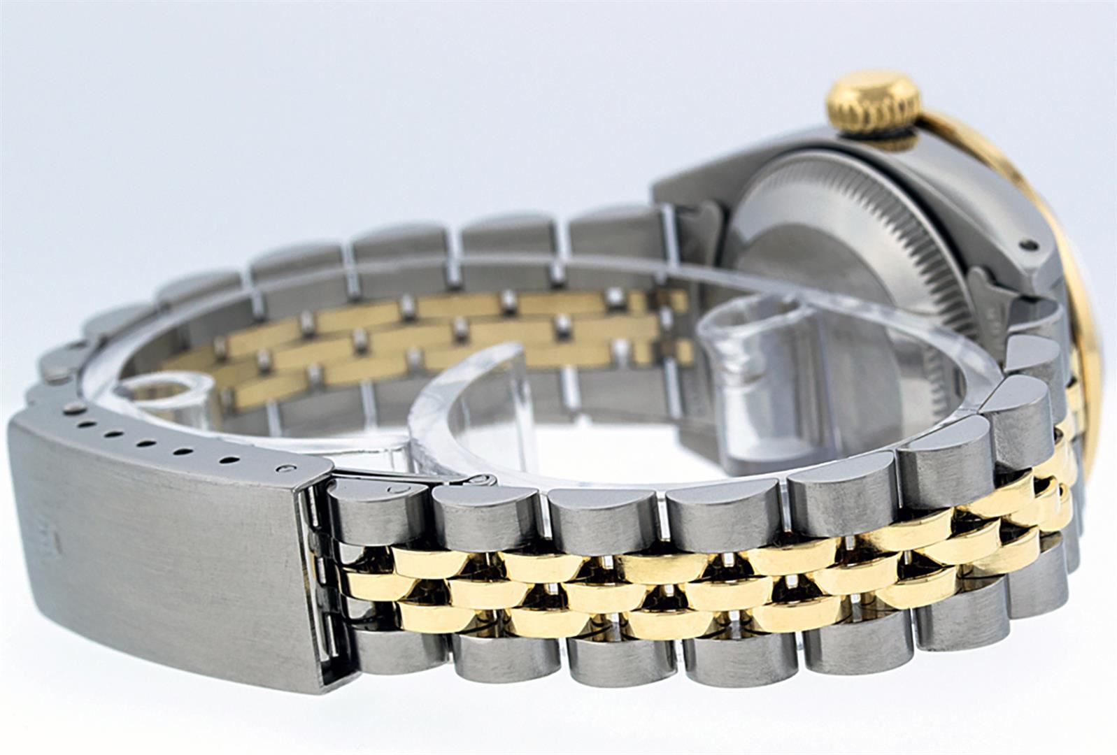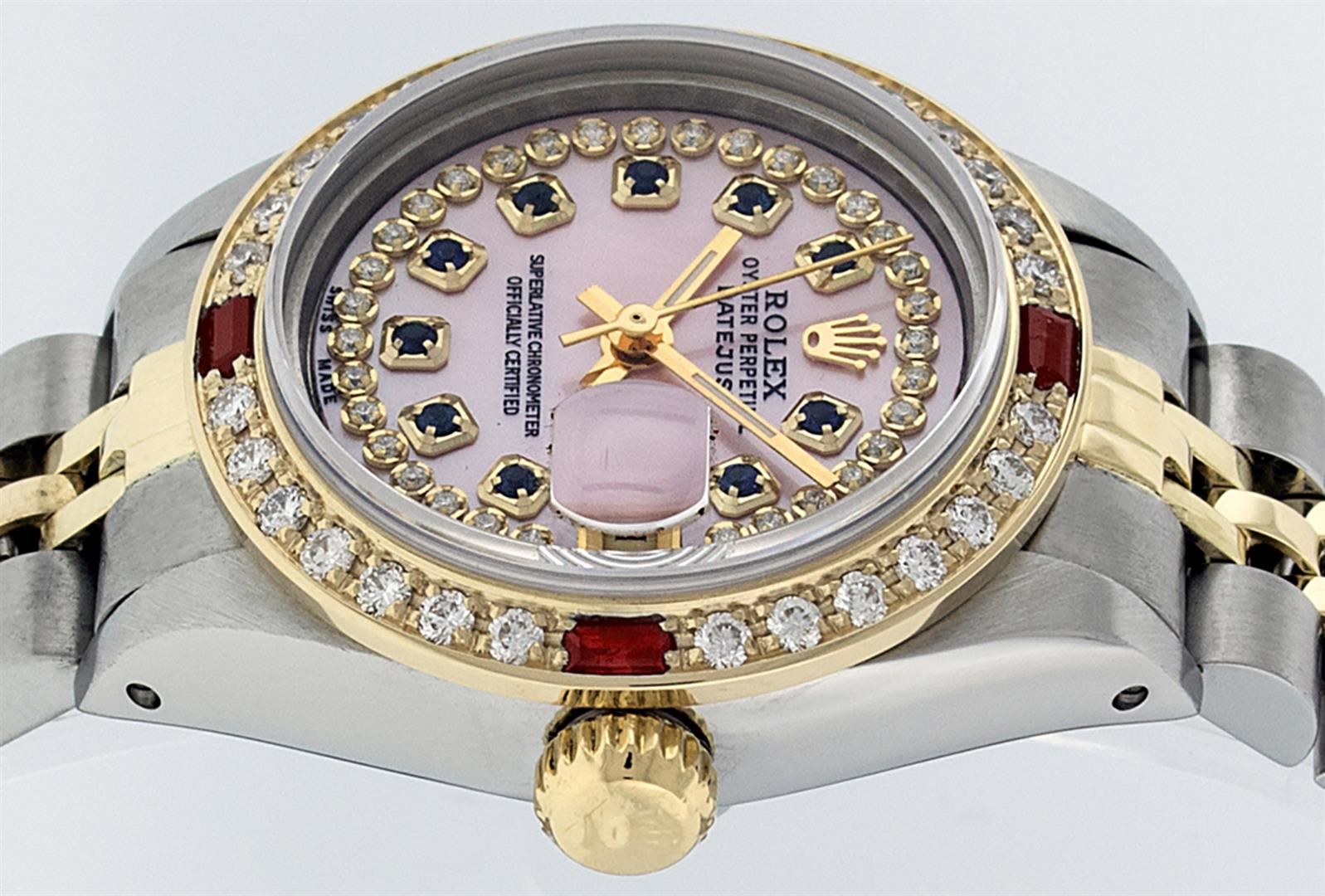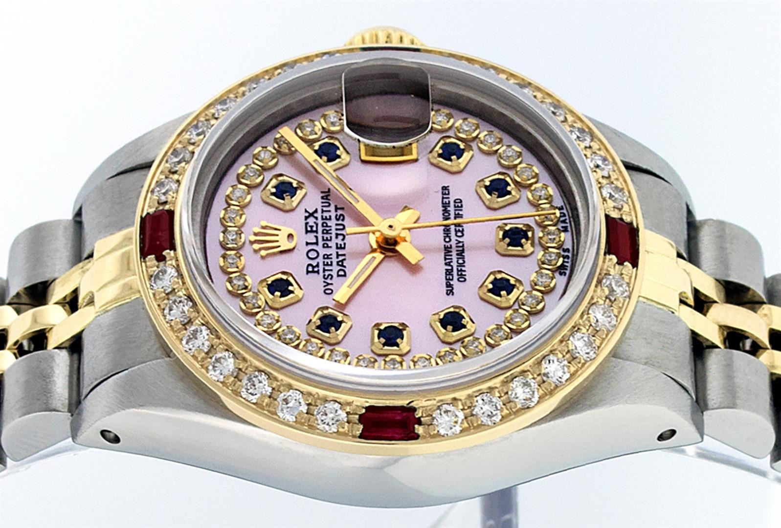 One Ladies Pre Owned Two Tone Rolex Datejust Polished, Serviced & Electronically Tested, Yellow Gold & Stainless Steel Case: 26mm, Yellow Gold Crown, Custom Bezel: New 18K New Yellow Gold Ruby Beadset Diamond Bezel, Diamond Count: 28 Diamonds + 4 Rubies I