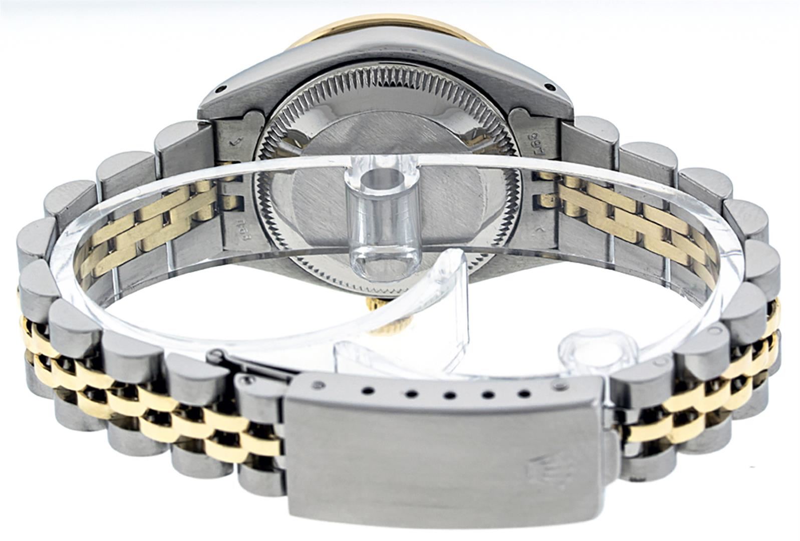One Ladies Pre Owned Two Tone Rolex Datejust Polished, Serviced & Electronically Tested, Yellow Gold & Stainless Steel Case: 26mm, Yellow Gold Crown, Custom Bezel: New 18K New Yellow Gold Ruby Beadset Diamond Bezel, Diamond Count: 28 Diamonds + 4 Rubies I